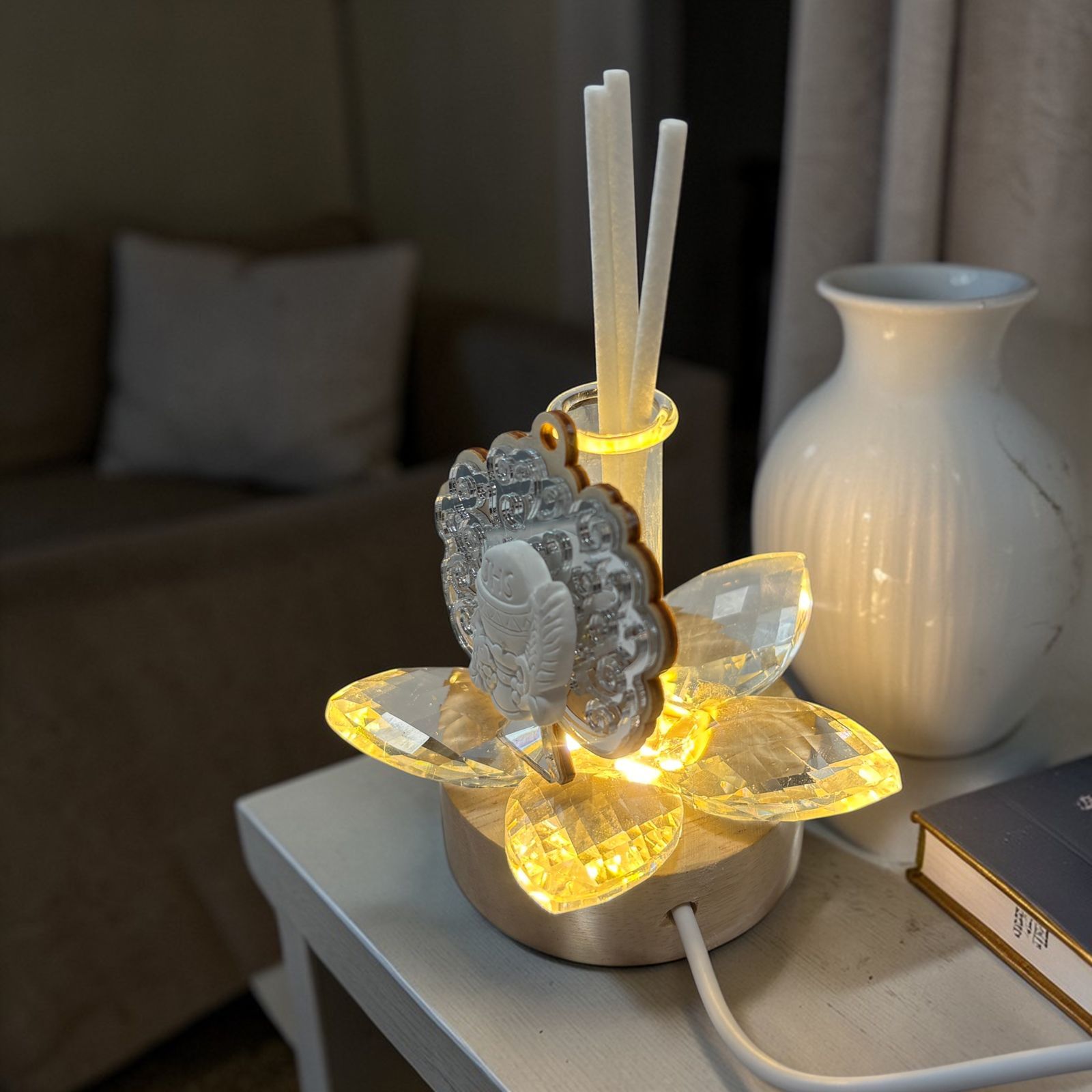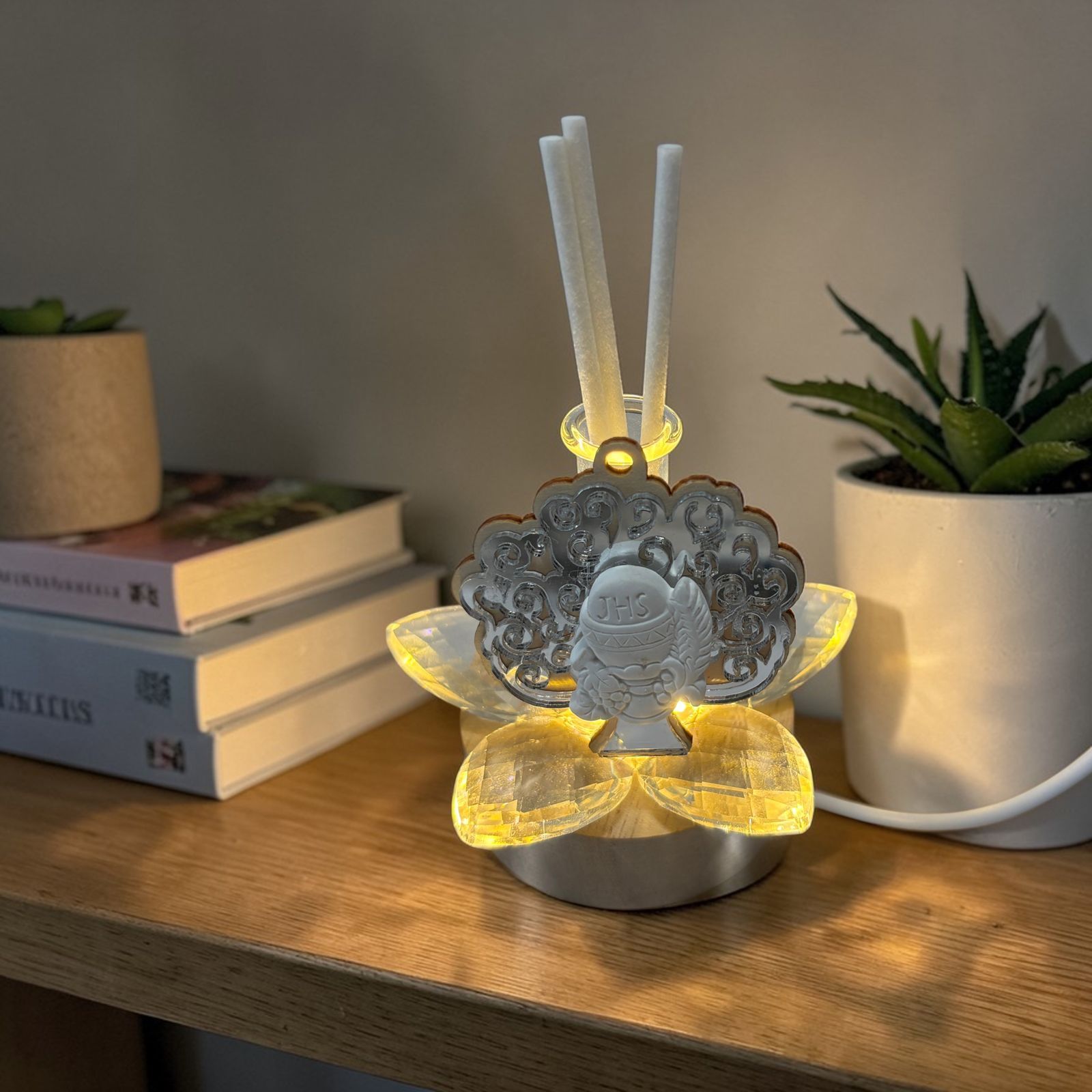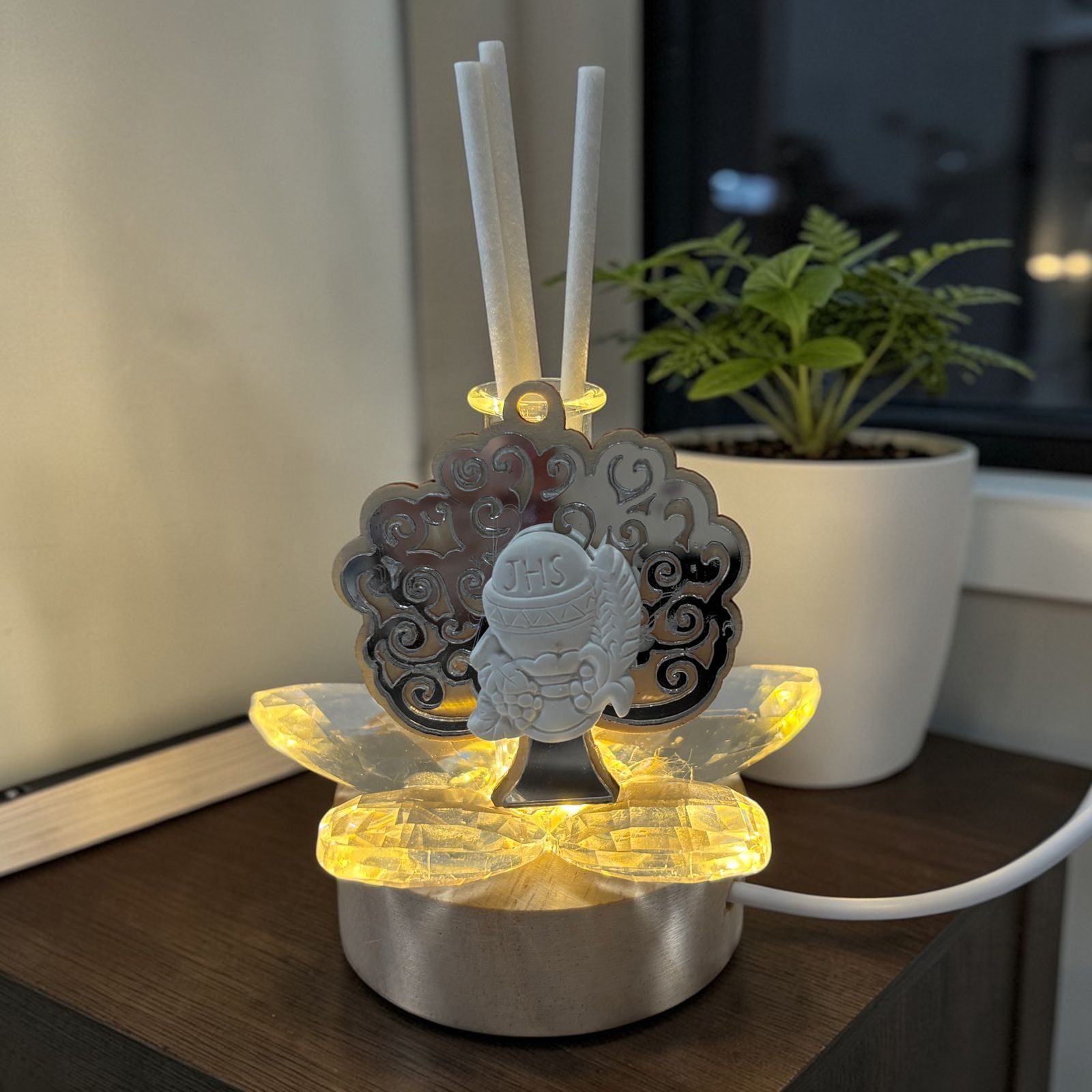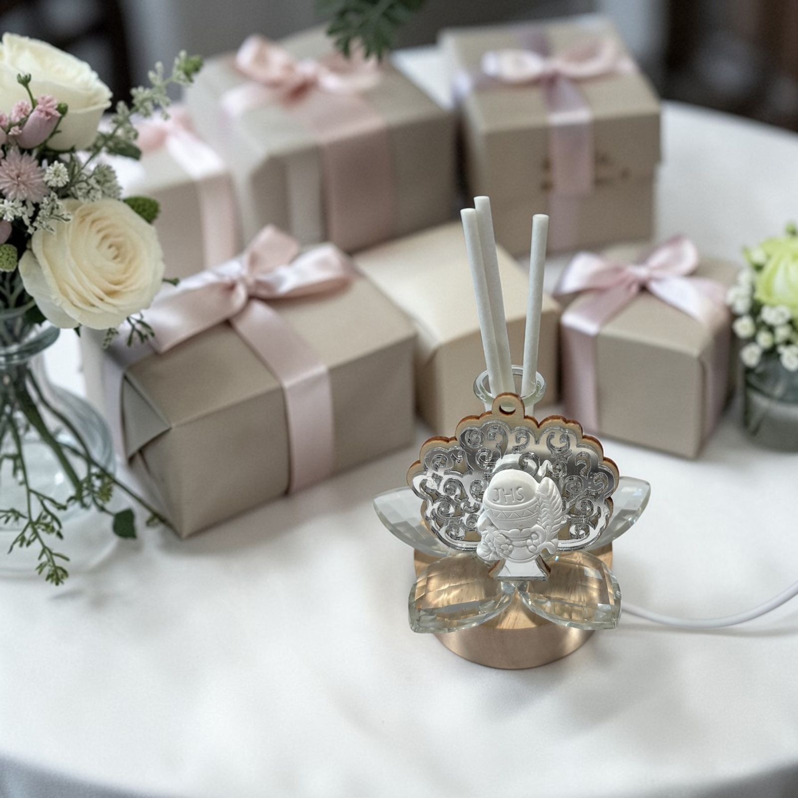 Per la prima comunione scegli una bomboniera che unisca eleganza e spiritualità. Questa lampada LED con profumatore e fiore in cristallo illumina l’albero della vita color argento con calice ed ostia, creando riflessi delicati che faranno brillare ogni dettaglio davanti agli occhi dei tuoi invitati.