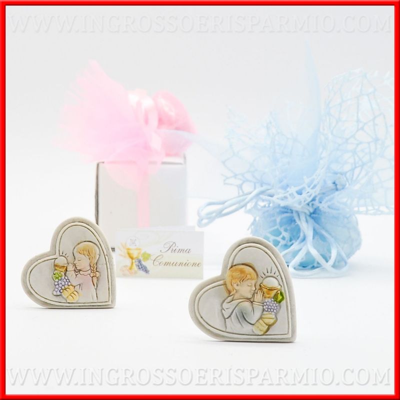 Bomboniere sacre comunione, mini quadretti in resina a forma di cuore con rappresentazione centrale di un bambino od una bambina con mani giunte, in preghiera, di fronte ad un calice con ostia, simboli sacri della prima comunione.