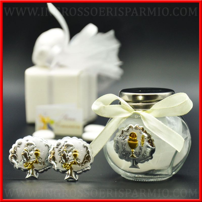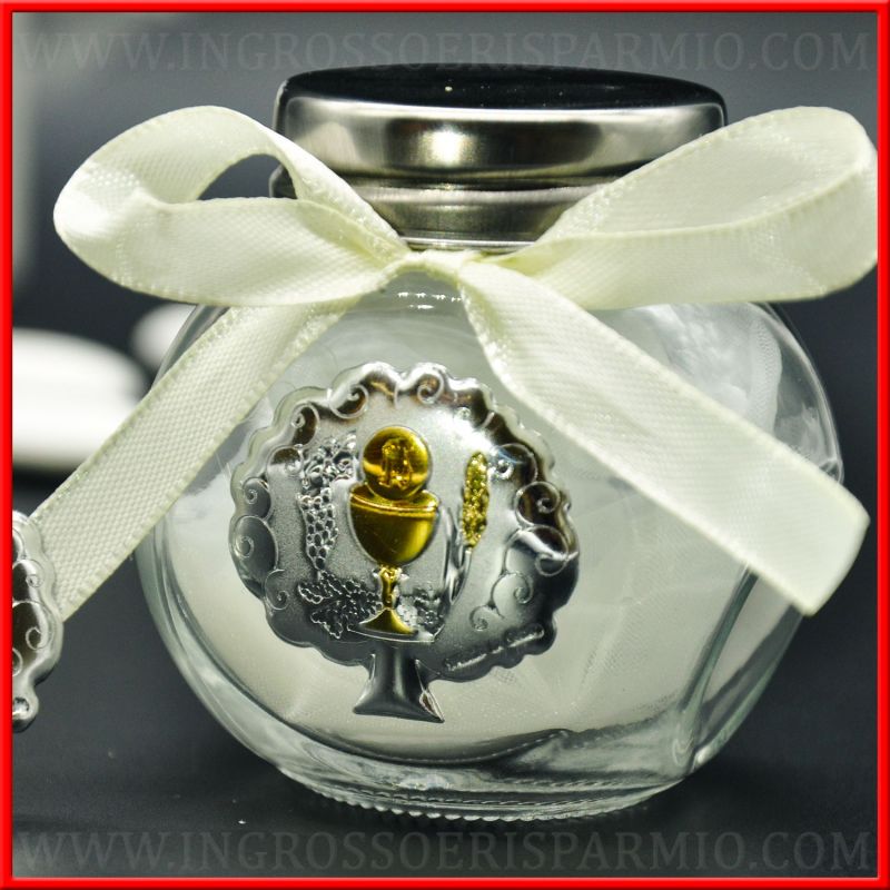 Barattoli decorati con piastra in metallo color argento a forma di albero della vita con simboli comunione. Hai la possibilità di scegliere tra ben 3 applicazioni differenti: