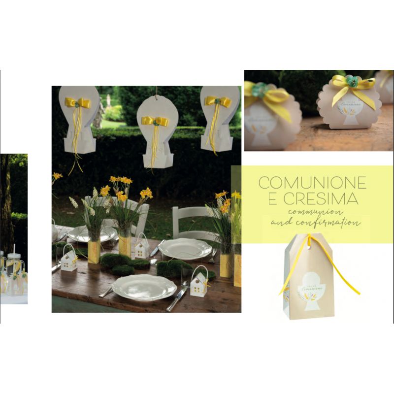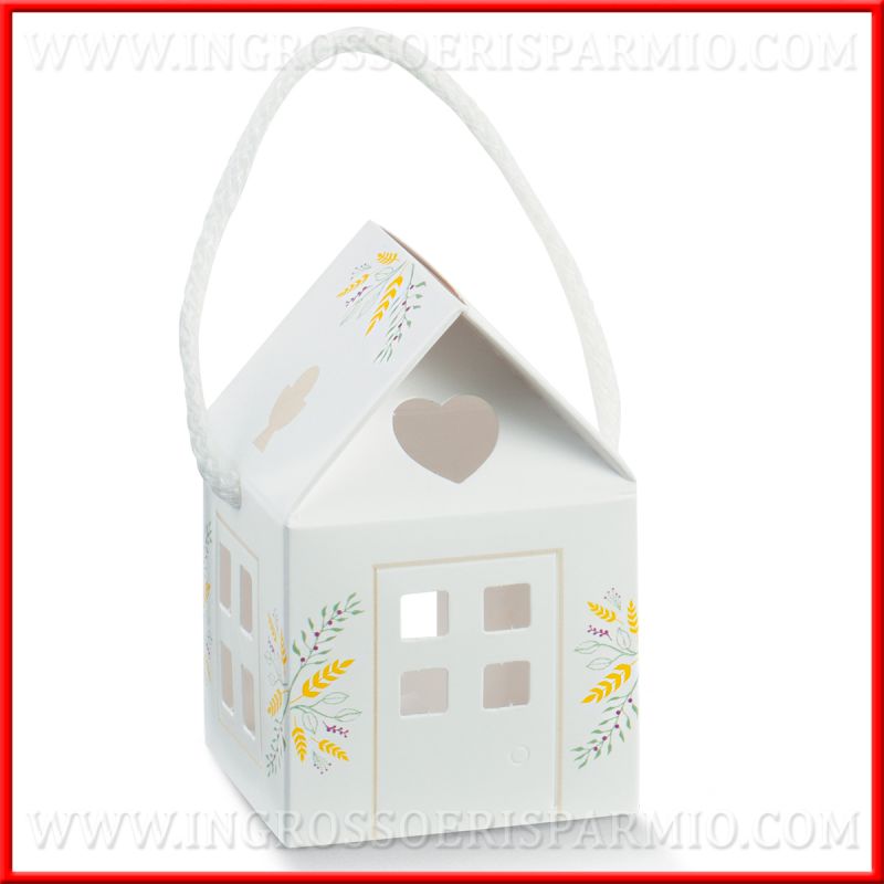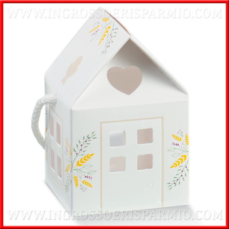 Casetta portaconfetti in cartoncino bianco lucido, completa di cordoncino bianco, con finestrelle intagliate sui 4 lati, decorata da spighe di grano e ramoscelli di ulivo. Sulle parti laterali del tetto del portaconfetti Comunione, è disegnata la sagoma del calice ed ostia color avorio, mentre sui due fronti sono intagliati dei cuori.