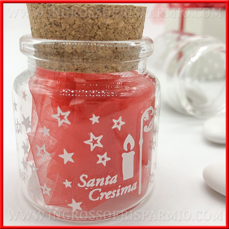 Realizza una originale confettata in occasione della cresima, acquistando questi barattolini portaconfetti, realizzati nello specifico per questo sacramento: i mini barattoli vetro con tappo in sughero riportano, infatti, la scritta "Santa Cresima" con il disegno si una candela e del bastone del vescovo e sono decorati interamente da stelline. La stampa bianca, neutra, permette di utilizzare i vasetti sia per bomboniere cresima femmina che maschio.