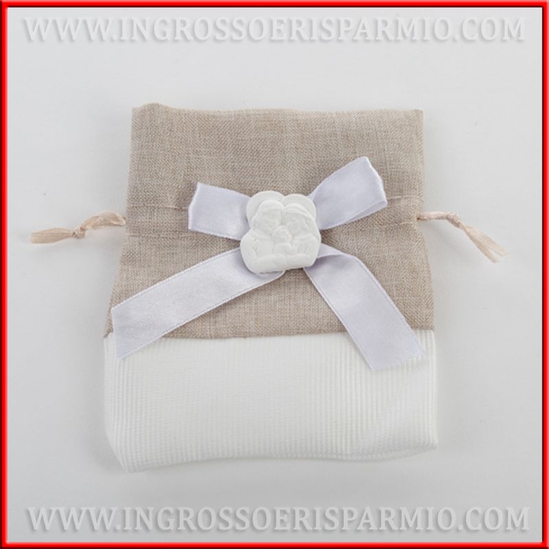 Sacchetto per confetti in cotone bicolore, bianco e tortora / avana, decorati con fiocco in raso bianco e applicazione di un gessetto bomboniera Sacra Famiglia. Apertura / chiusura semplificata con tiranti laterali.
