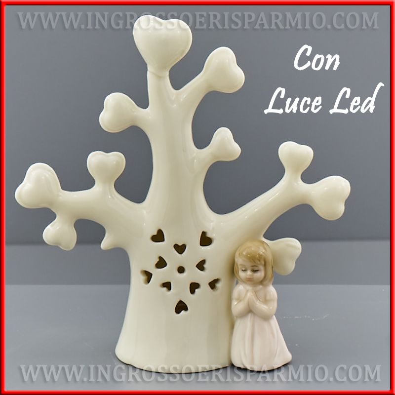 Statuetta in ceramica bianca a forma di albero della vita con intaglio centrale, per il passaggio della luce LED presente al suo interno. Accanto all'albero in ceramica è posta la figura di una bimba inginocchiata, a mani giunte, in preghiera: questa raffigurazione rende le bomboniere albero della vita specifiche per sacramenti come comunione o confessione o cresima femminuccia.