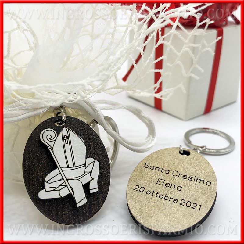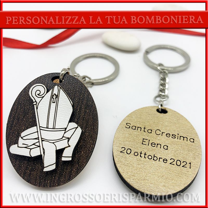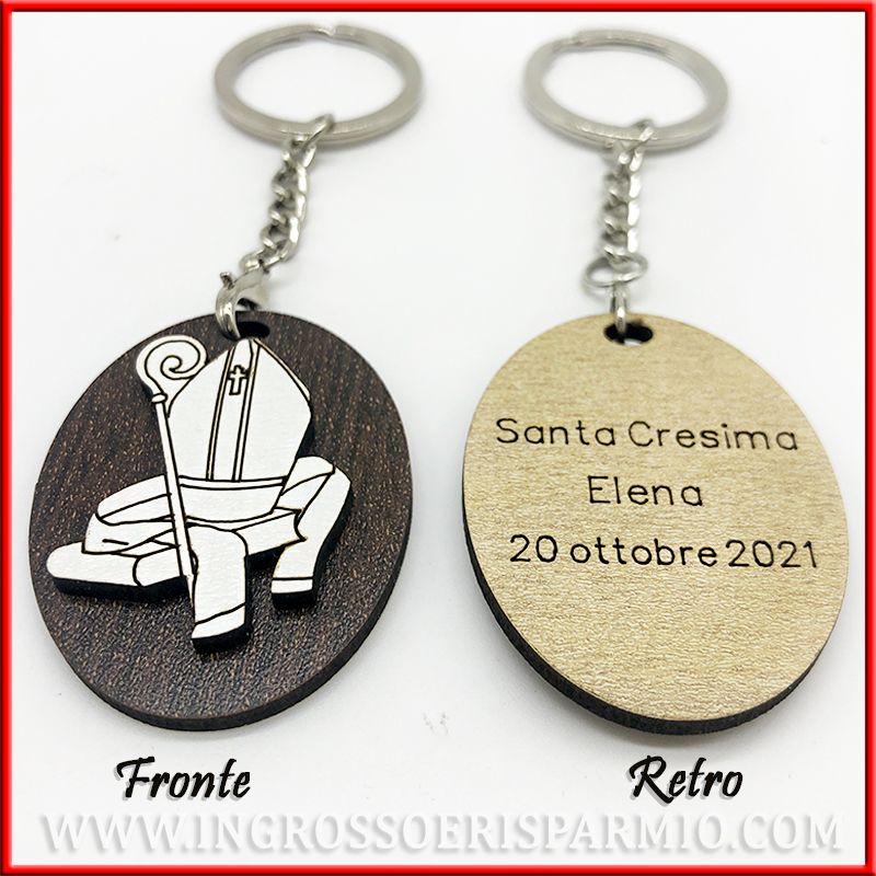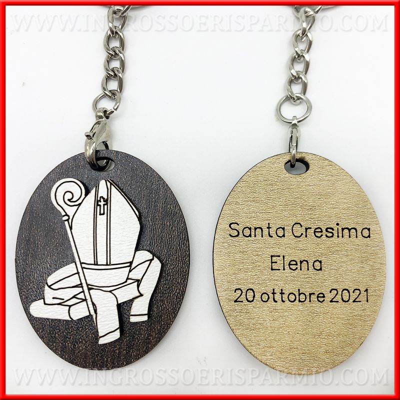 Portachiavi Cresima con ciondolo interamente realizzato in legno, con base ovale e applicazione in legno bianco dell'immagine sacra della santa cresima, ossia Mitra e bastone Vescovo.