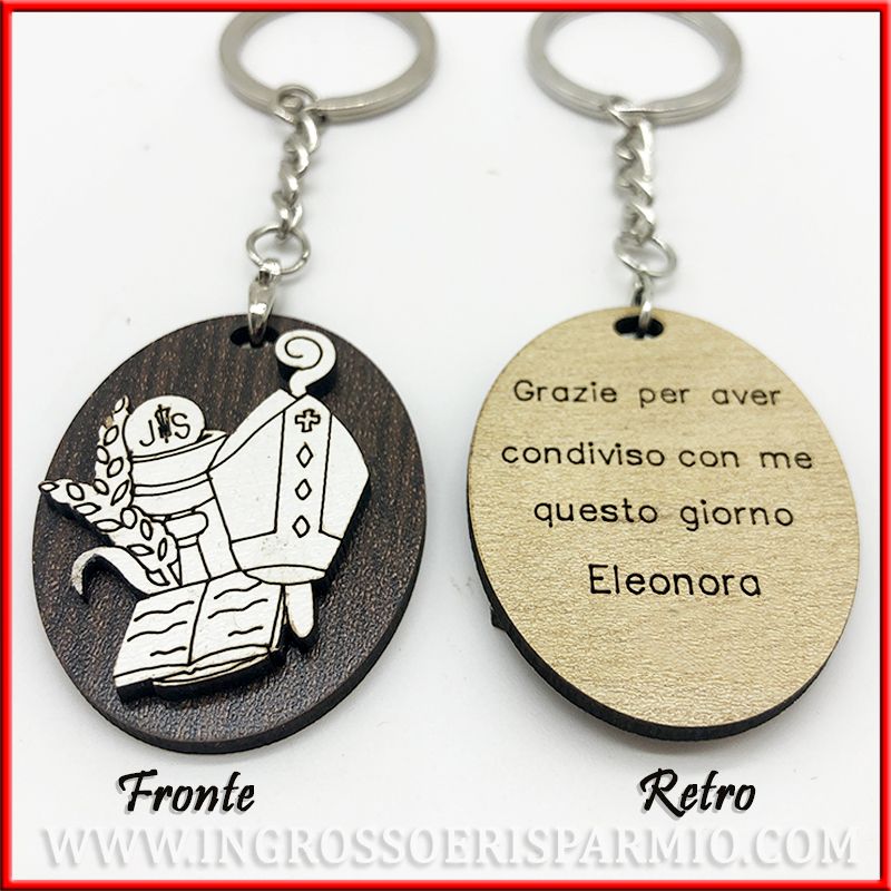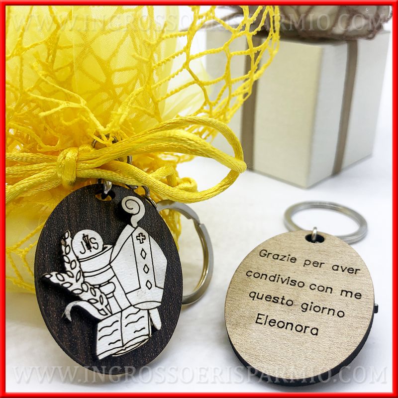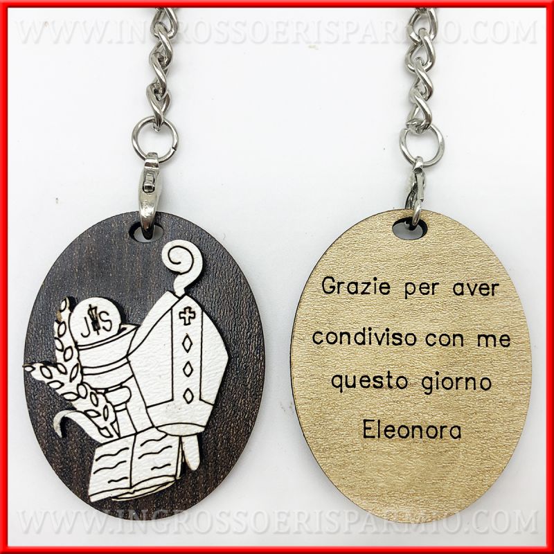 Portachiavi legno con raffigurazione del calice con ostia (simboli comunione) e cappello e bastone vescovo (per cresima) con Vangelo.