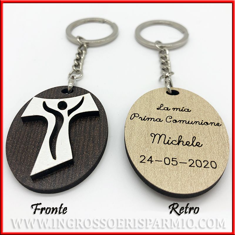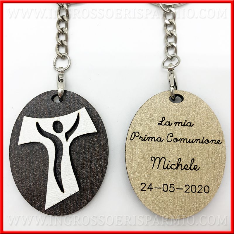 Portachiavi tau legno con INCISIONE PERSONALIZZATA: il ciondolo del portachiavi si compone di una base ovale sul retro della quale è possibile incidere NOME E DATA o EVENTO E NOME.