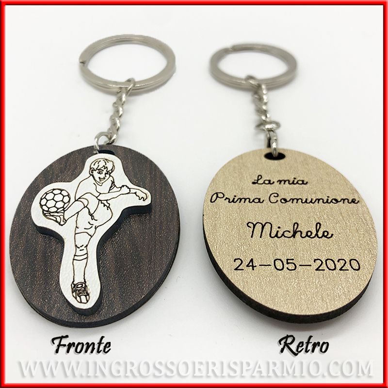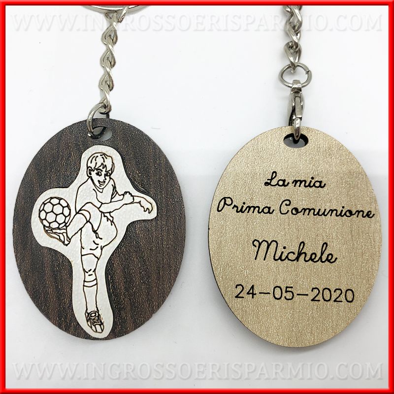 Portachiavi in legno con incisione: ciondolo ovale con applicazione calciatore in legno bianco, personalizzabile attraverso un'incisione sul retro del portachiavi, dove potrai indicare il nome del bimbo e la data dell'evento.