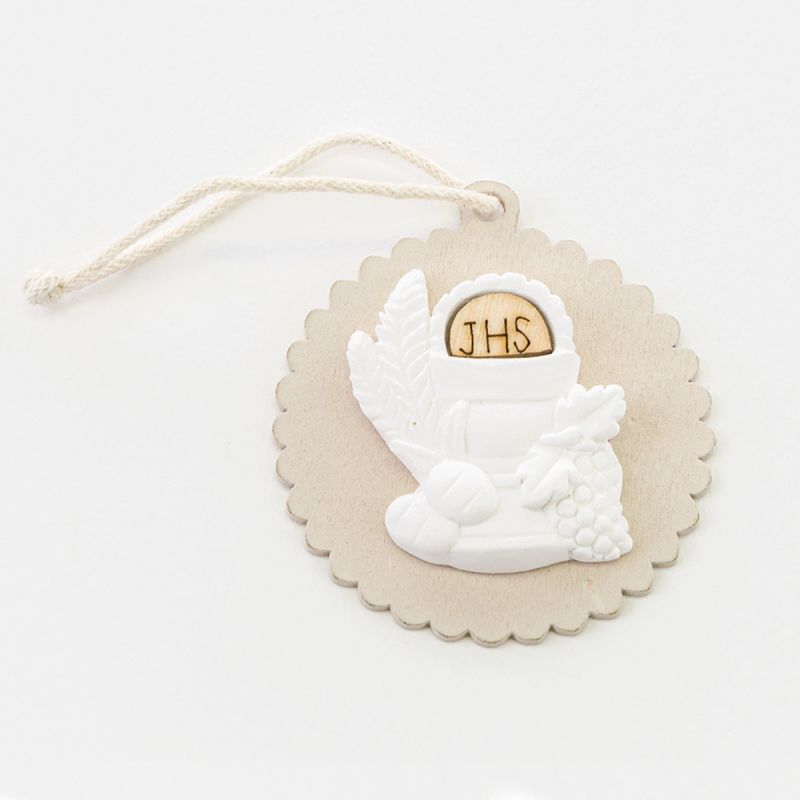 Diverso dal classico oggettino, quest'applicazione è realizzata in legno a forma di medaglione con un gessetto bianco centrale che rappresenta tutti i simboli sacri della comunione e un piccolo semicerchio ligneo con l'incisione "JHS". Al di sopra, sulla struttura in legno, è presente un piccolo foro con un cordoncino beige per poter agganciare l'appendino.