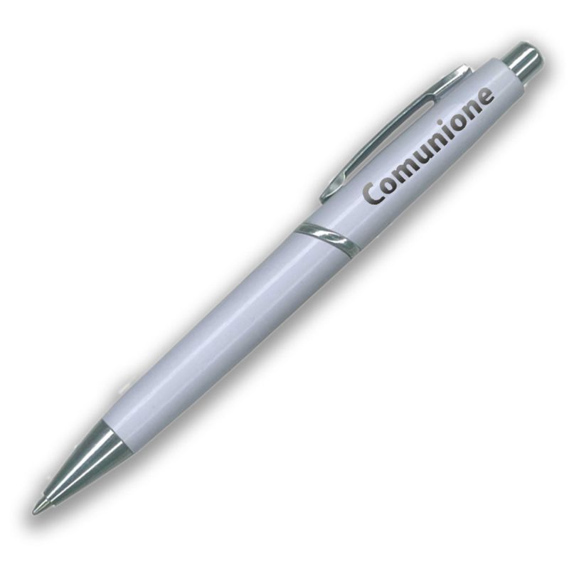 Ti presentiamo le nostre penne a sfera, un oggetto funzionale ed elegante. Realizzate nella colorazione bianca e quindi utilizzabili sia per bambino che per bambina, riportano dettagli in metallo e la stampa nella parte superiore in una delicata tonalità argento della scritta "Comunione". L'apertura è a click e l'inchiostro presente di colore nero.