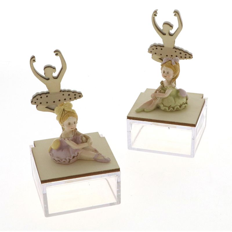 Ti presentiamo le nostre scatole in pvc trasparente, a base quadrata, con coperchio in legno su cui sono poggiate due ballerine: una intagliata in legno e l'altra in resina. Le scatoline sono in due modelli assortiti per colore e non selezionabili di una sola tipologia.