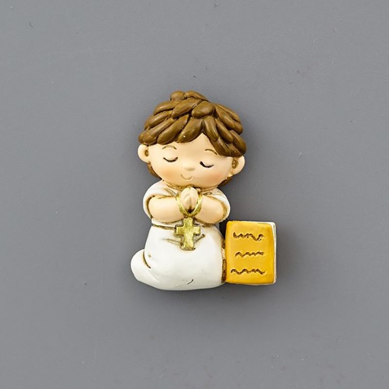 Eccoti le nostre calamite a forma di angioletto rappresentato come un bimbo in preghiera con un rosario tra le mani e un piccolo libro alla base.