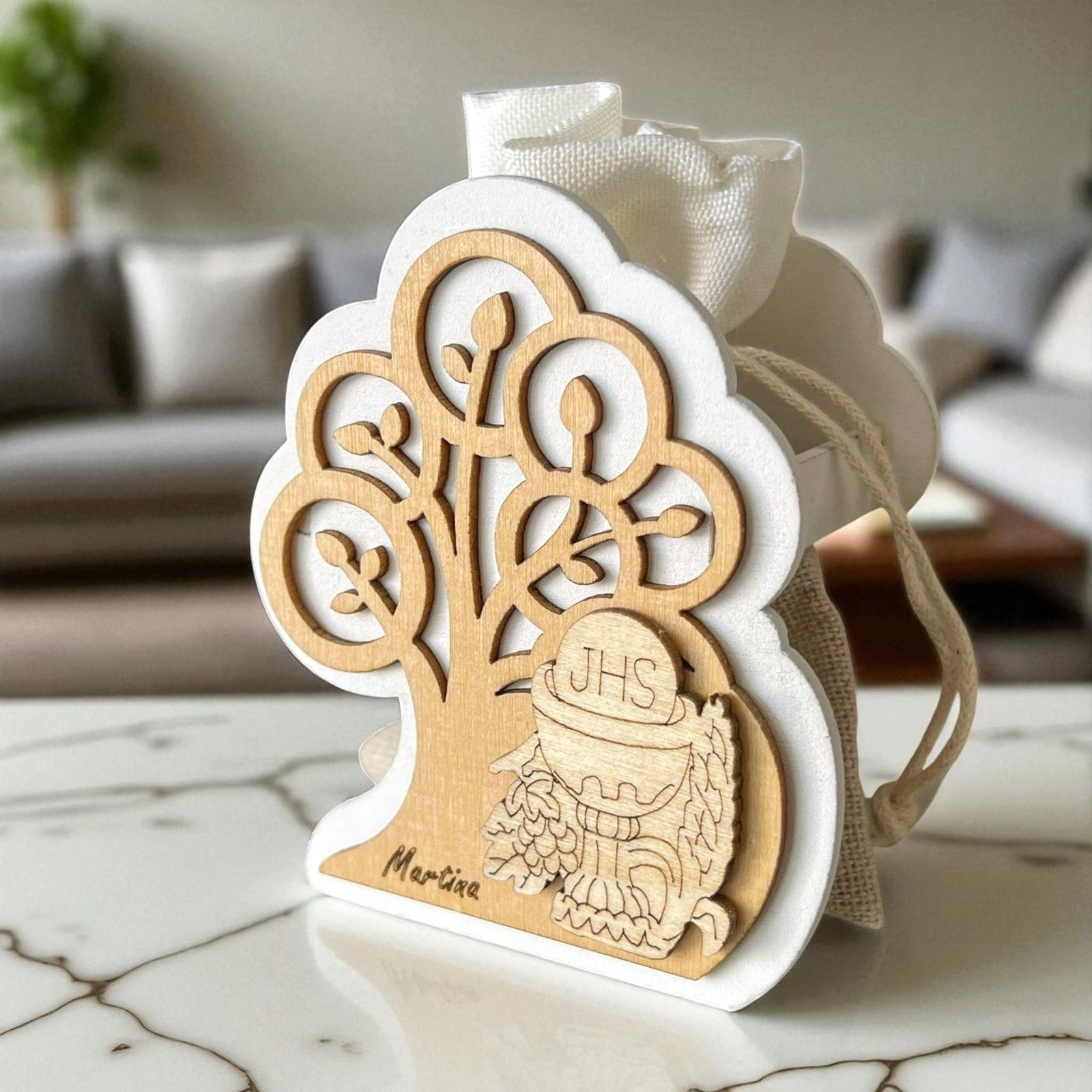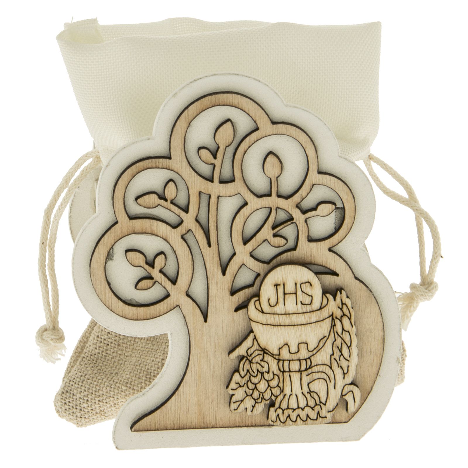 Scatoline aperte in legno decorate con l'albero della vita e, accanto al tronco, il calice con i simboli sacri della Comunione. All'interno troverai un sacchetto in iuta e cotone con pratici tiranti per la chiusura, pronto per accogliere i confetti.