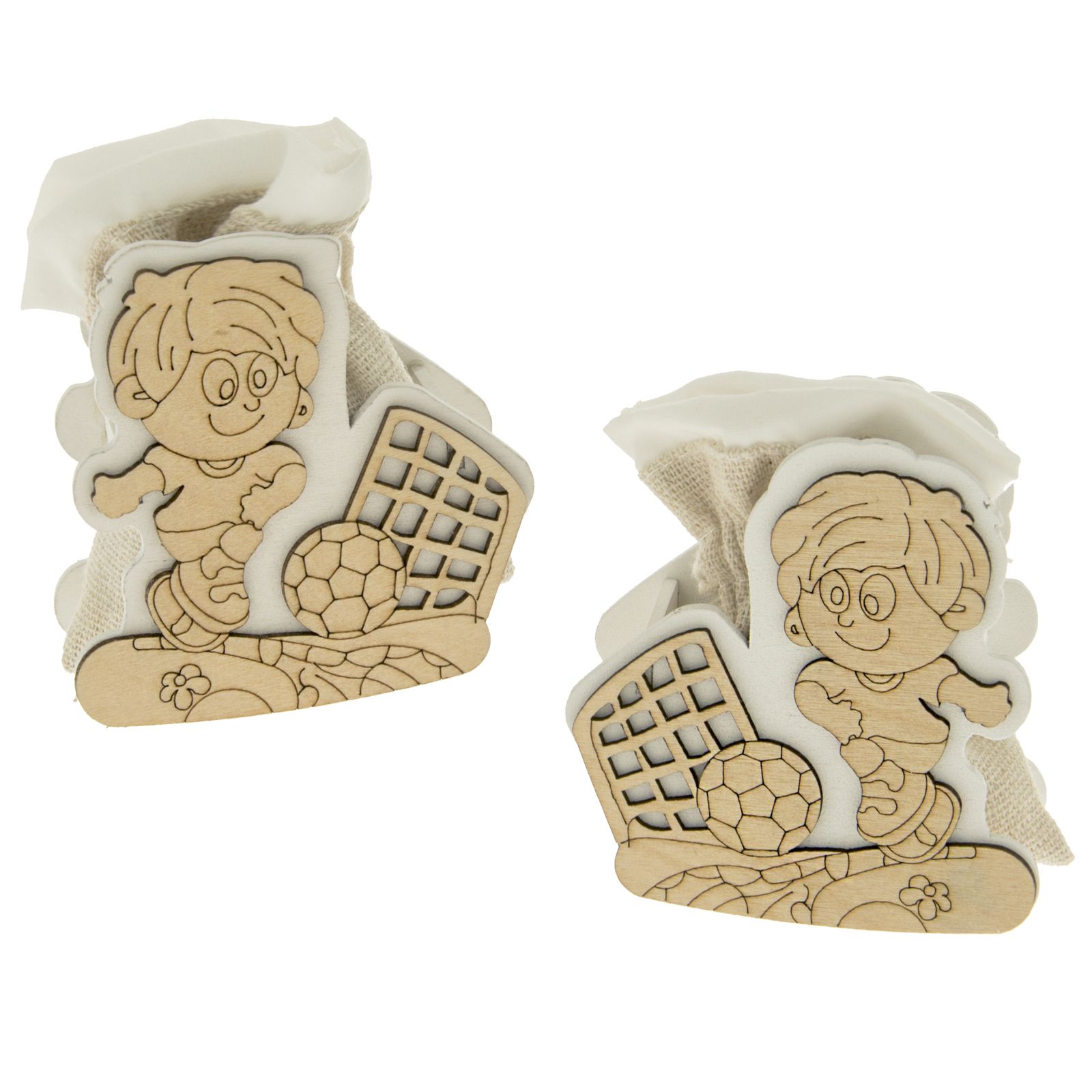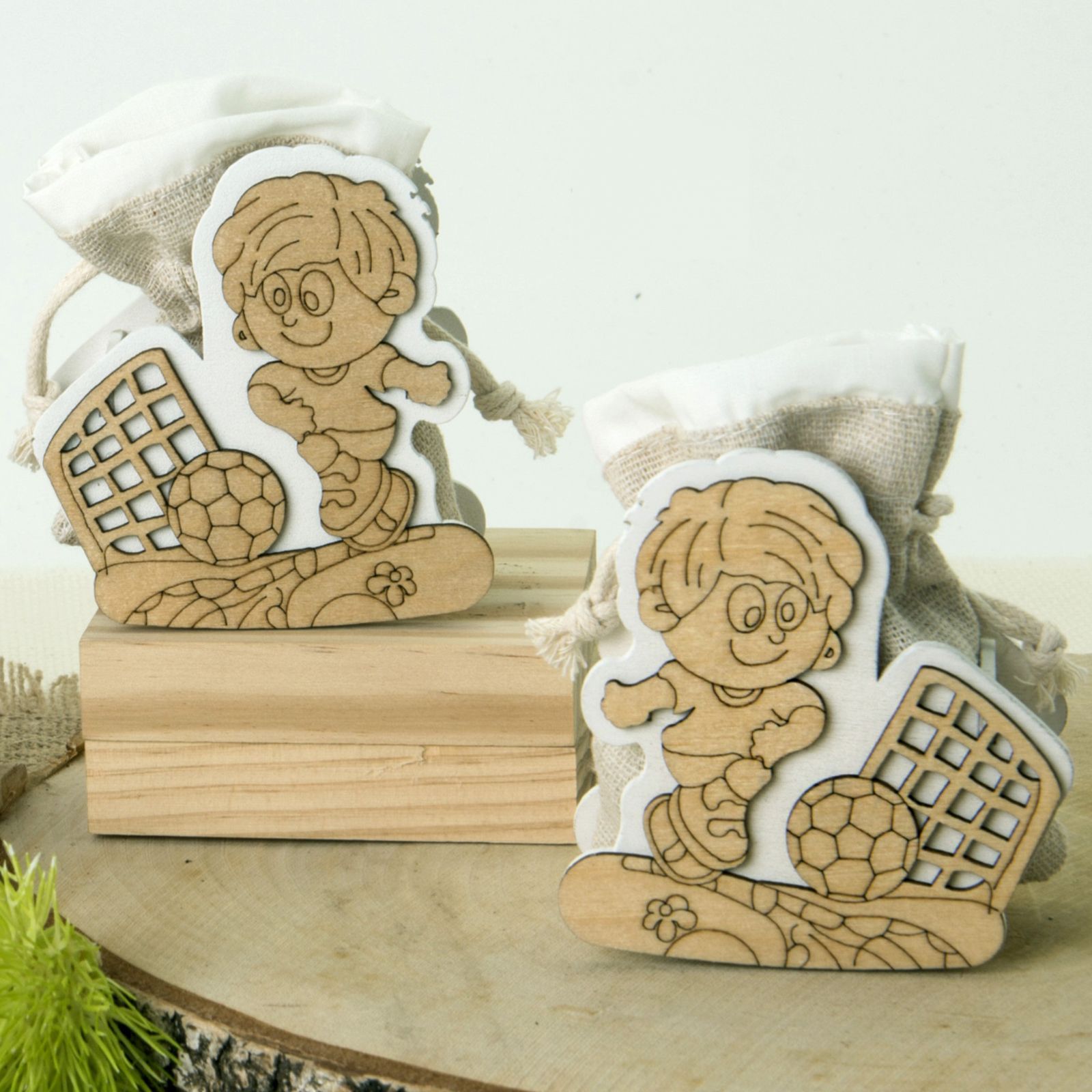 Scatoline aperte in legno con raffigurato un bambino in divisa da calciatore che corre verso la rete con un pallone.