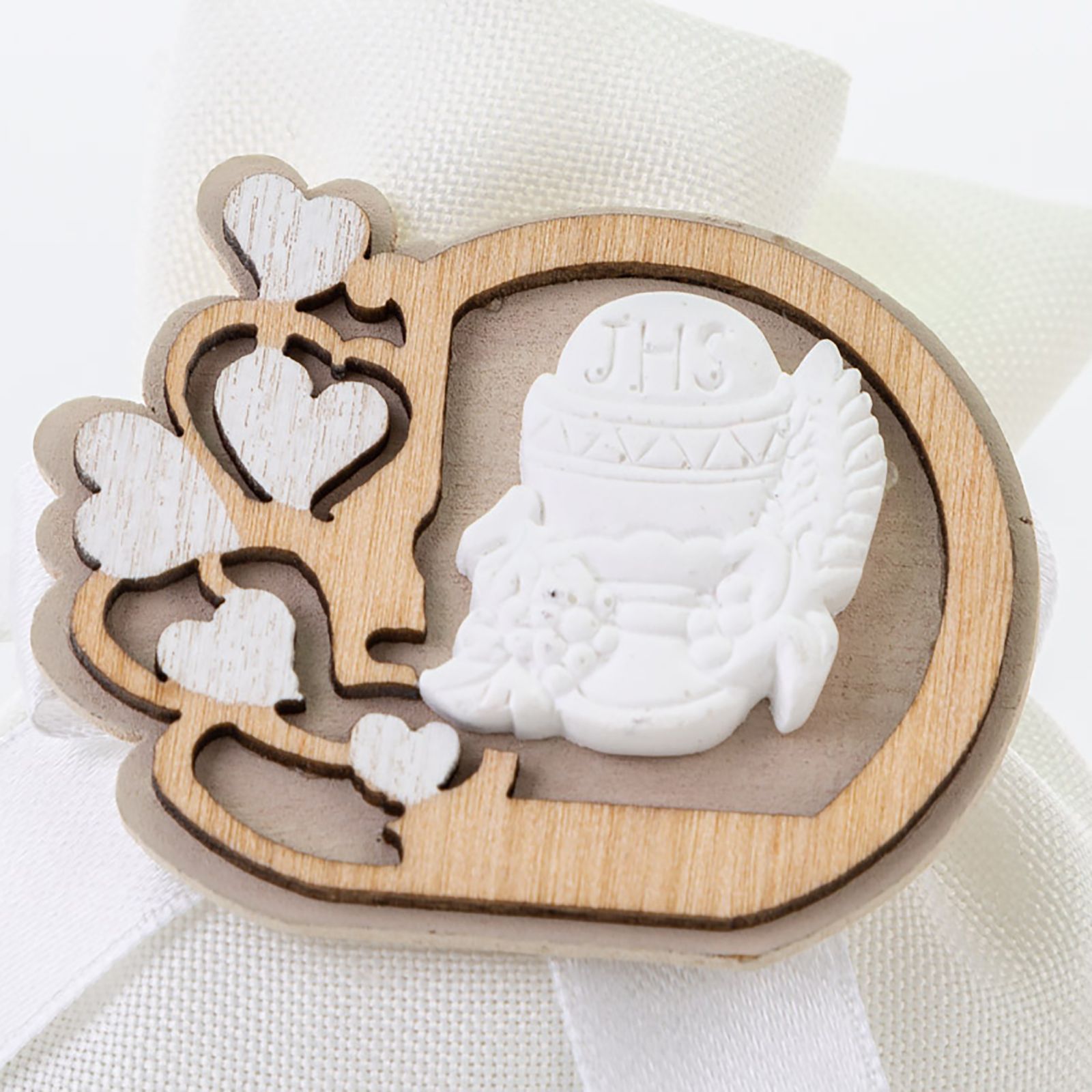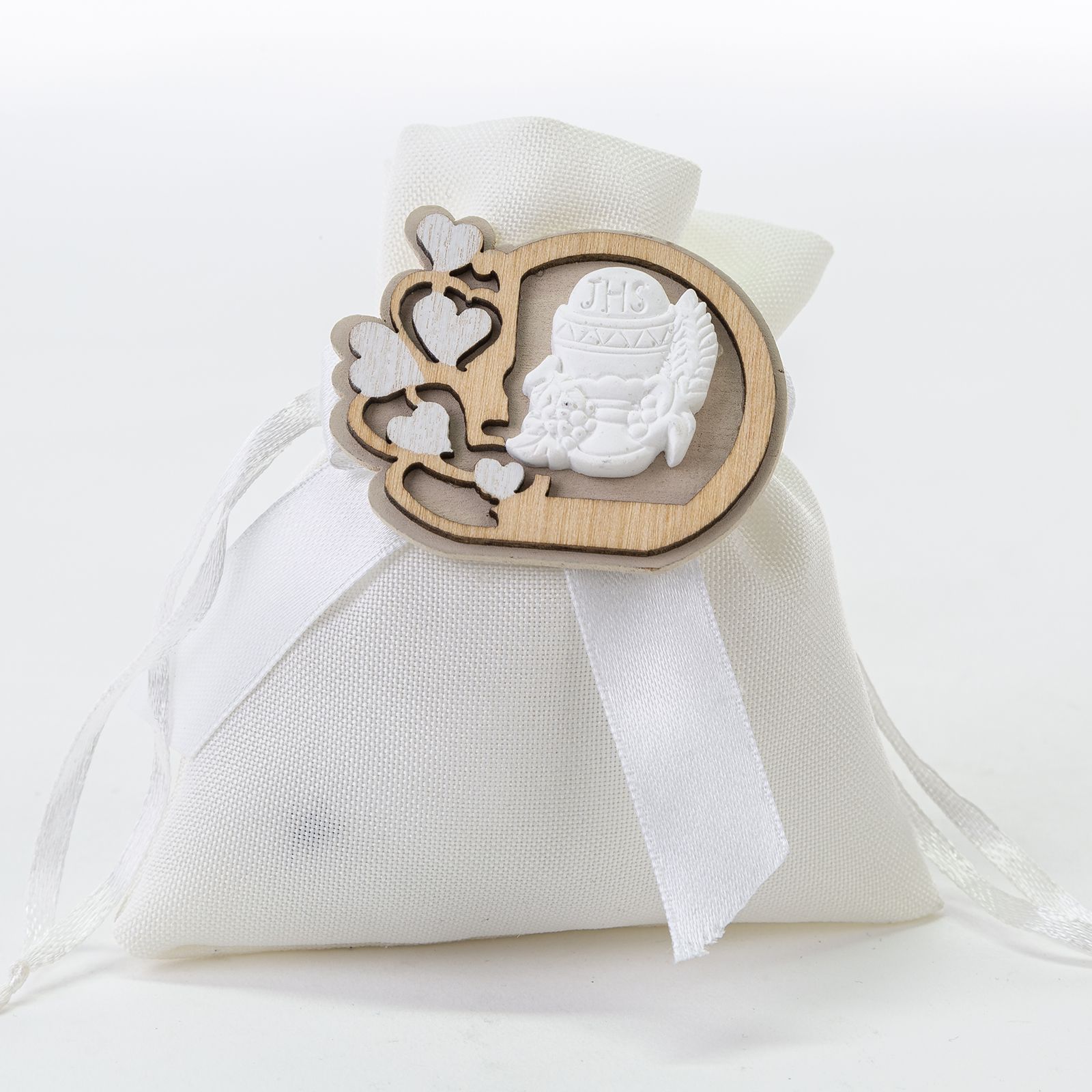Sacchettino in cotone bianco, con fiocchetto e tiranti in raso della stessa tonalità e applicazione in legno con sfondo di cuoricini e gessetto bianco raffigurante i simboli sacri della Comunione: uva, grano, calice ed ostia.