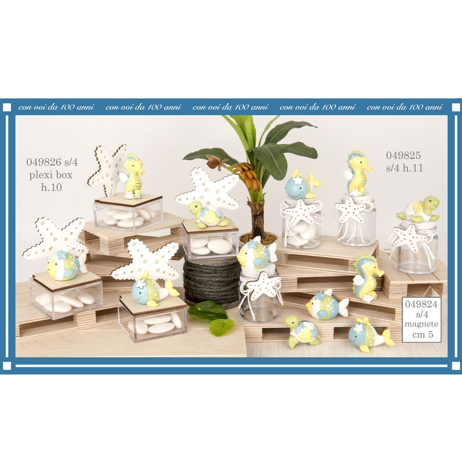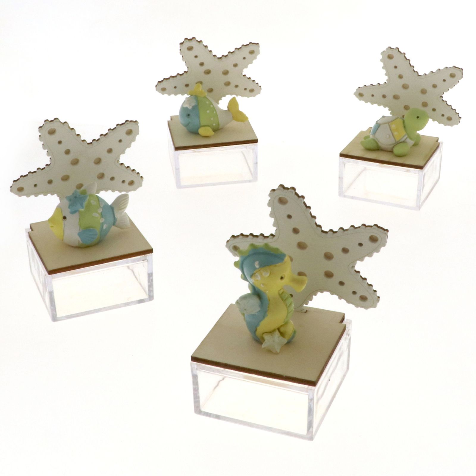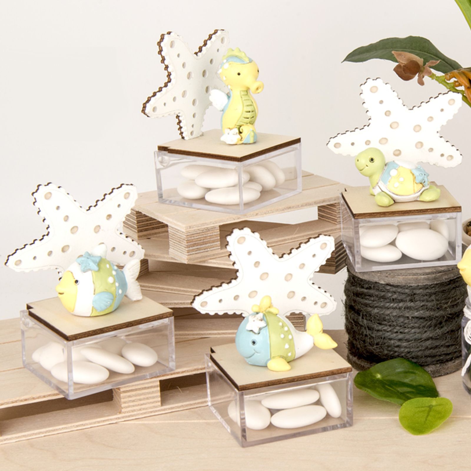 Ti presentiamo le nostre scatole in pvc trasparente, a base quadrata, con coperchio e inserto in legno a forma di stella marina e 4 diversi animaletti marini: cavalluccio, balena, pesciolino e tartaruga.