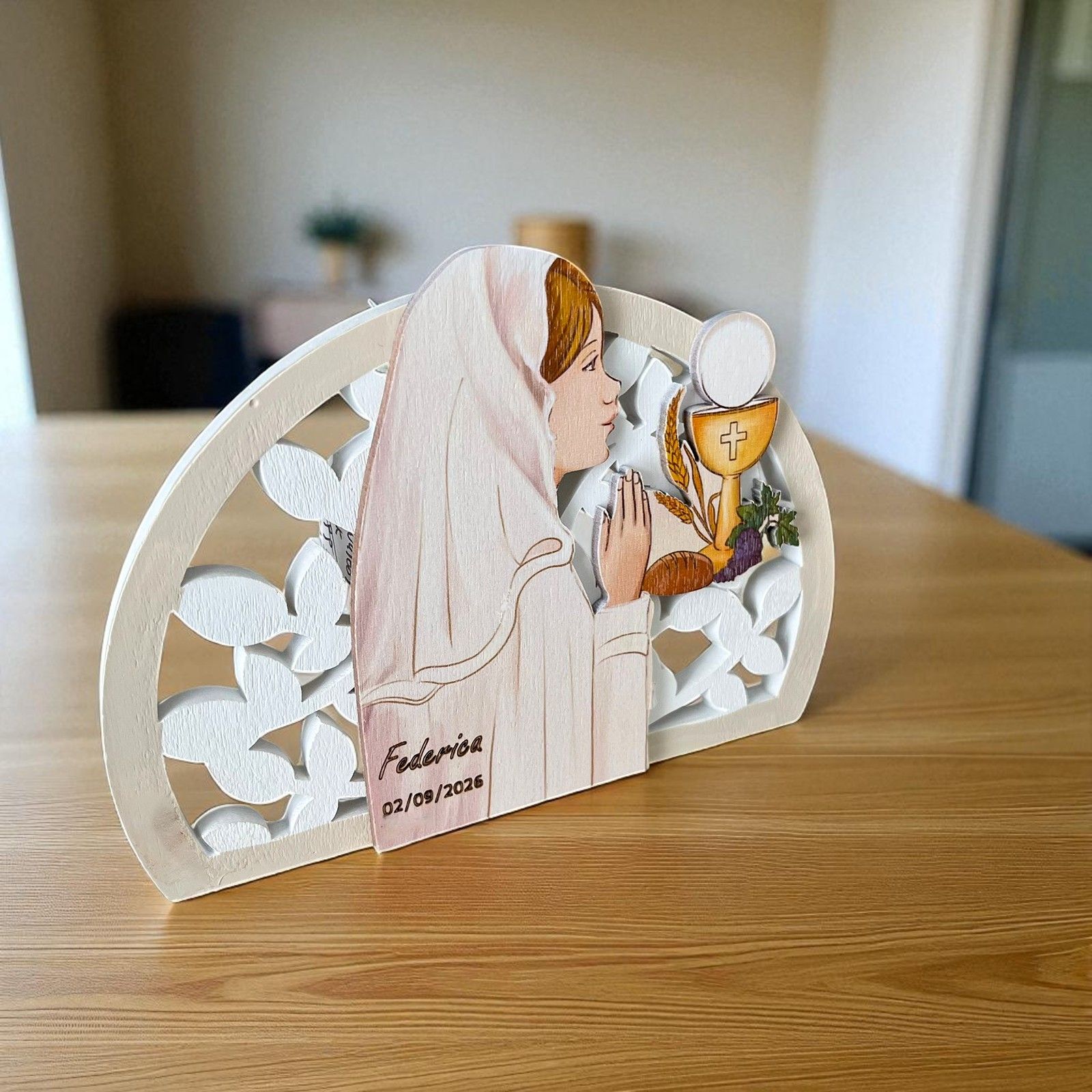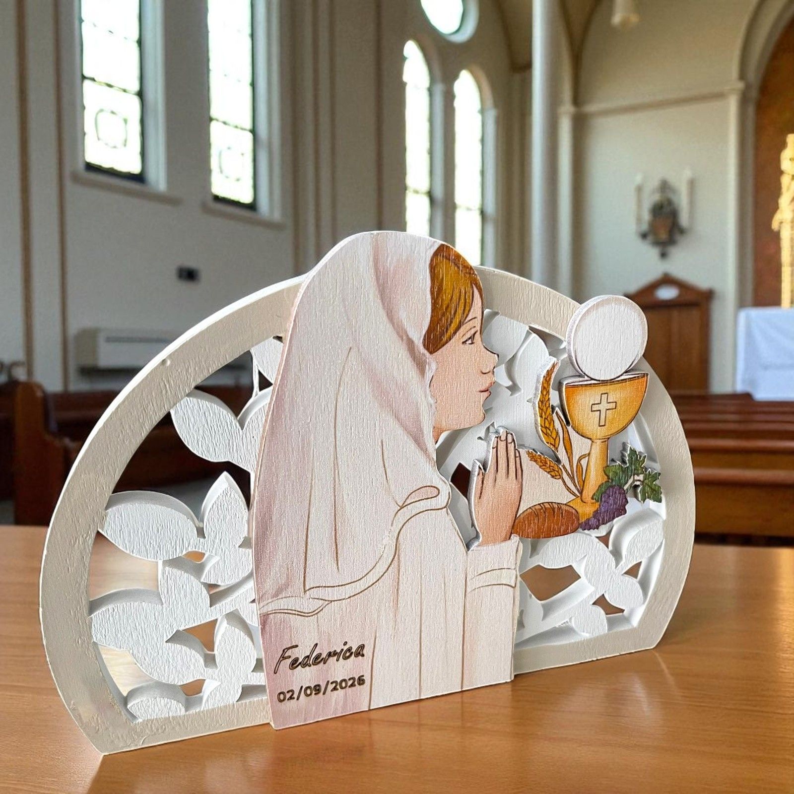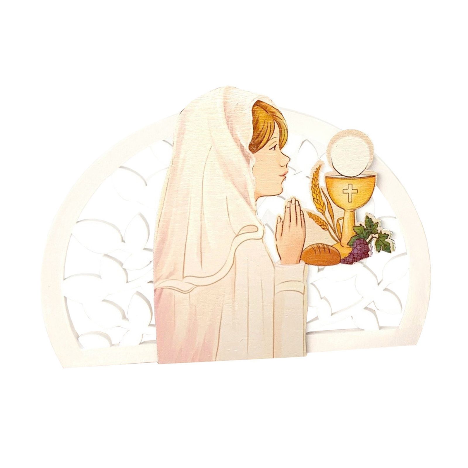 Proponiamo splendide icone da appoggio in resina bianca con inserto centrale in legno dipinto, che raffigura una bambina in preghiera circondata dai simboli della Prima Comunione: calice, ostia e spiga di grano. Un ricordo elegante e raffinato, perfetto per la comunione della tua bambina.