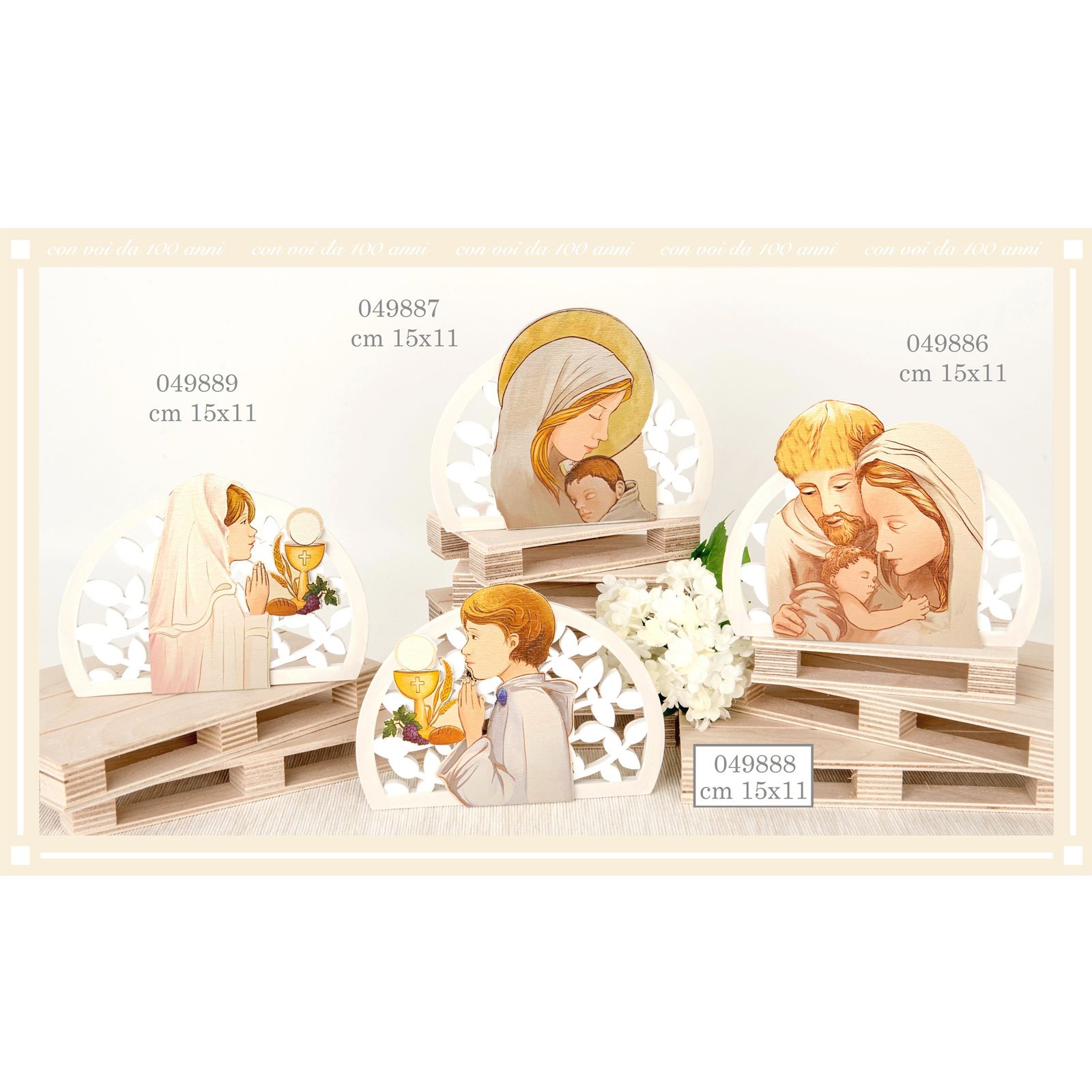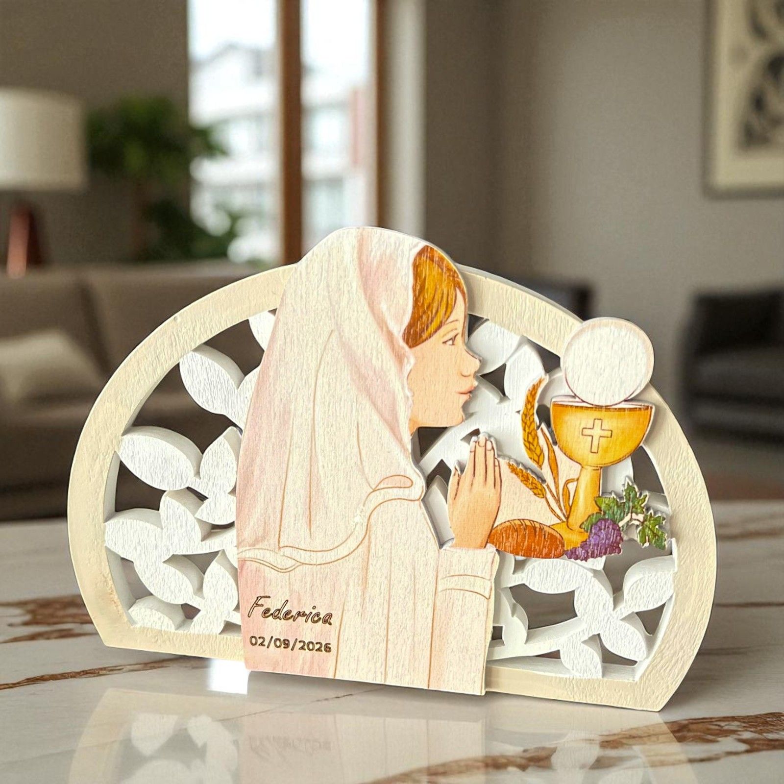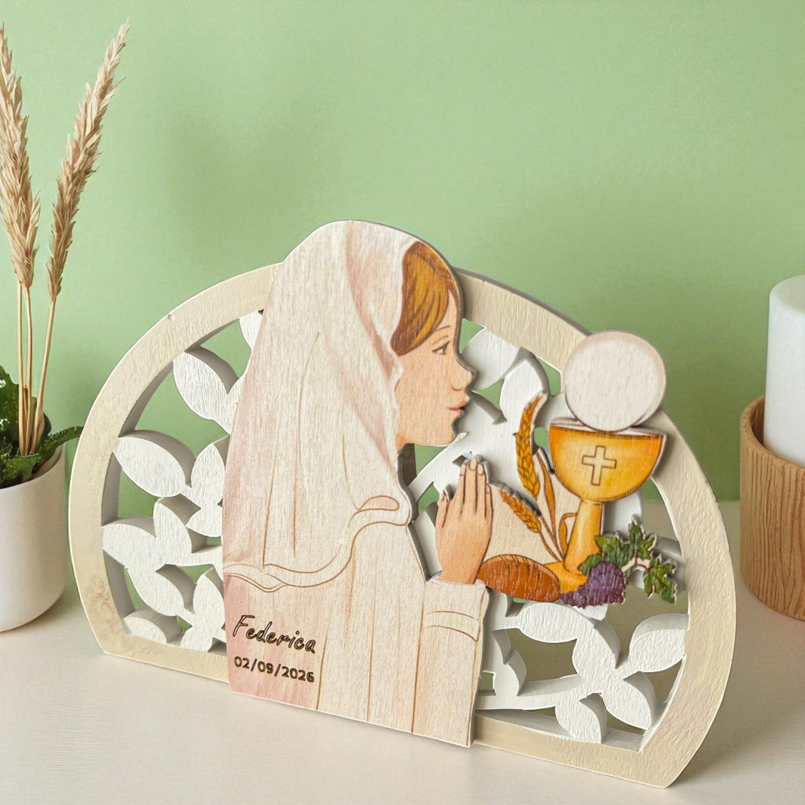 Proponiamo splendide icone da appoggio in resina bianca con inserto centrale in legno dipinto, che raffigura una bambina in preghiera circondata dai simboli della Prima Comunione: calice, ostia e spiga di grano. Un ricordo elegante e raffinato, perfetto per la comunione della tua bambina.