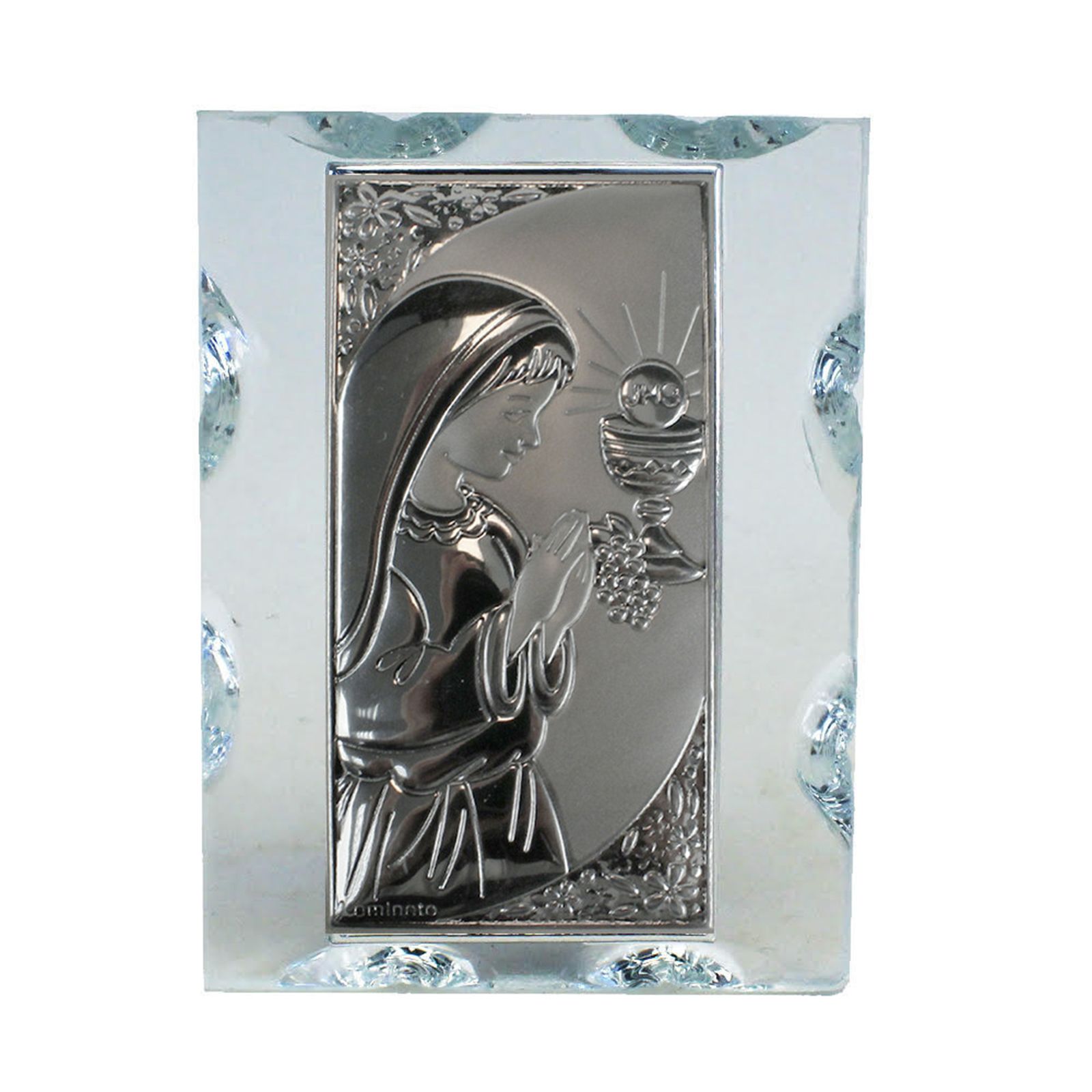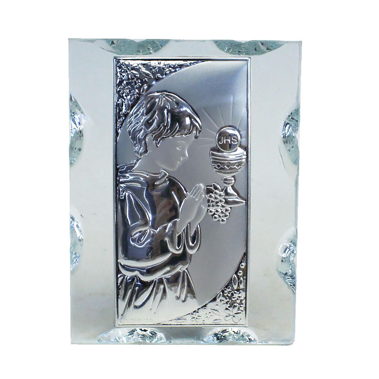 Disponibili per te queste icone in vetro con lavorazione cristallo e piastra laminata centrale in tonalità argento che presenta un'incisione a sbalzo con raffigurato un bambino o una bambina in preghiera e i simboli della Comunione.