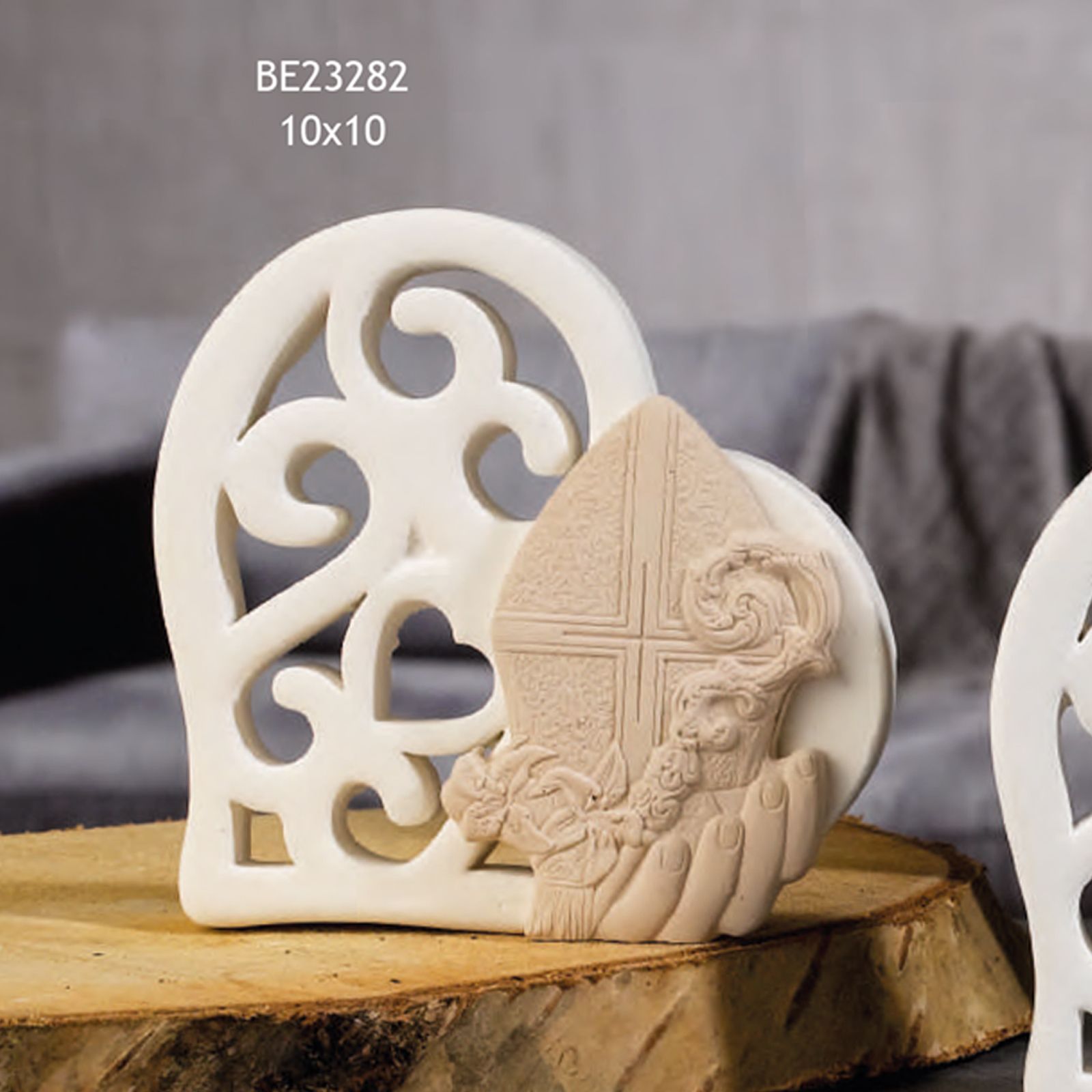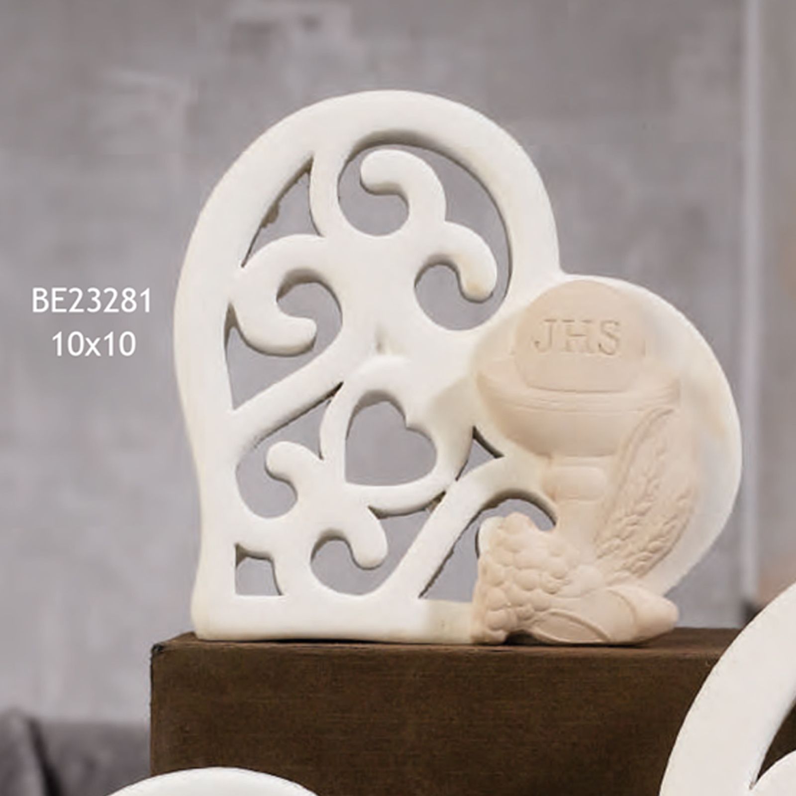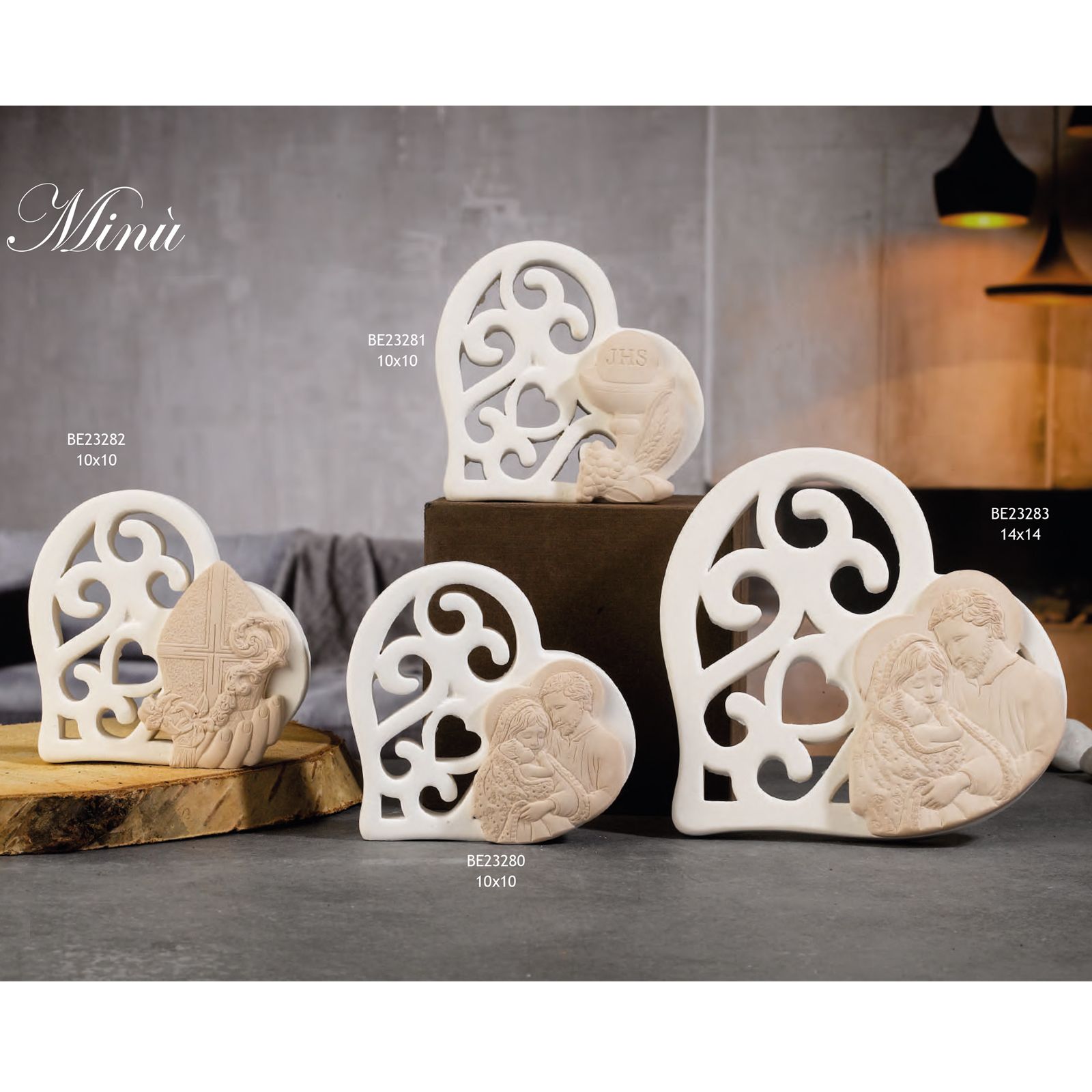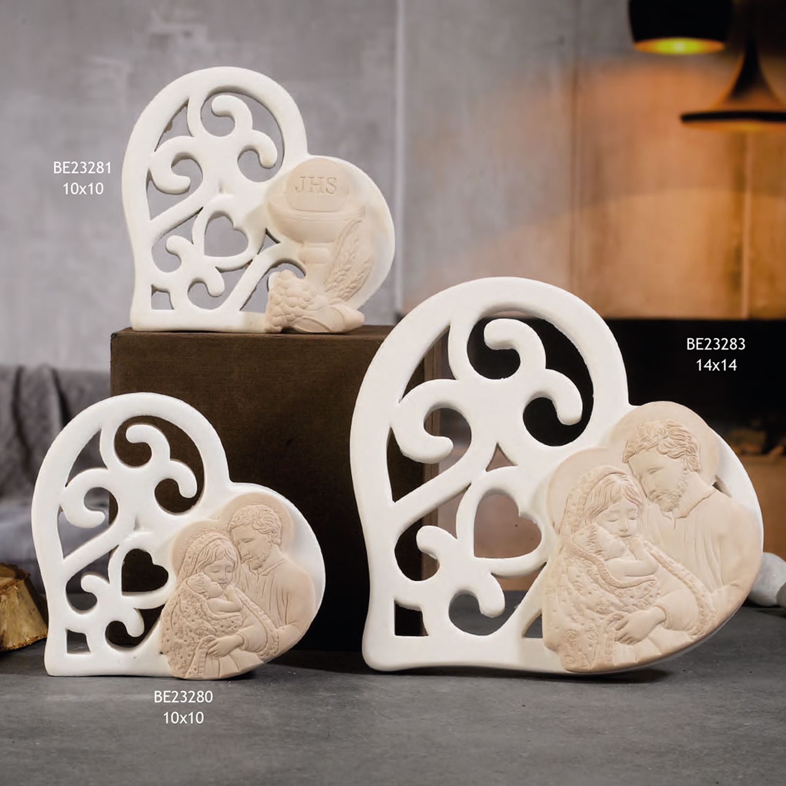 Icone da appoggio in resina e polvere di marmo, ad effetto pietra a forma di cuore traforato, raffiguranti la Sacra Famiglia, i simboli della Cresima e i simboli della Comunione.