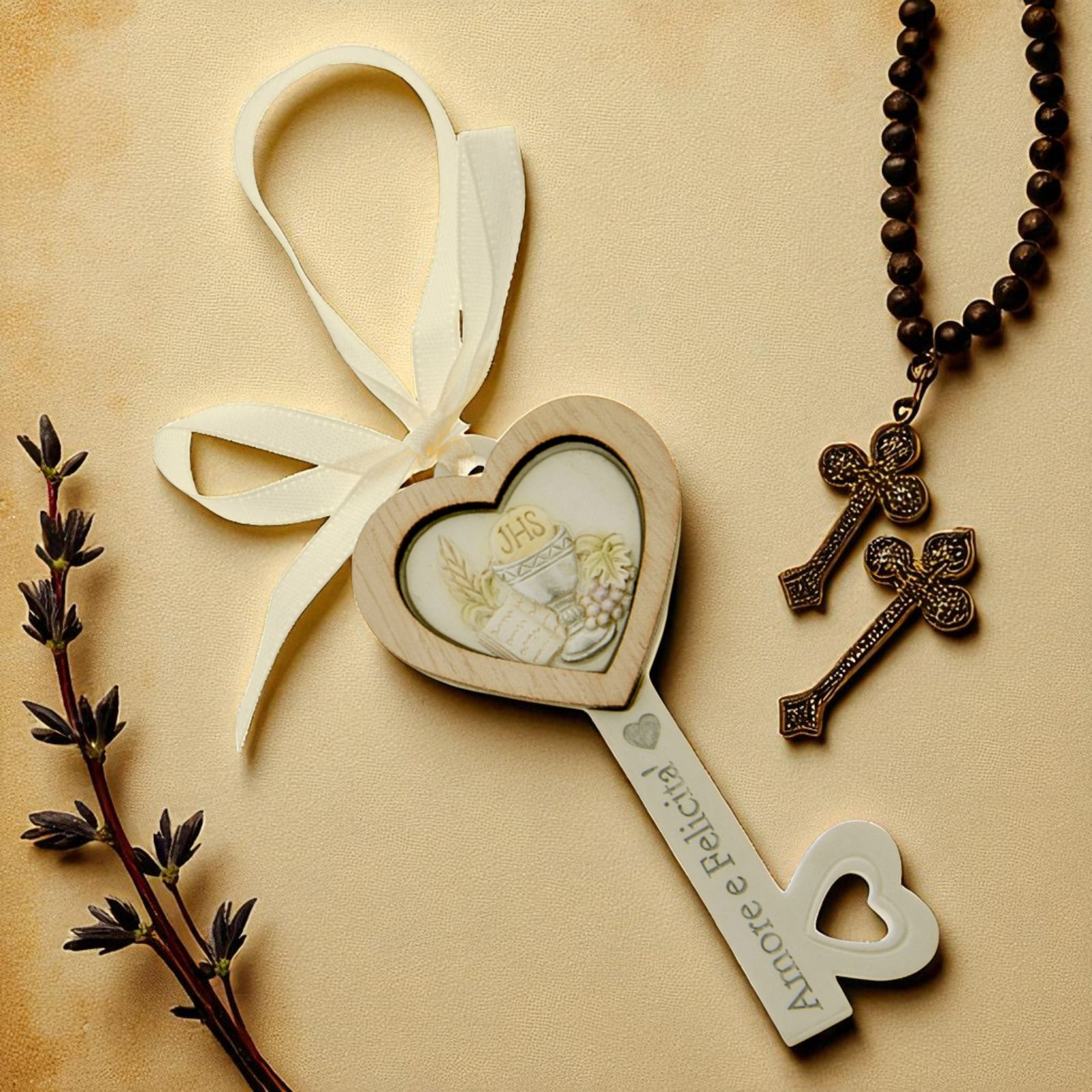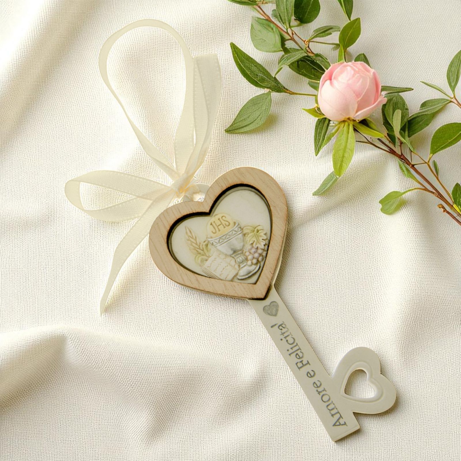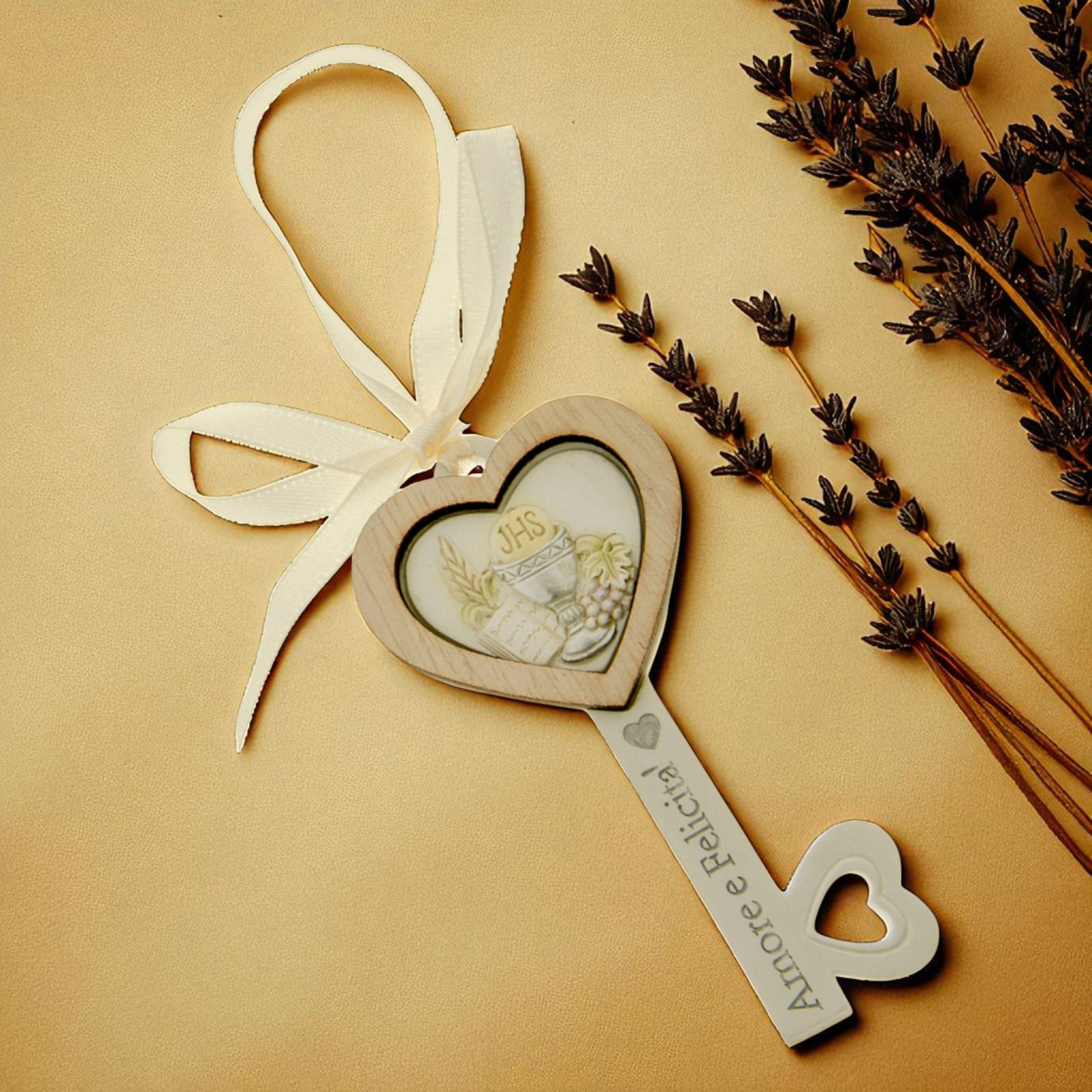 Chiave portafortuna moderna a forma di cuore in resina color panna e bianco raffigurante i simboli tipici della prima comunione, eucarestia calice con ostia, spighe di grano e grappoli d'uva. Curate le rifiniture dei particolari: presente l'incisione "Amore e felicità" in basso.