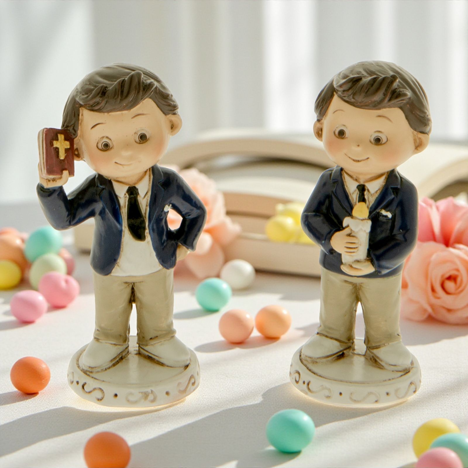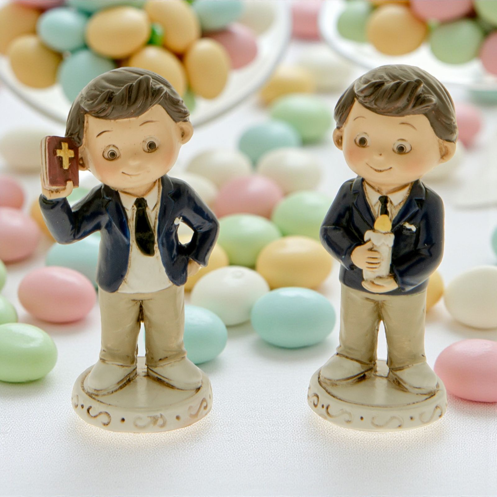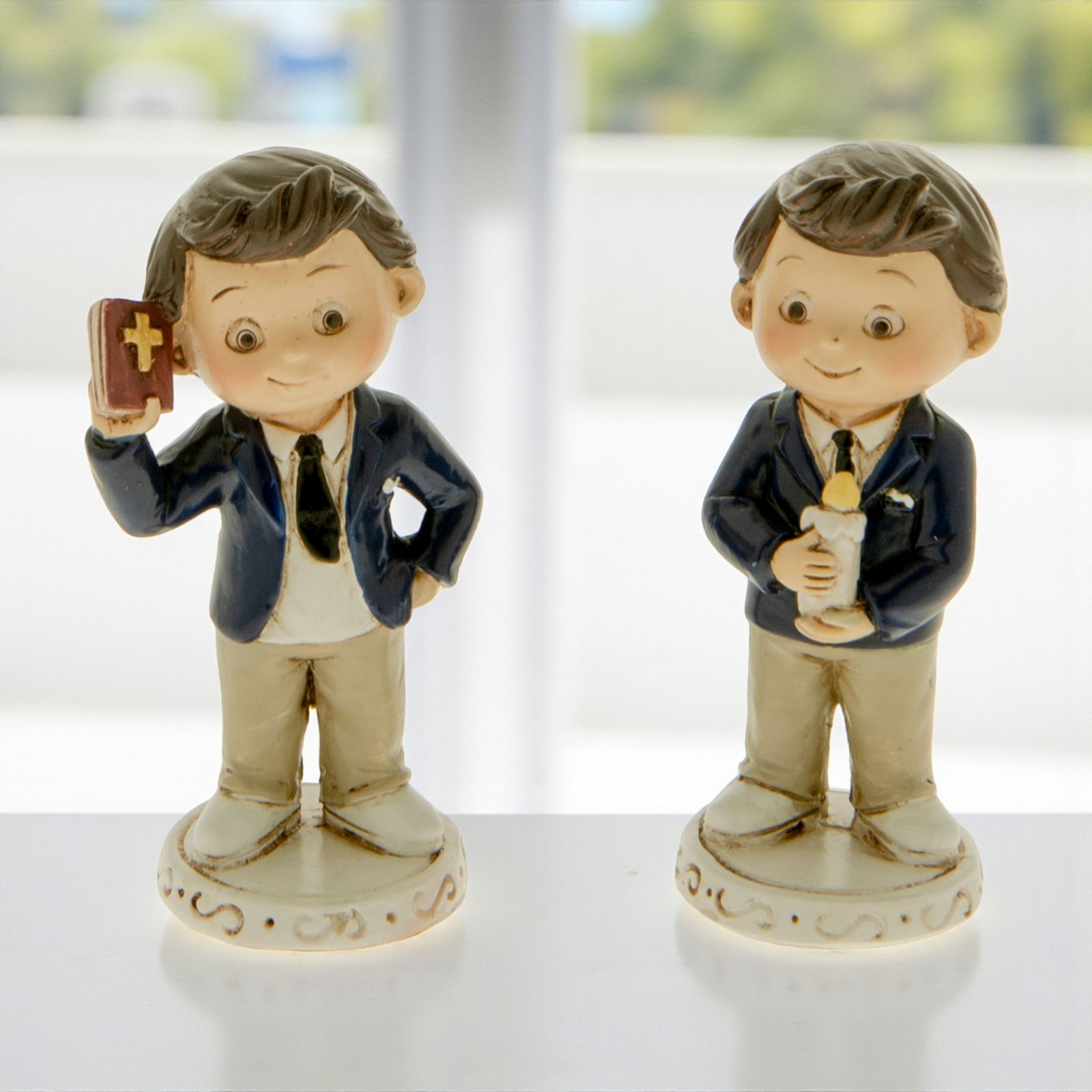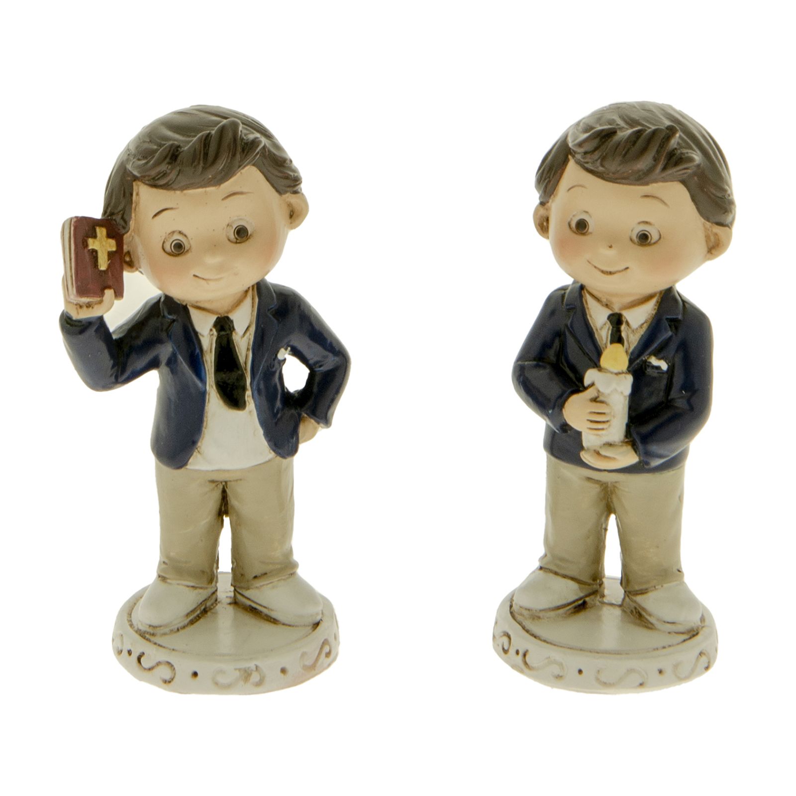 Acquista queste simpatiche statuine in resina colorata raffiguranti un bambino elegantemente vestito in due varianti assortite: con candela o con Vangelo.