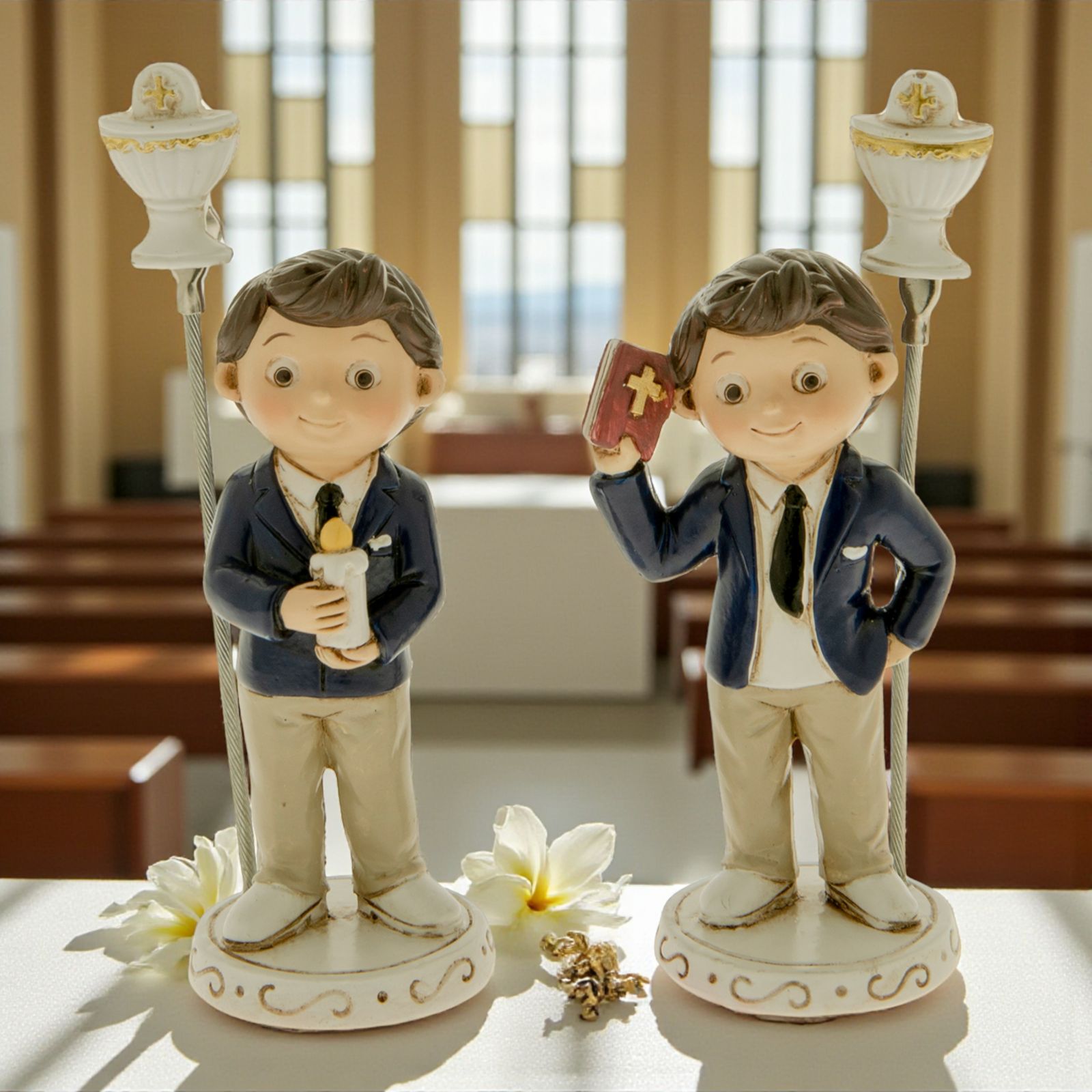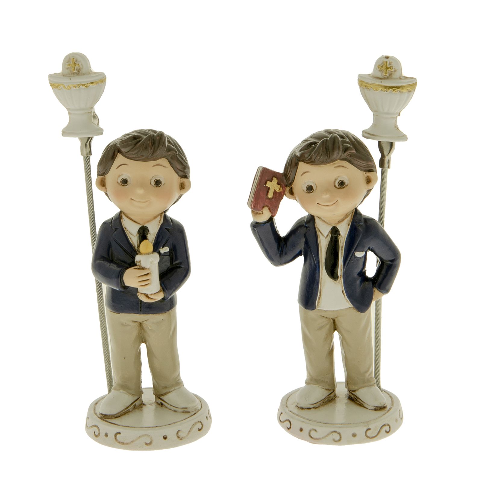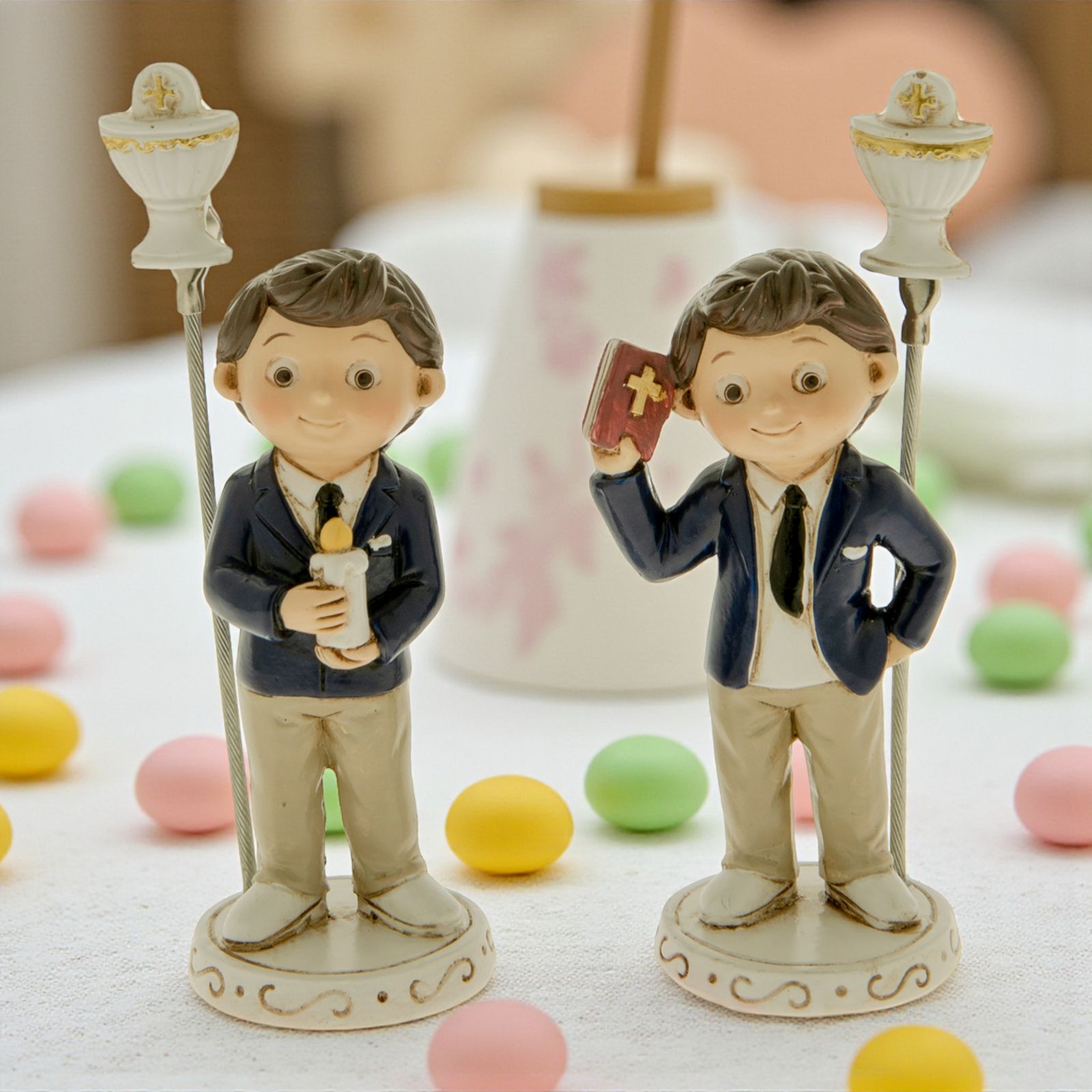 Statuina in resina colorata con bambino in abiti eleganti con asta porta memo e foto posta sul retro. Utilizza l'asticella che termina in una spirale per applicare bigliettini, come portafoto comunione o come segnaposto comunione.