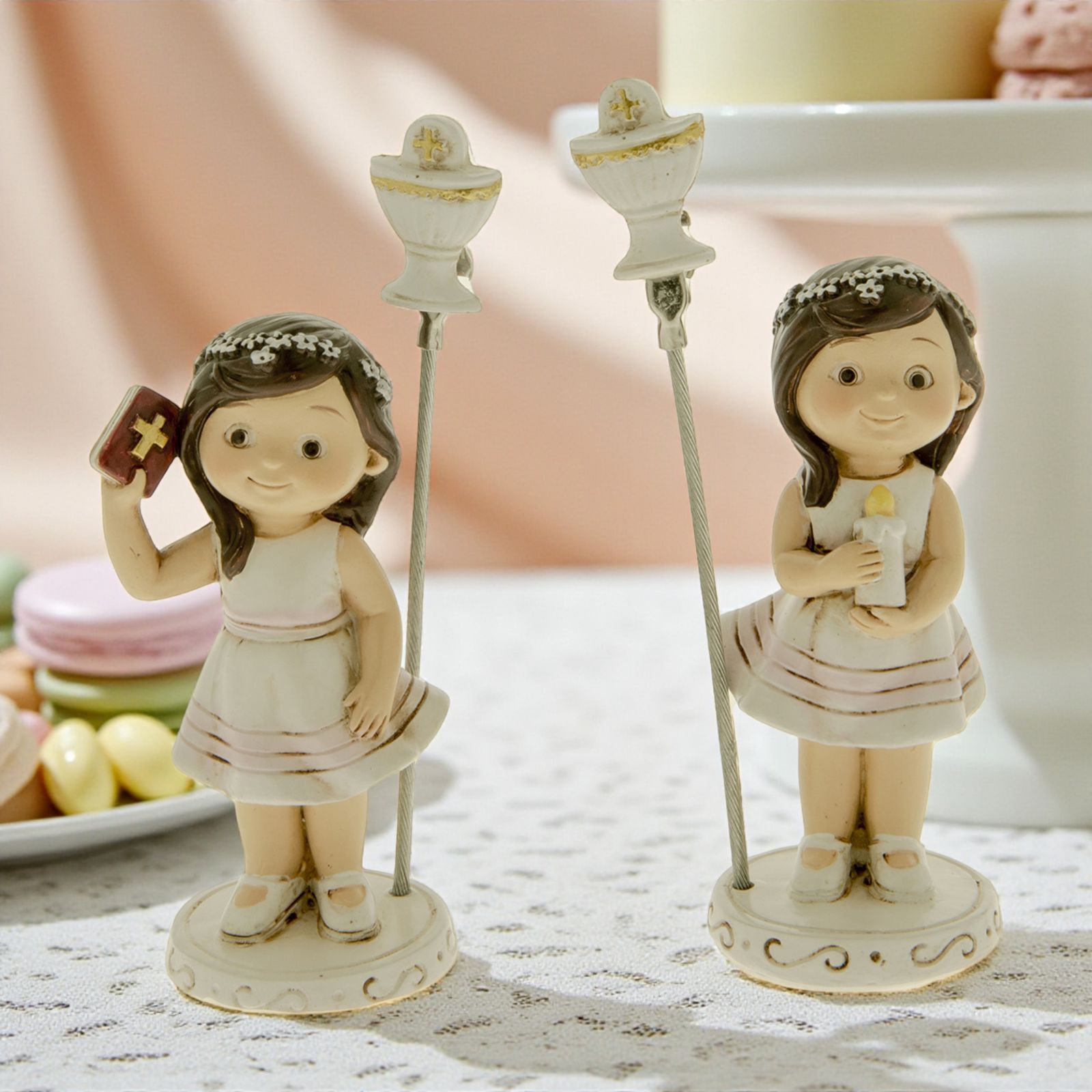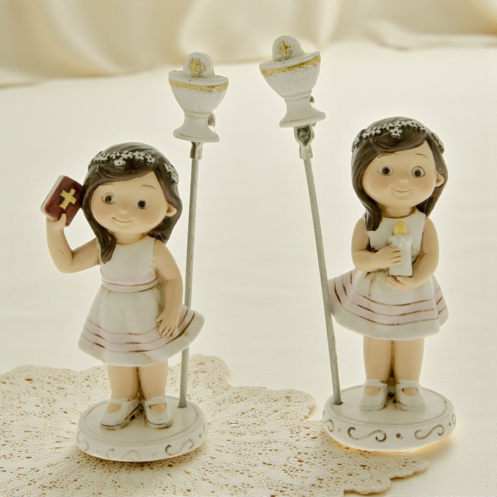 Eleganti statuette bimba prima comunione con asta in metallo per bomboniere utili come portafoto comunione e come segnaposto.