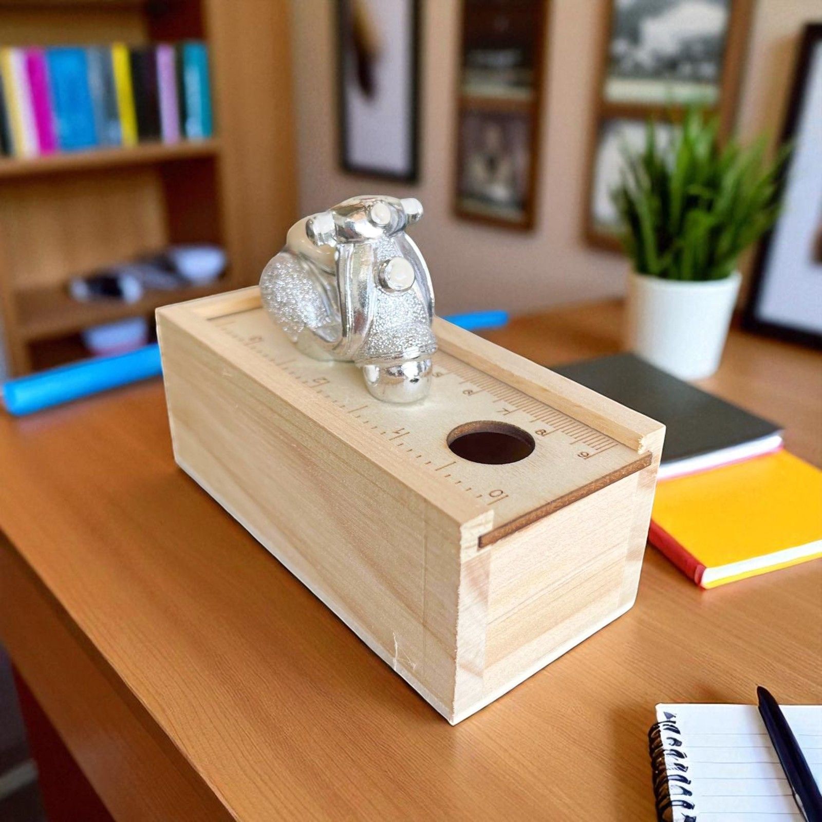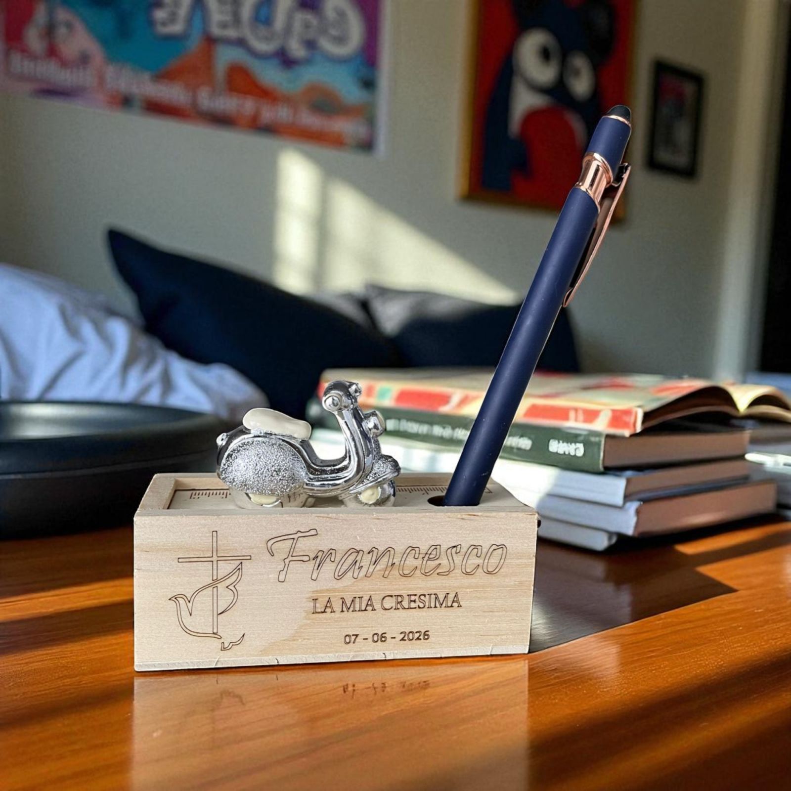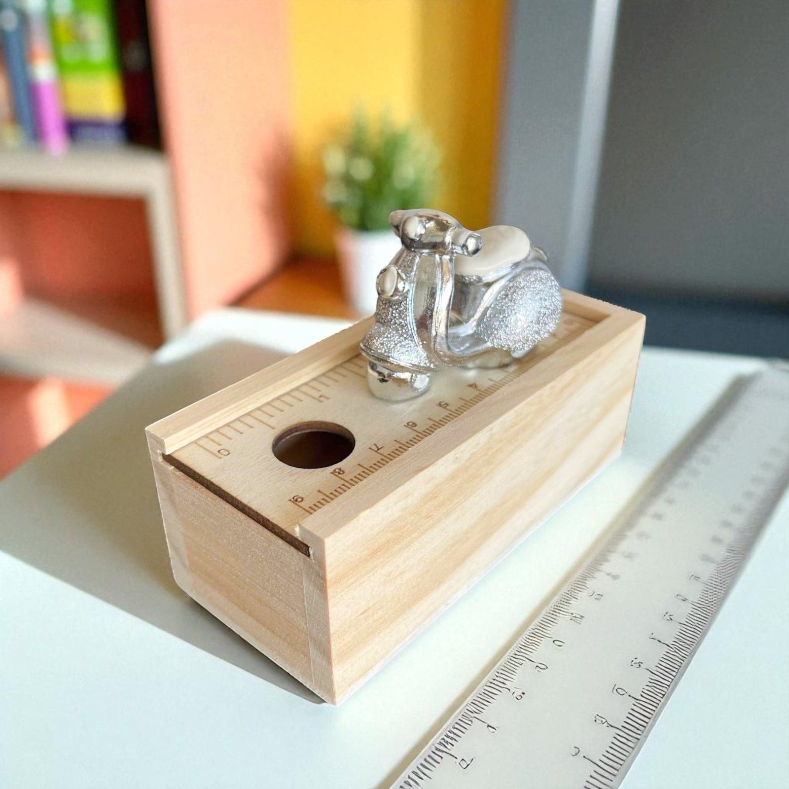 La vera particolarità? Il coperchio in legno si trasforma in un pratico righello, rendendo la scatolina riutilizzabile nella vita di tutti i giorni. Sulla parte superiore è applicata una mini Vespa in resina argentata, ideale per eventi a tema viaggio o per chi cerca un tocco giovane e simbolico.