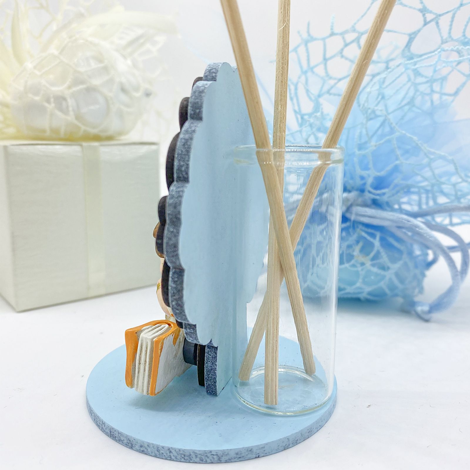 Acquista online questi incantevoli alberi della vita profumatori con fiala, in colorazione celeste e bianco con frontalmente un piccolo bimbo in preghiera con un rosario tra le mani e un piccolo libro alla base. Potrai selezionare se acquistare le bomboniere albero della vita con o senza diffusore di aromi.