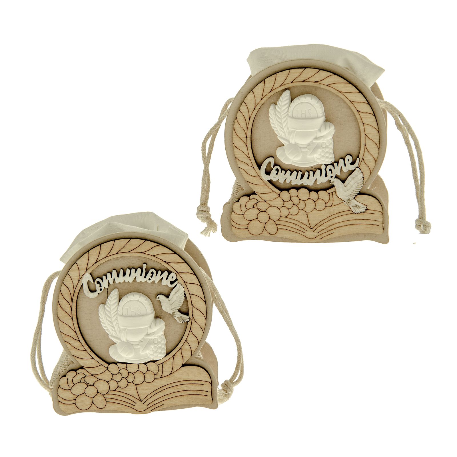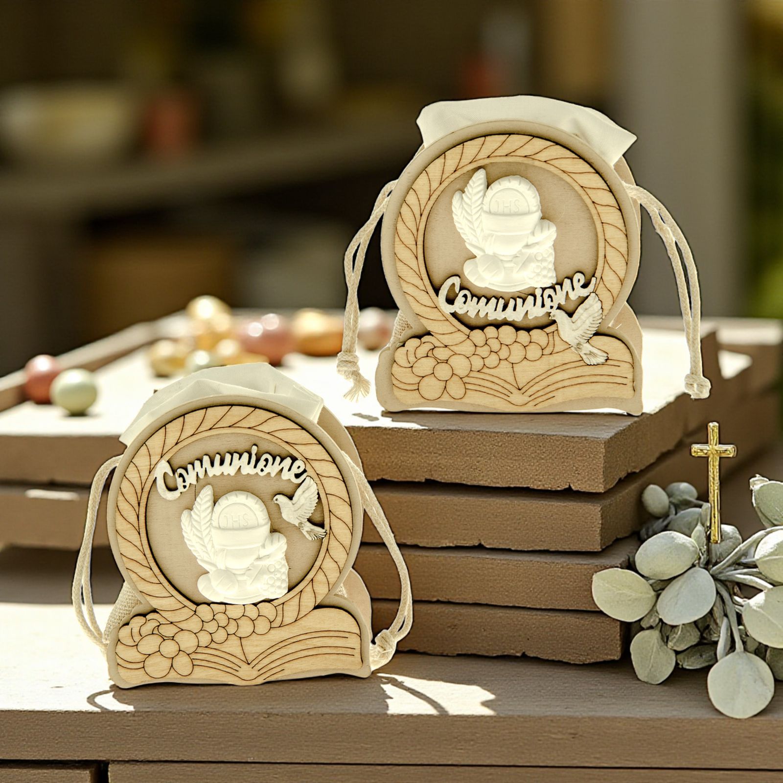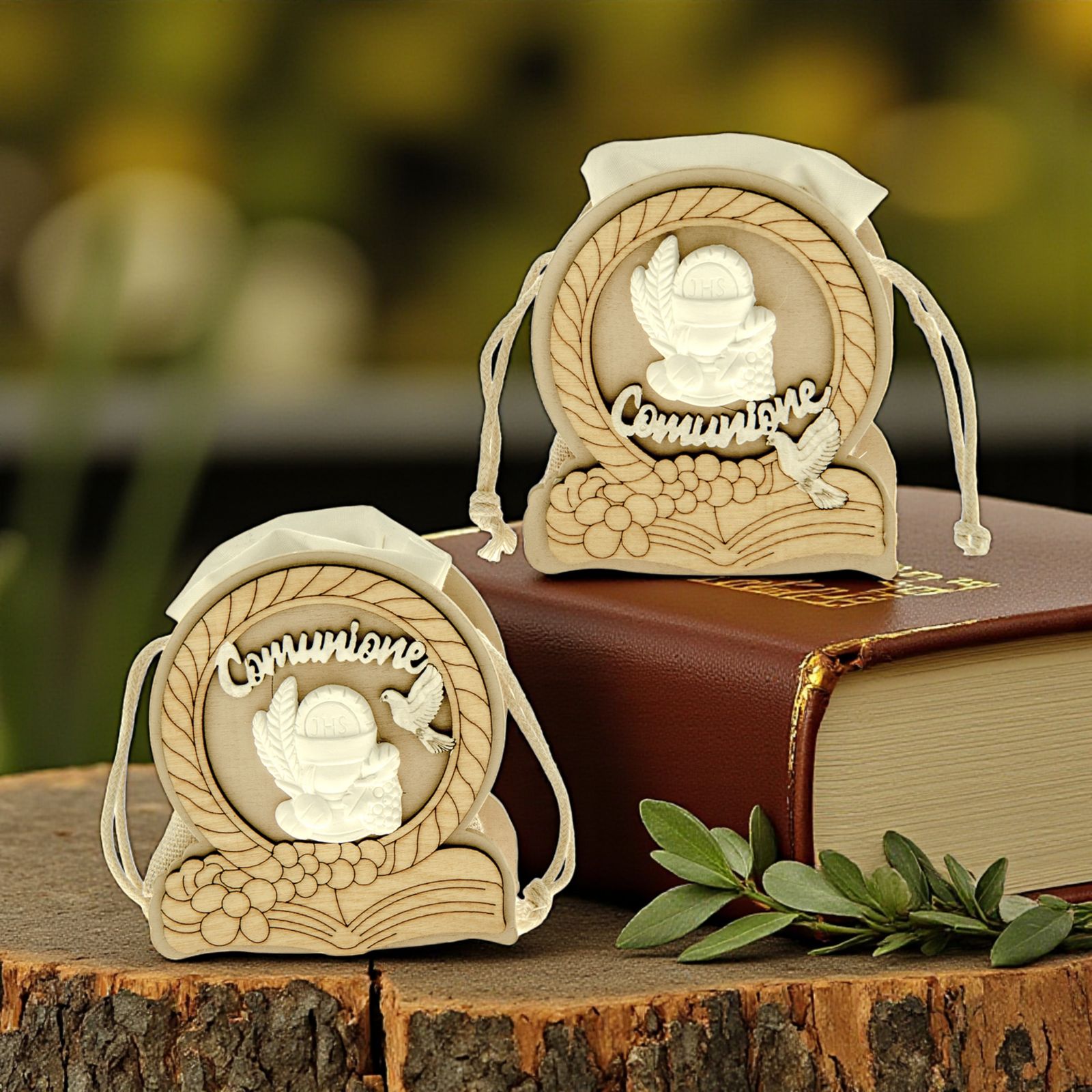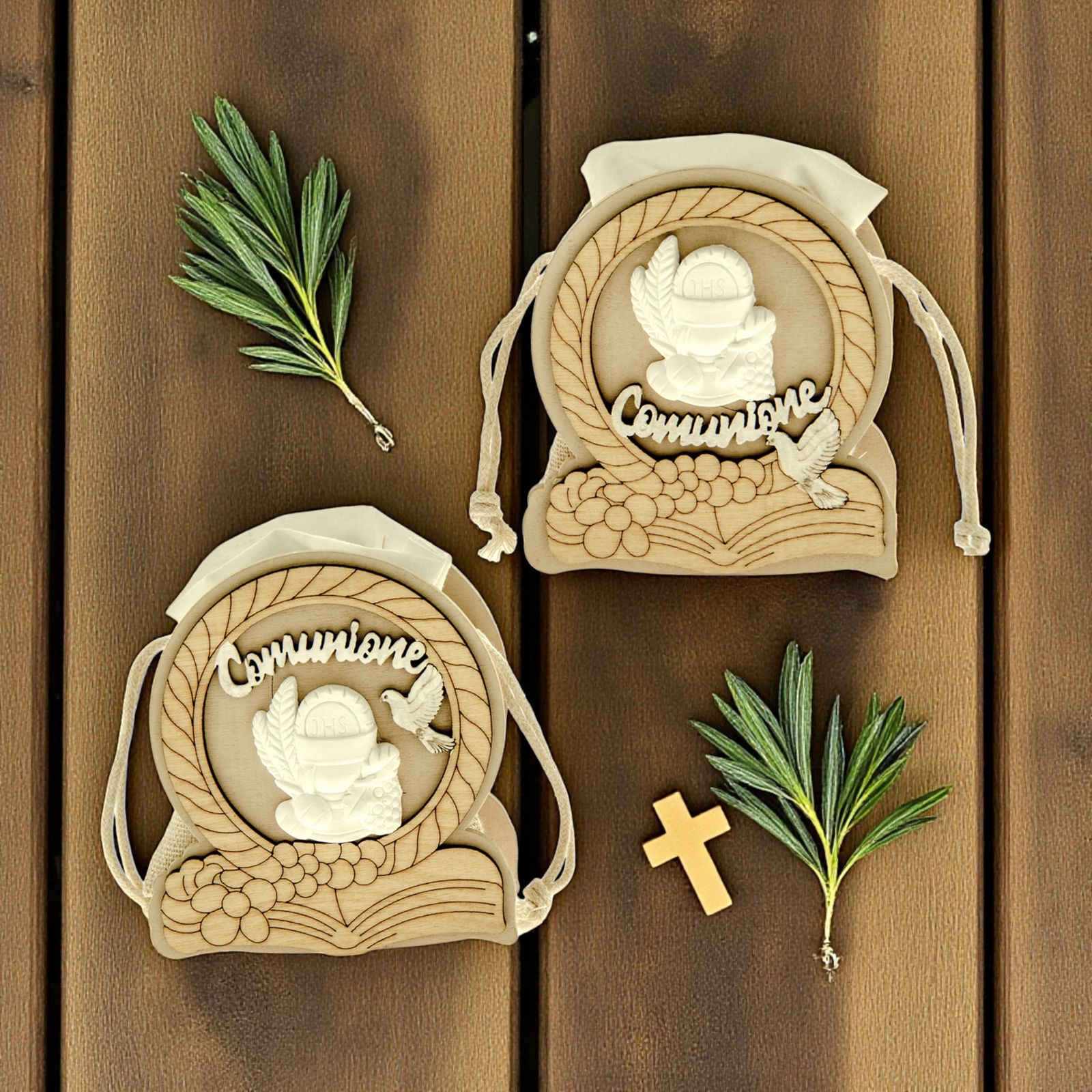 Scatoline aperte in legno in tonalità naturale con scritta "Comunione" e gessetto bianco raffigurante i simboli del Sacramento: calice, ostia, spiga di grano e uva. Le scatoline sono assortite in due varianti che differiscono per la posizione della colomba bianca presente sulla struttura.All'interno del portaconfetti troverai un sacchettino bianco in tessuto per riporre i tuoi confetti.