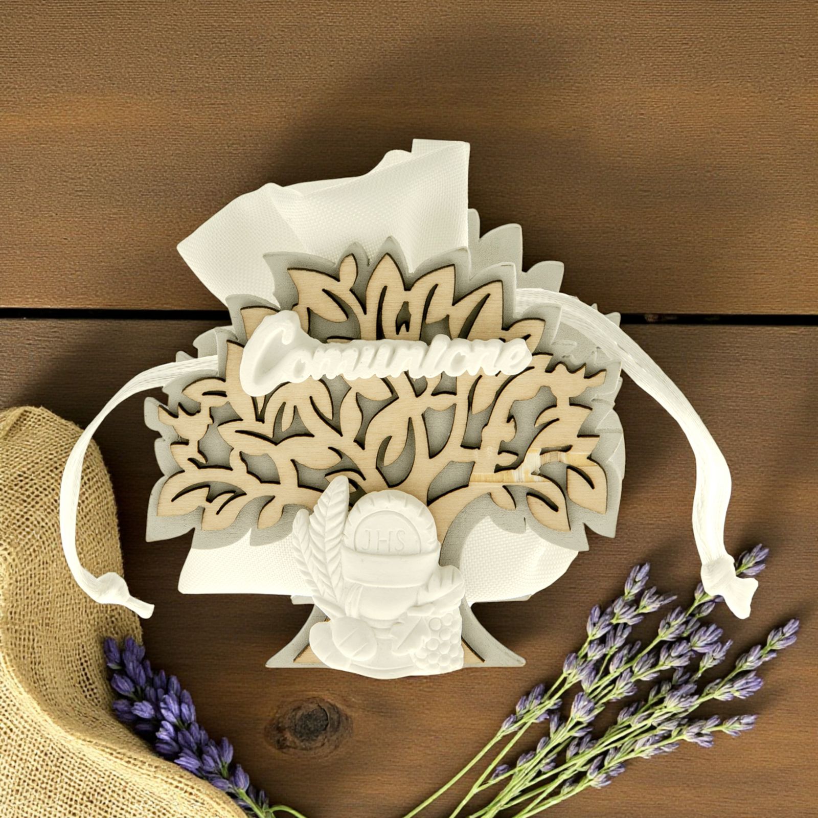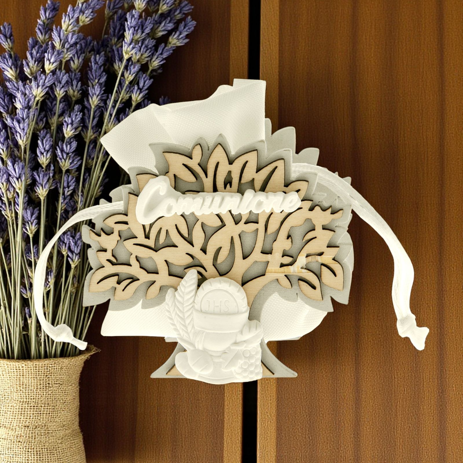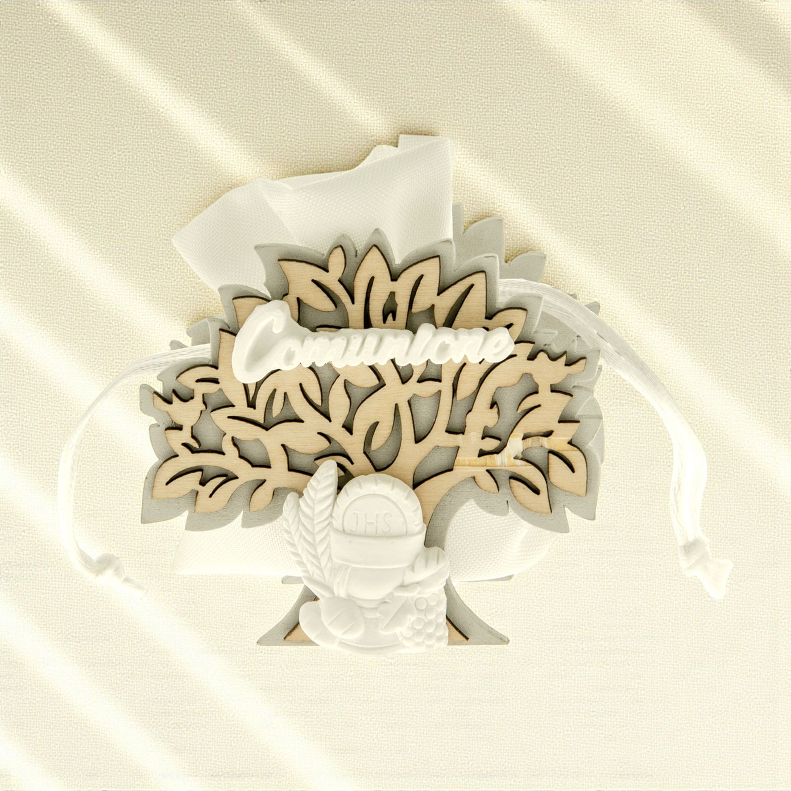 Scatoline portaconfetti in legno in tonalità naturale e bianca a forma di albero della vita con frontalmente la scritta in bianco "Comunione" con alla base un gessetto bianco con i simboli sacri della Comunione: calice, ostia, spiga di grano e grappolo d'uva.