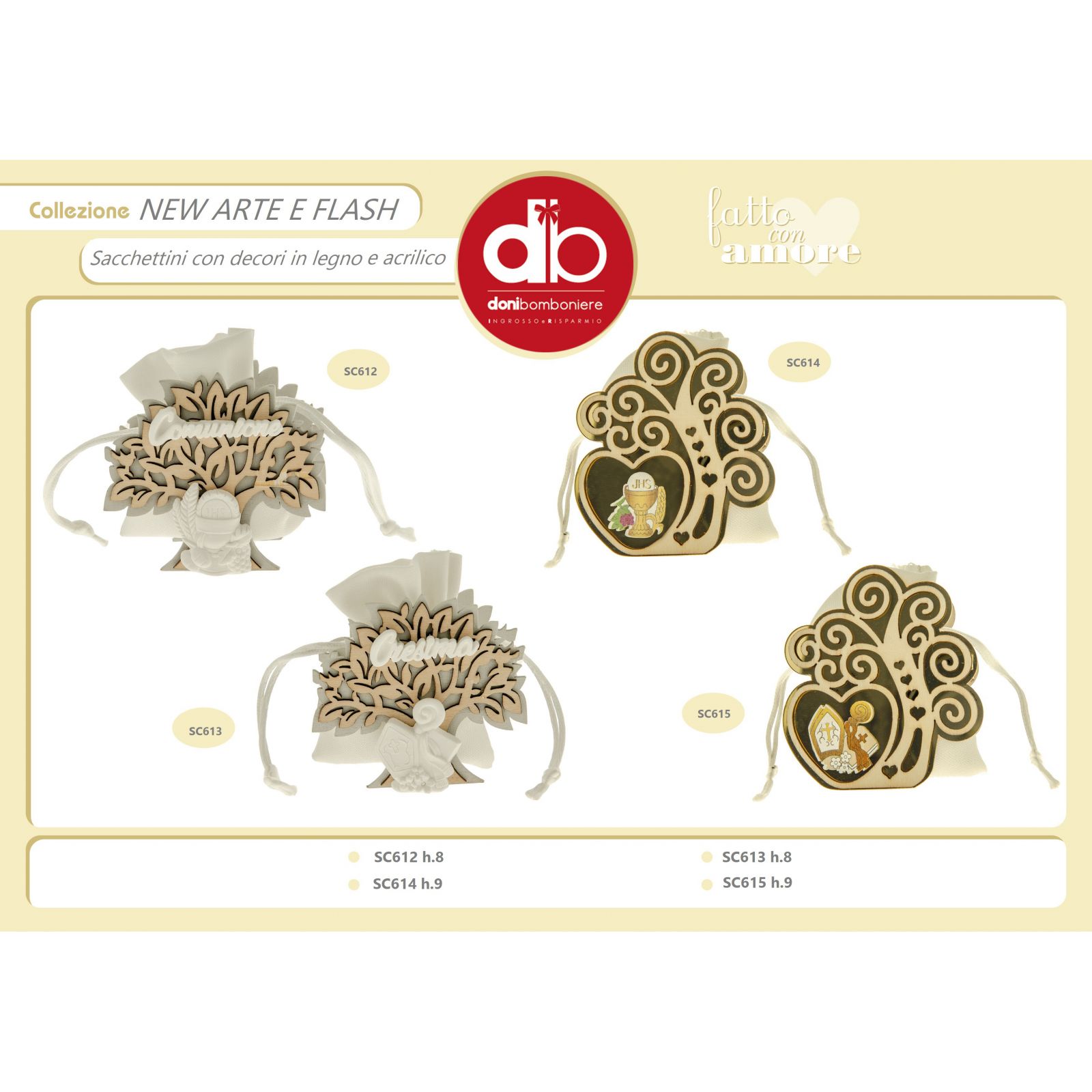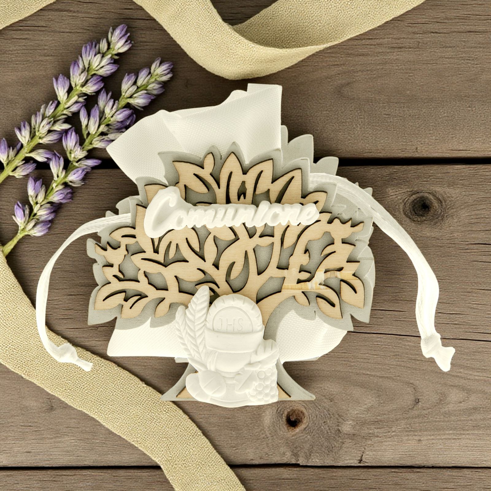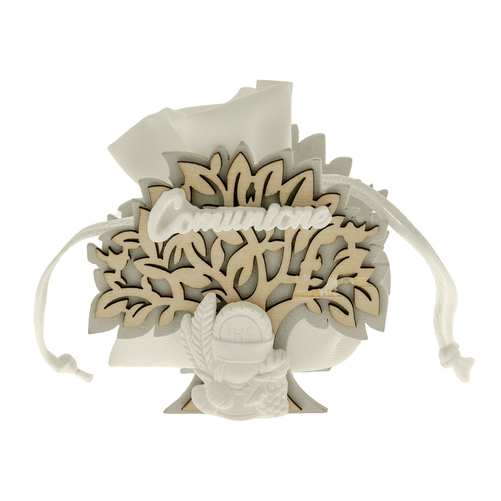 Scatoline portaconfetti in legno in tonalità naturale e bianca a forma di albero della vita con frontalmente la scritta in bianco "Comunione" con alla base un gessetto bianco con i simboli sacri della Comunione: calice, ostia, spiga di grano e grappolo d'uva.