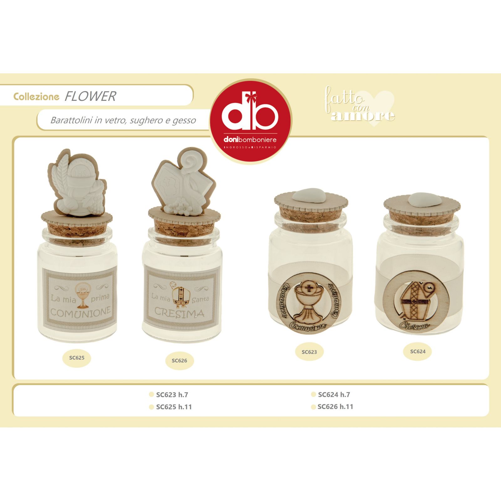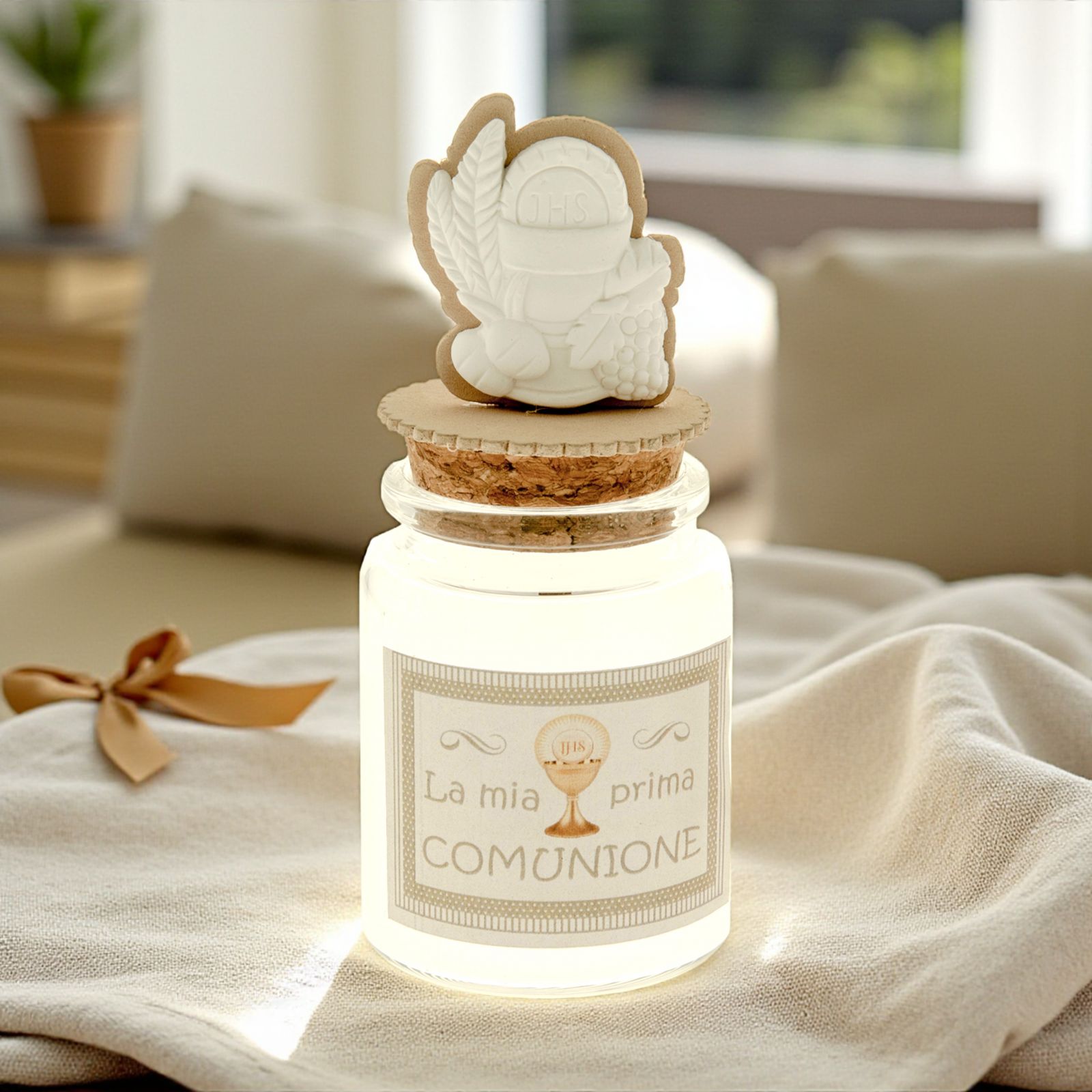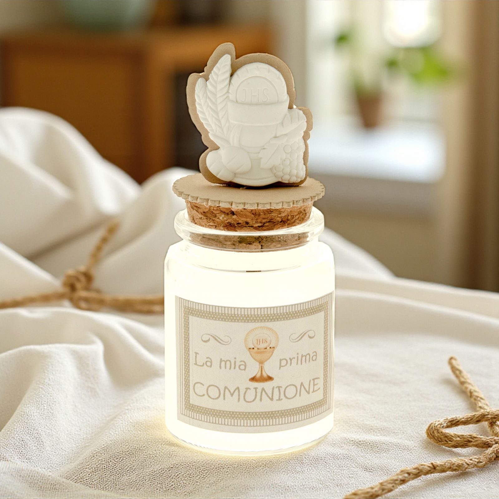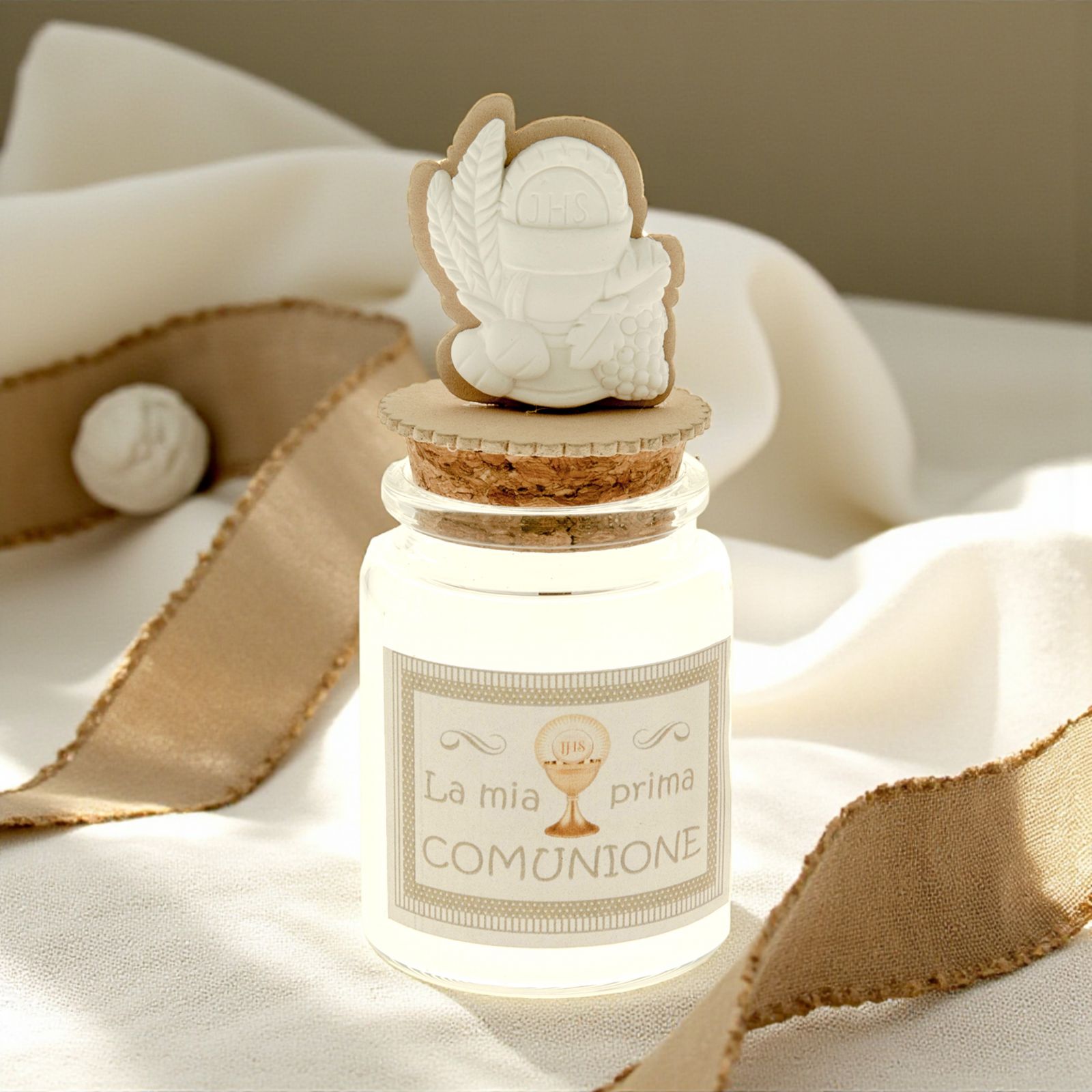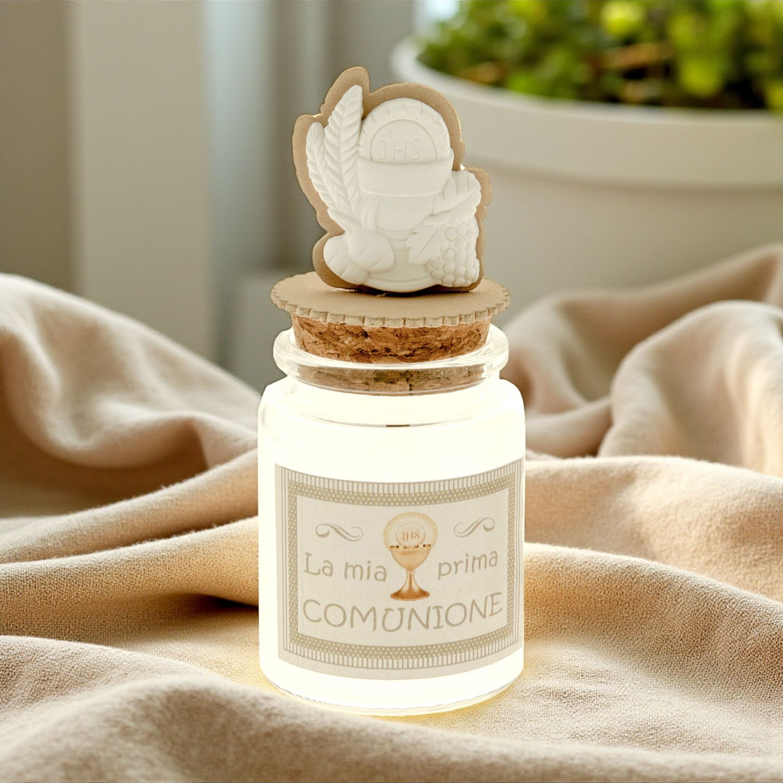 Scegli questi deliziosi vasetti in vetro con etichetta "La mia Prima Comunione" provvisti di tappo in sughero su cui è posizionato un gessetto raffigurante i simboli del sacramento: calice, ostia JHS, spighe di grano e uva.