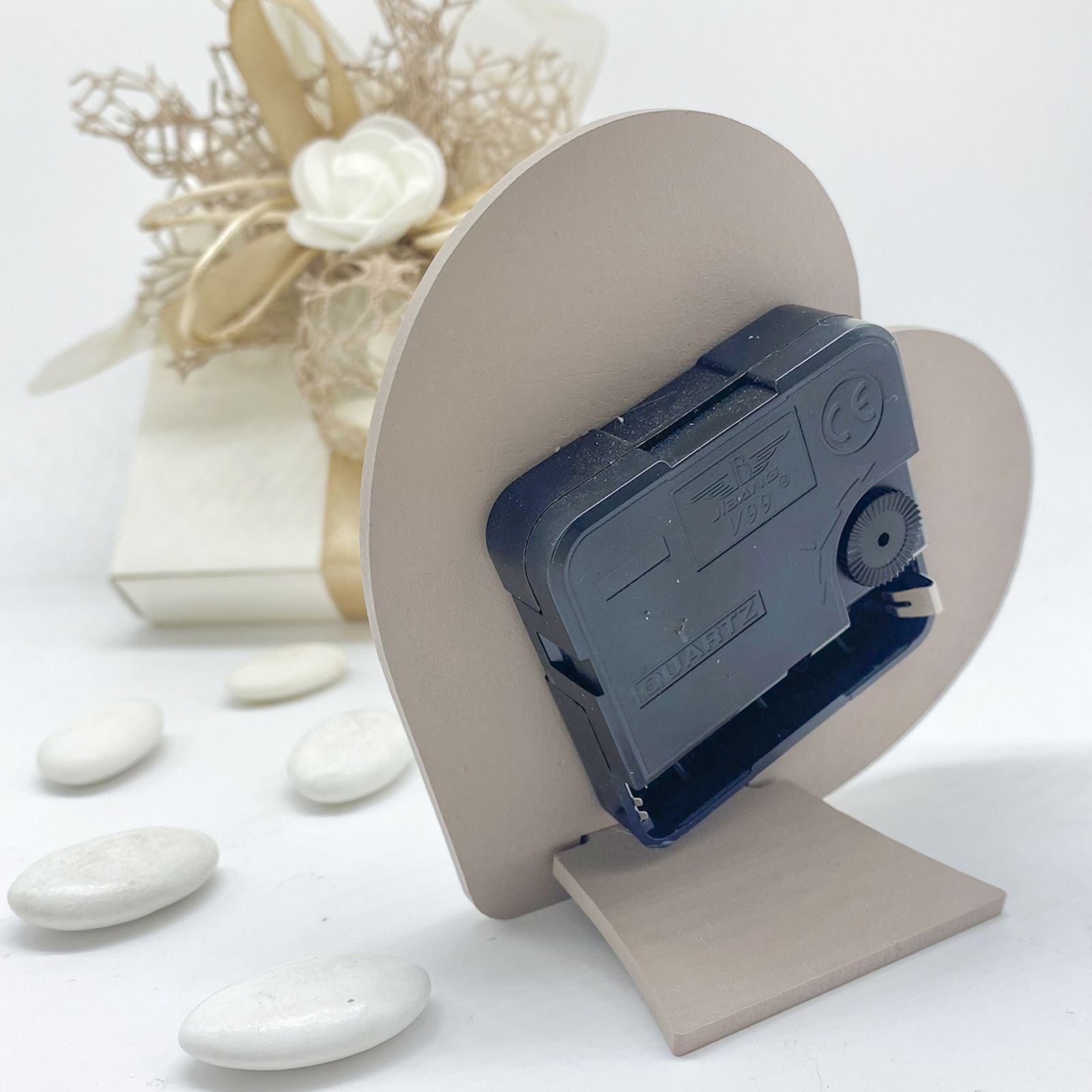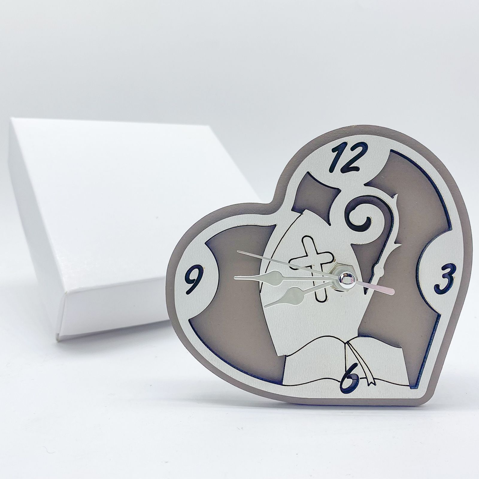 Scegli i nostri orologi da tavolo analogici, con funzionamento a batteria da 1,5 volts AA (non incluso), realizzati in legno color tortora con dettagli bianchi per quadrante e decoro centrale che raffigura i Simboli della Cresima, ovvero mitra, pastorale e Vangelo.