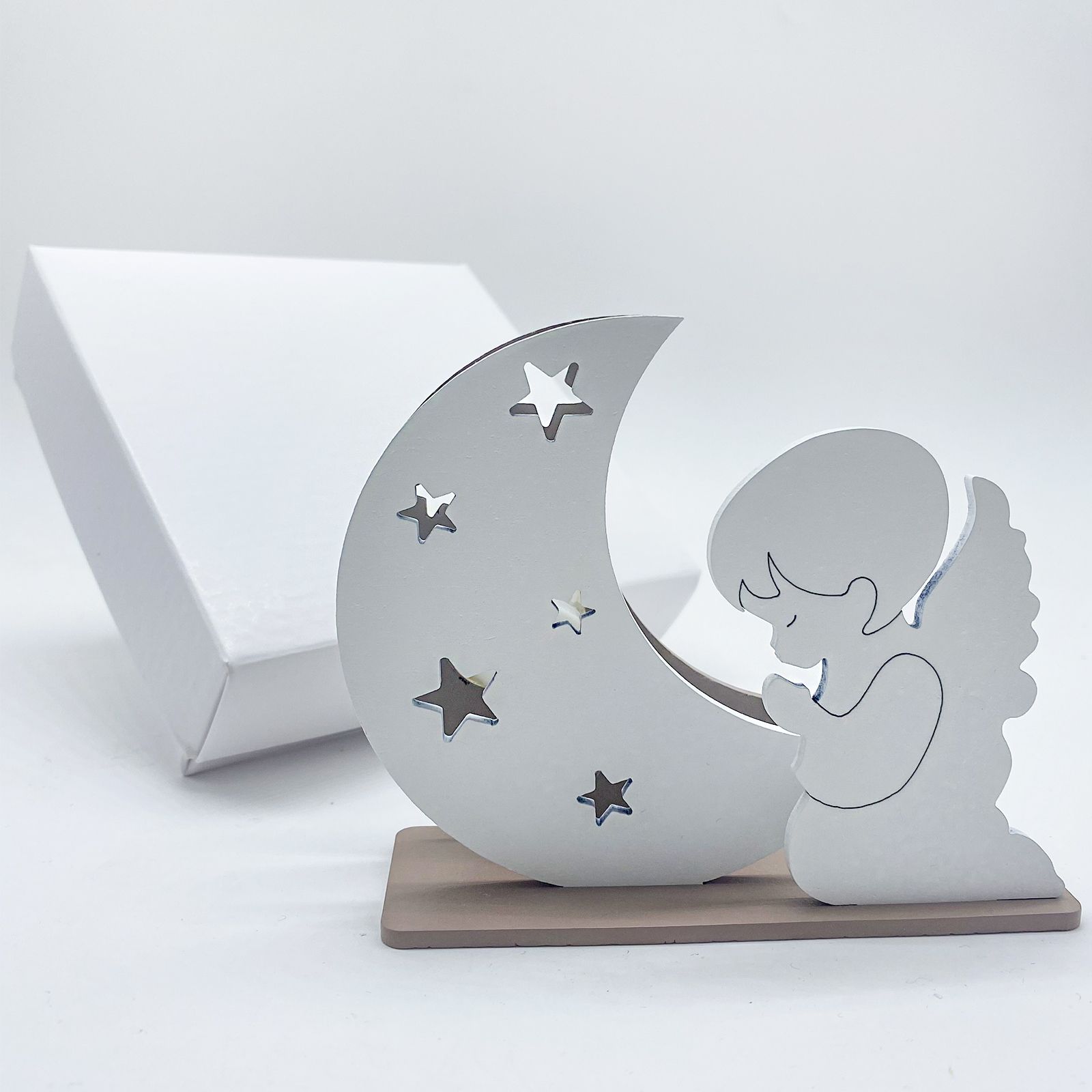 Abbiamo selezionato per te queste mini lampade da tavolo a led in legno con base e struttura in color tortora e bianco. Il modulo led è posto tra due sagome aperte a forma di falce di luna decorata con stelle traforate e di fianco, un angelo raffigurato in preghiera.