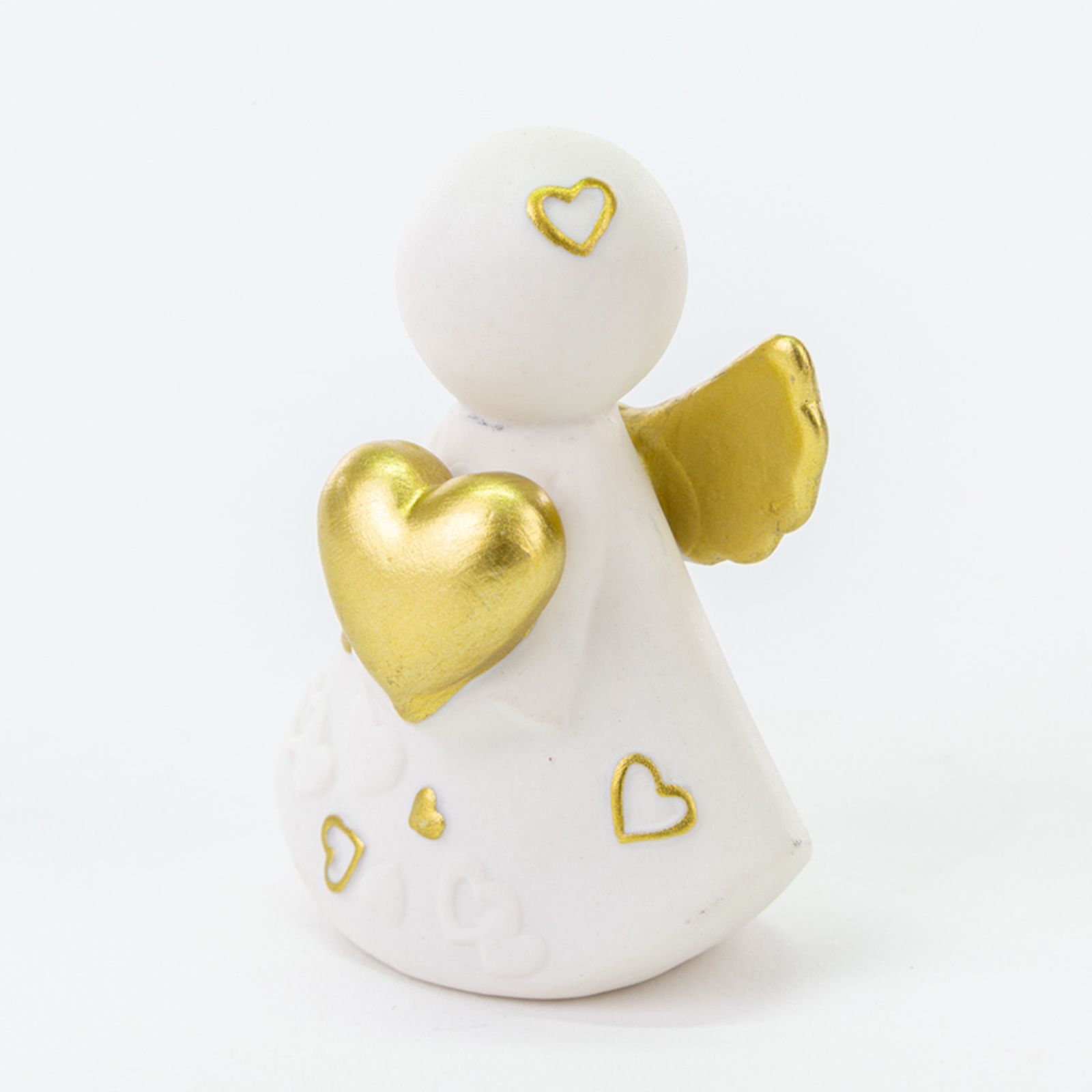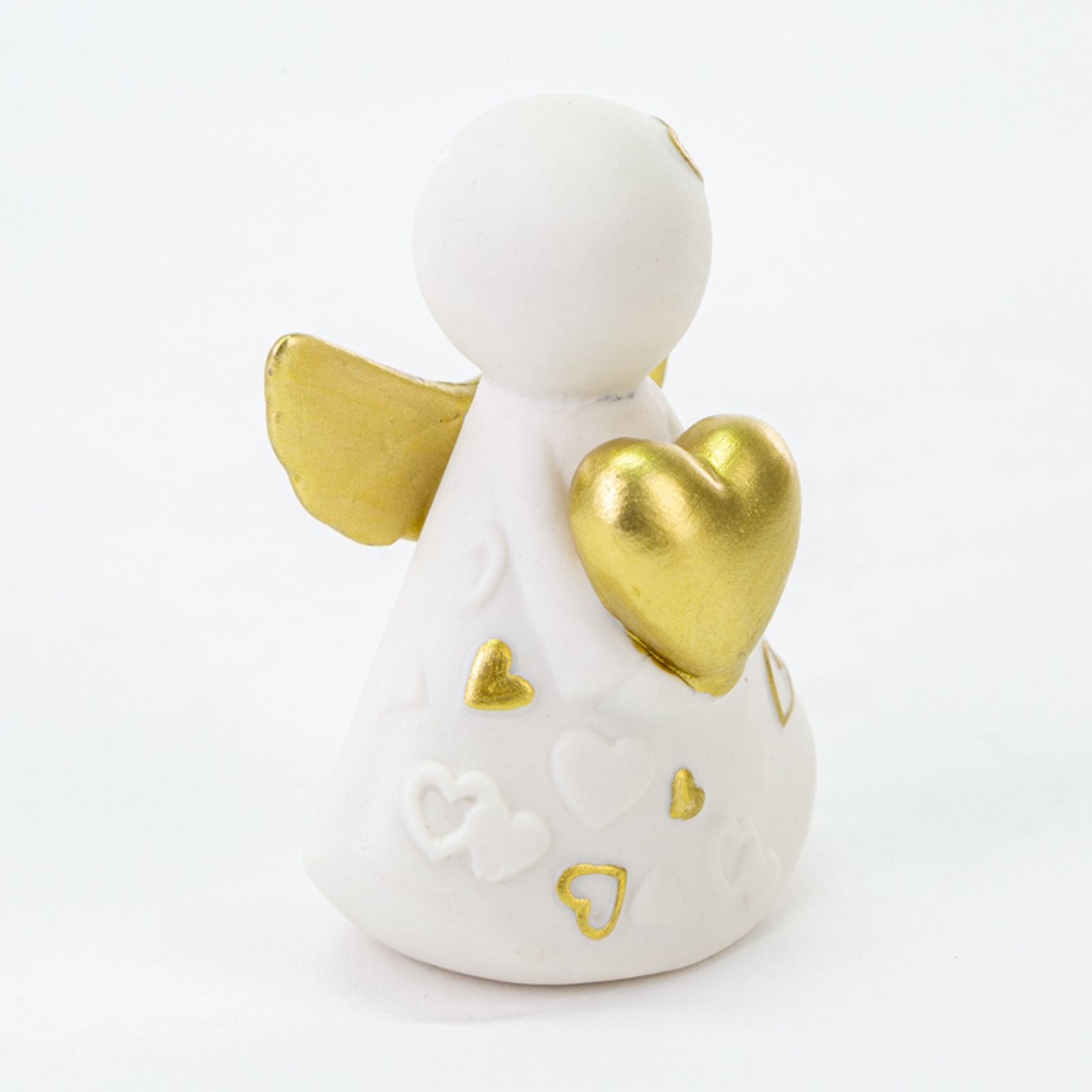 Particolarissimo angelo in porcellana stilizzato bianco con ali e cuore color oro e piccoli cuoricini dorati sulla veste.