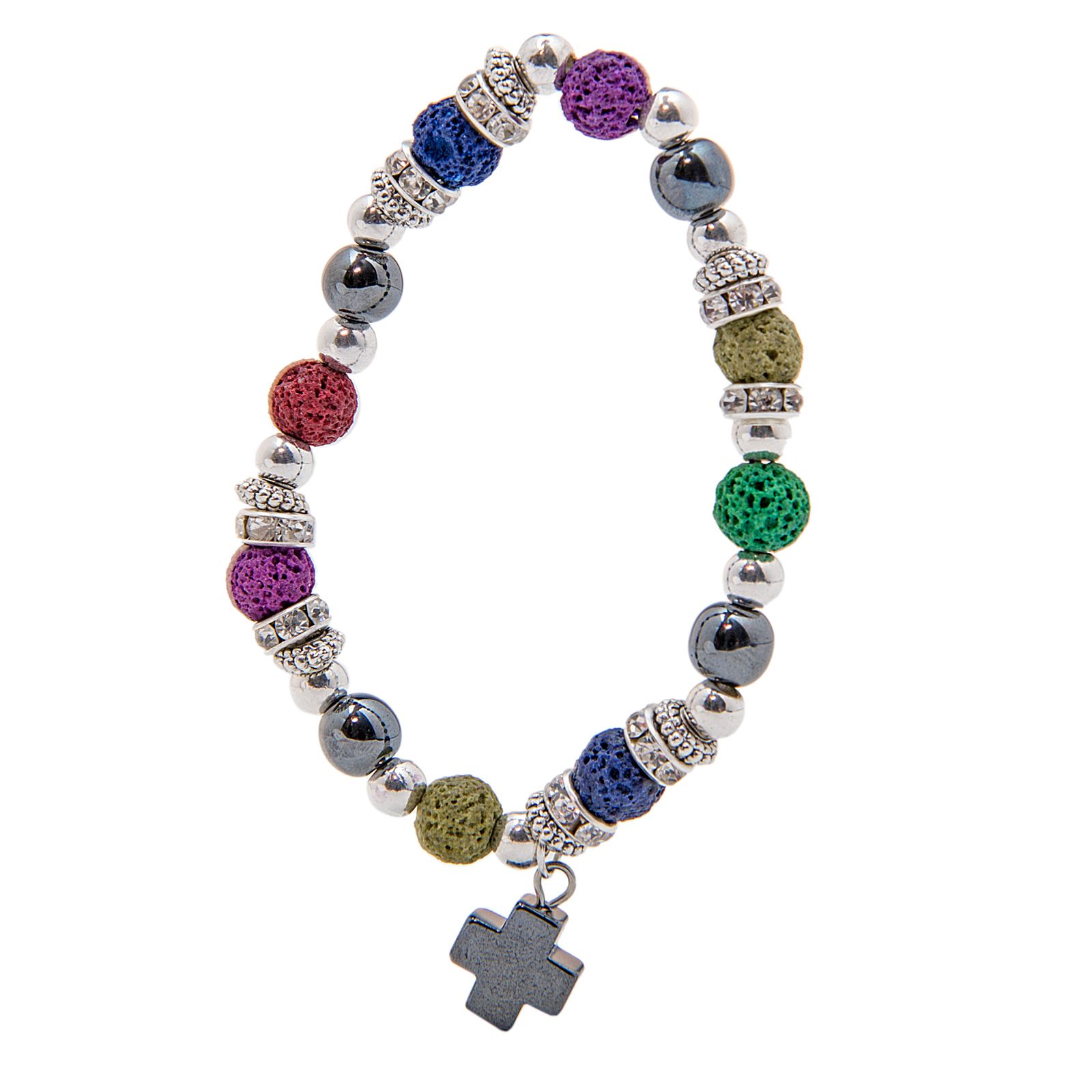 Scegli bracciali come bomboniere: braccialetto con perline in diversi colori, elastico, con charm a forma di croce greca in metallo.
