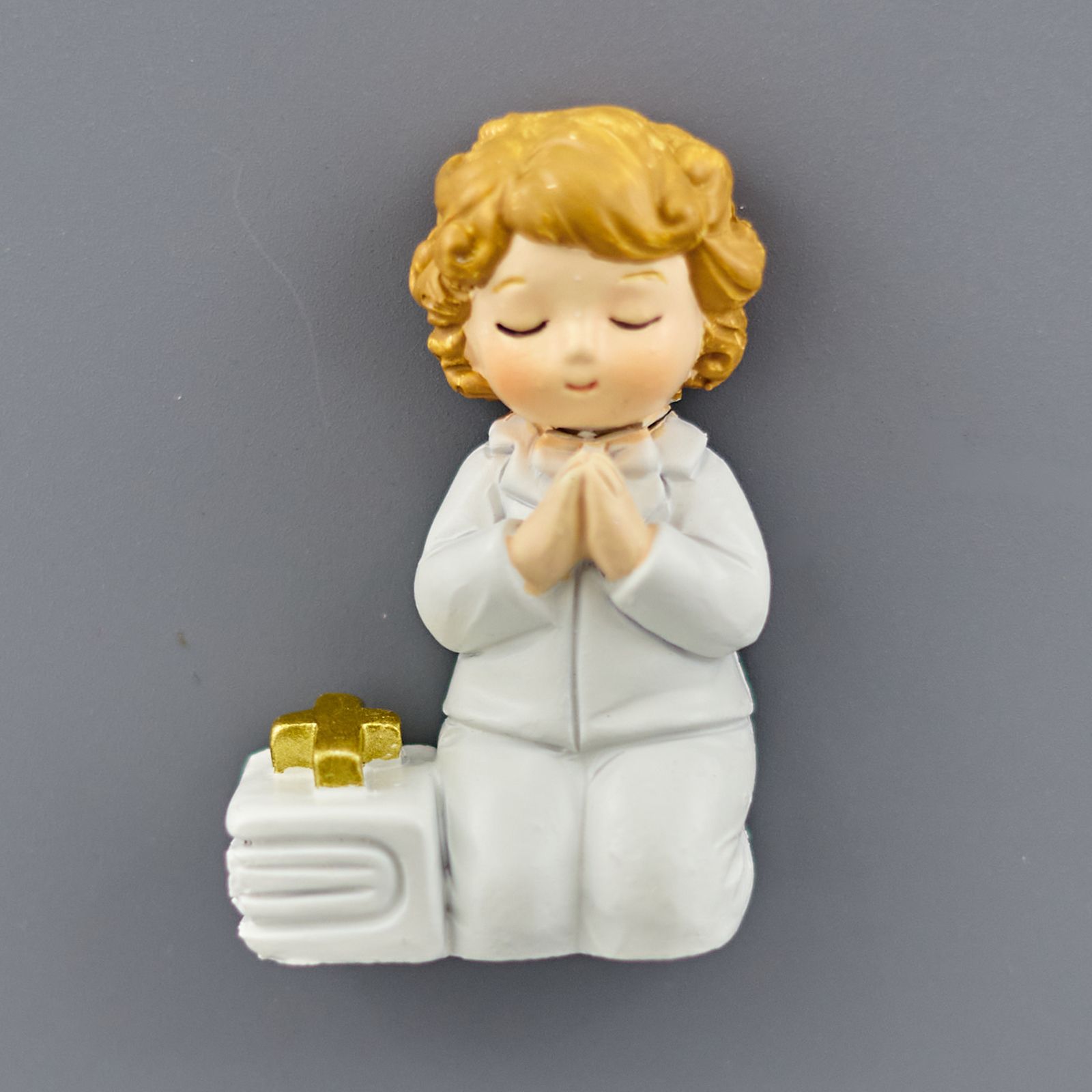 Disponibili per te i nostri magneti a forma di bambino in preghiera vestito con un saio bianco e con un vangelo con croce dorata.