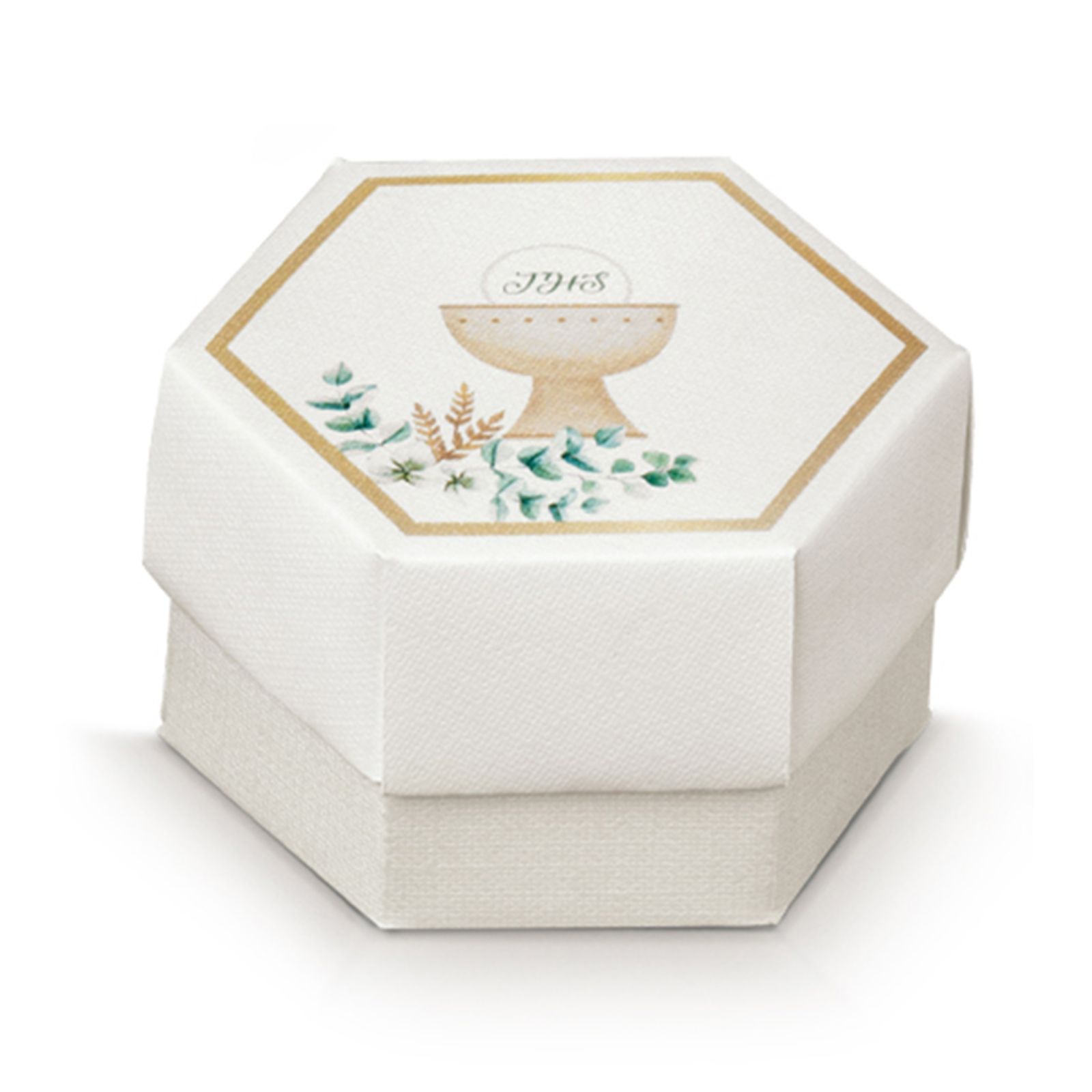 La scatolina esagonale con divisorio è la scelta perfetta per presentare con stile i tuoi confetti, dolcetti e regalini durante la Prima Comunione.