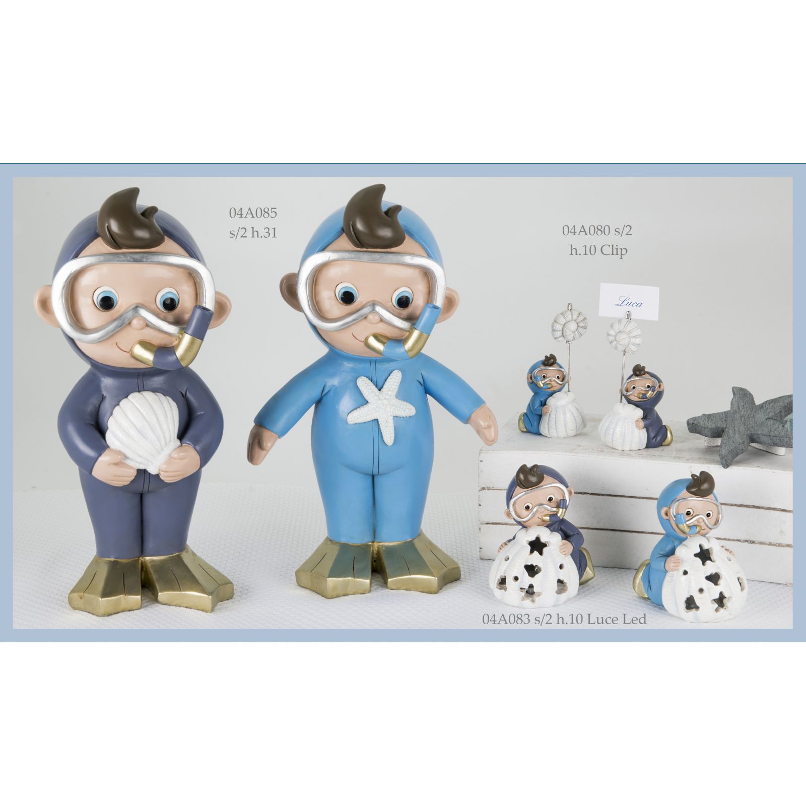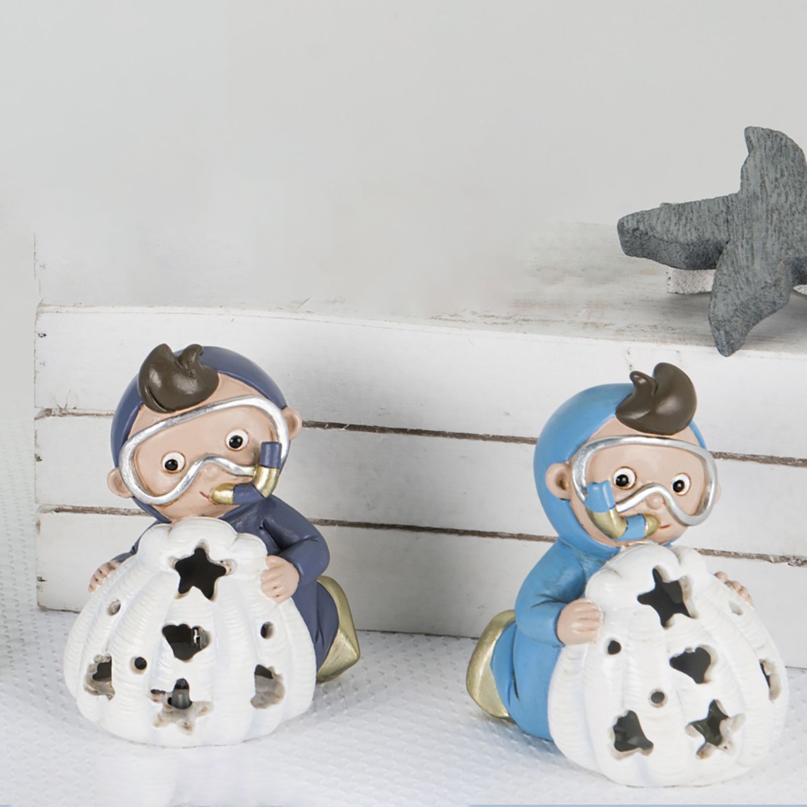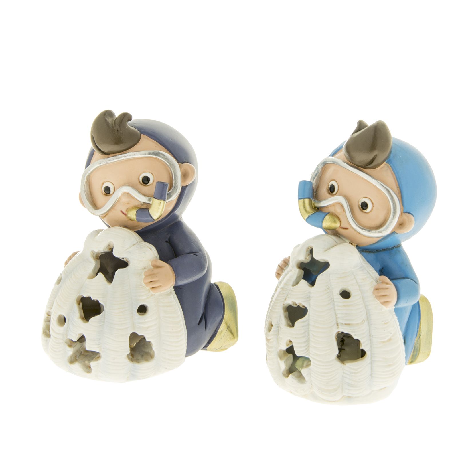 Porta un tocco magico del mare nella tua vita con la nostra Luce LED Sub. Questa affascinante lampada LED in resina a forma di conchiglia traforata è adornata da un tenero sub bimbo inginocchiato, vestito con due diverse tute blu e celeste. La lampada è completa di maschera, tubo e scarpette dorate e argento.