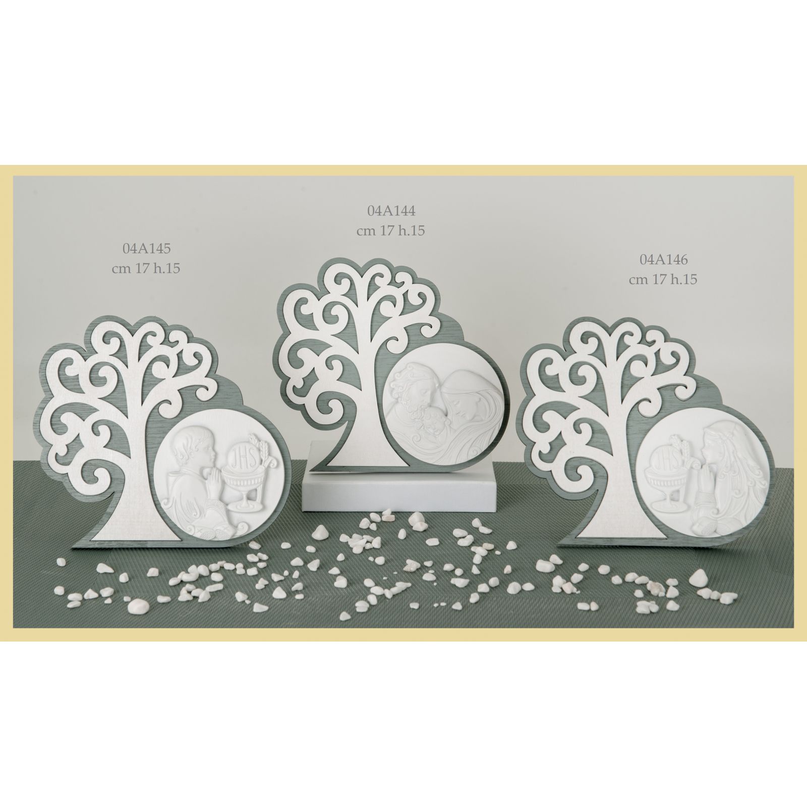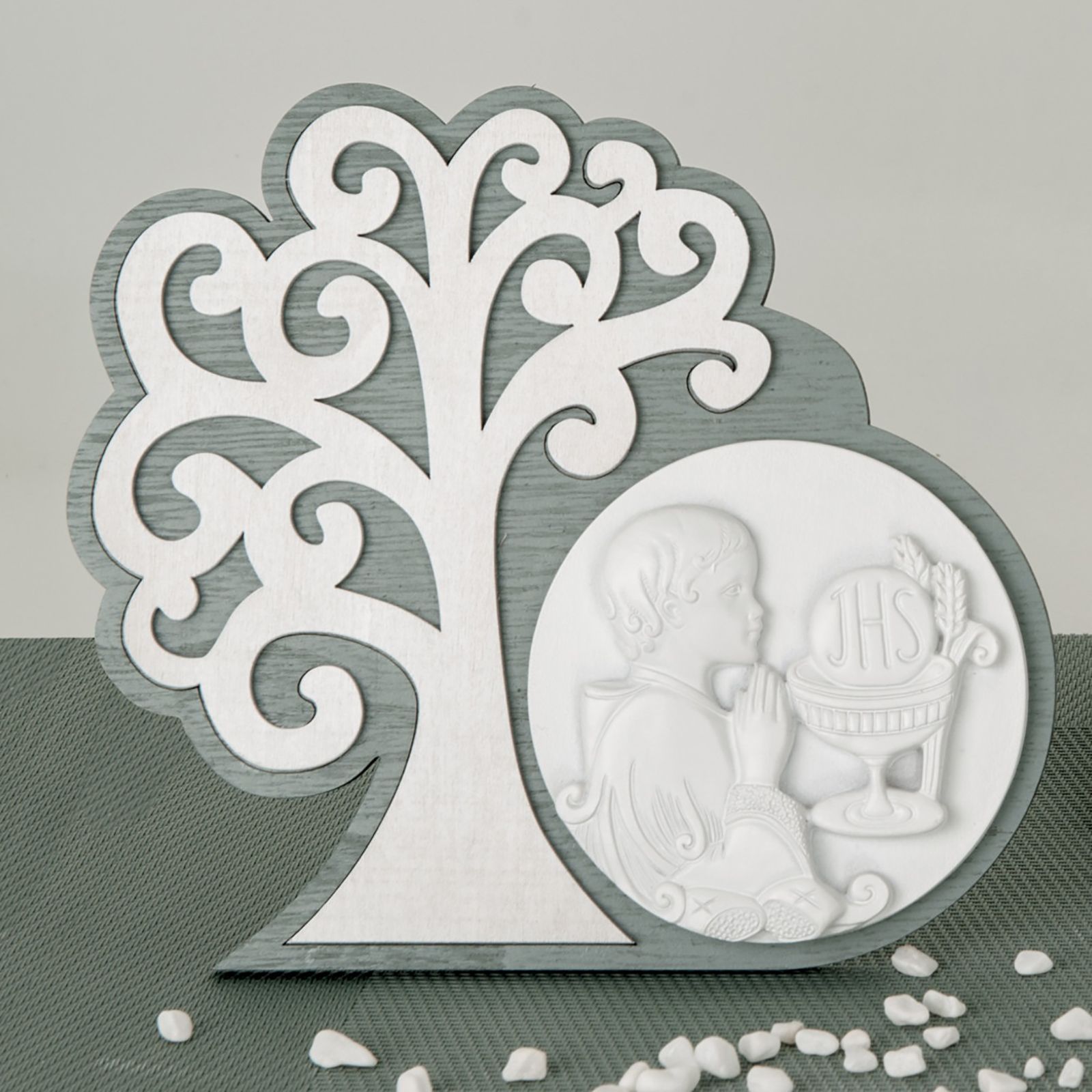 Scopri l'icona prima comunione con albero della vita in legno e resina, un dono speciale che celebra il sacramento della comunione. Questa bomboniera economica presenta una doppia base in legno, con la parte posteriore grigia e, sulla parte superiore a destra, un'icona in resina bianca che raffigura un bambino in preghiera circondato da simboli della comunione. A sinistra, troverai un albero della vita bianco in legno che rappresenta la rinascita e la vitalità spirituali.