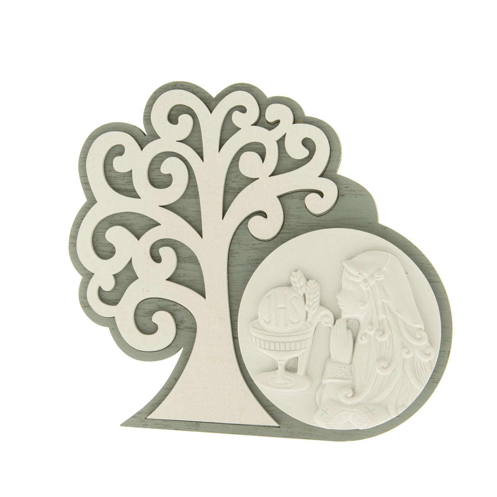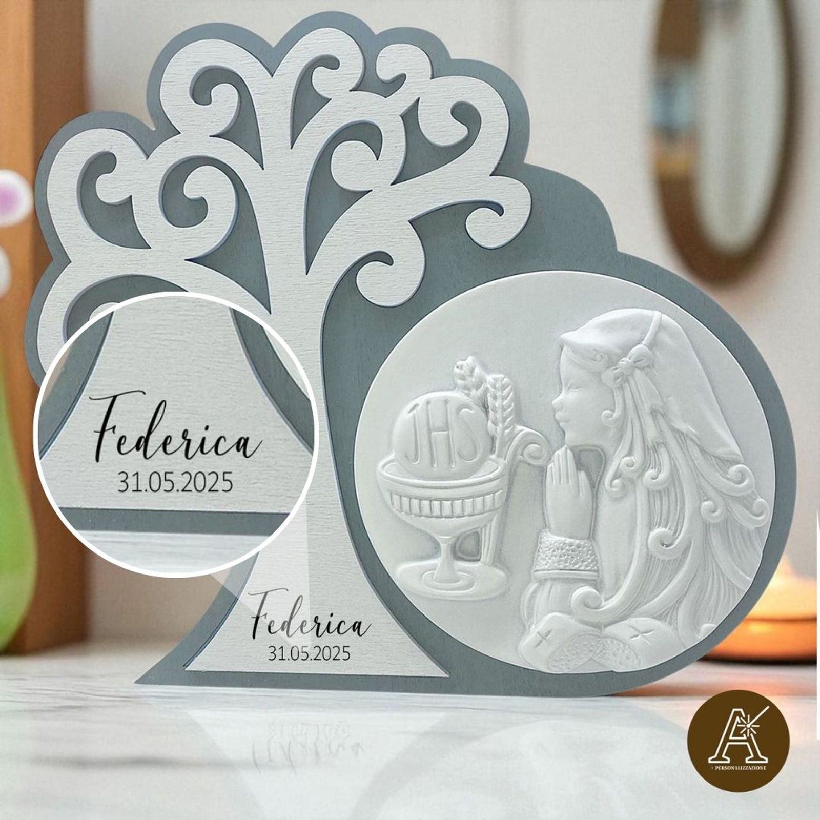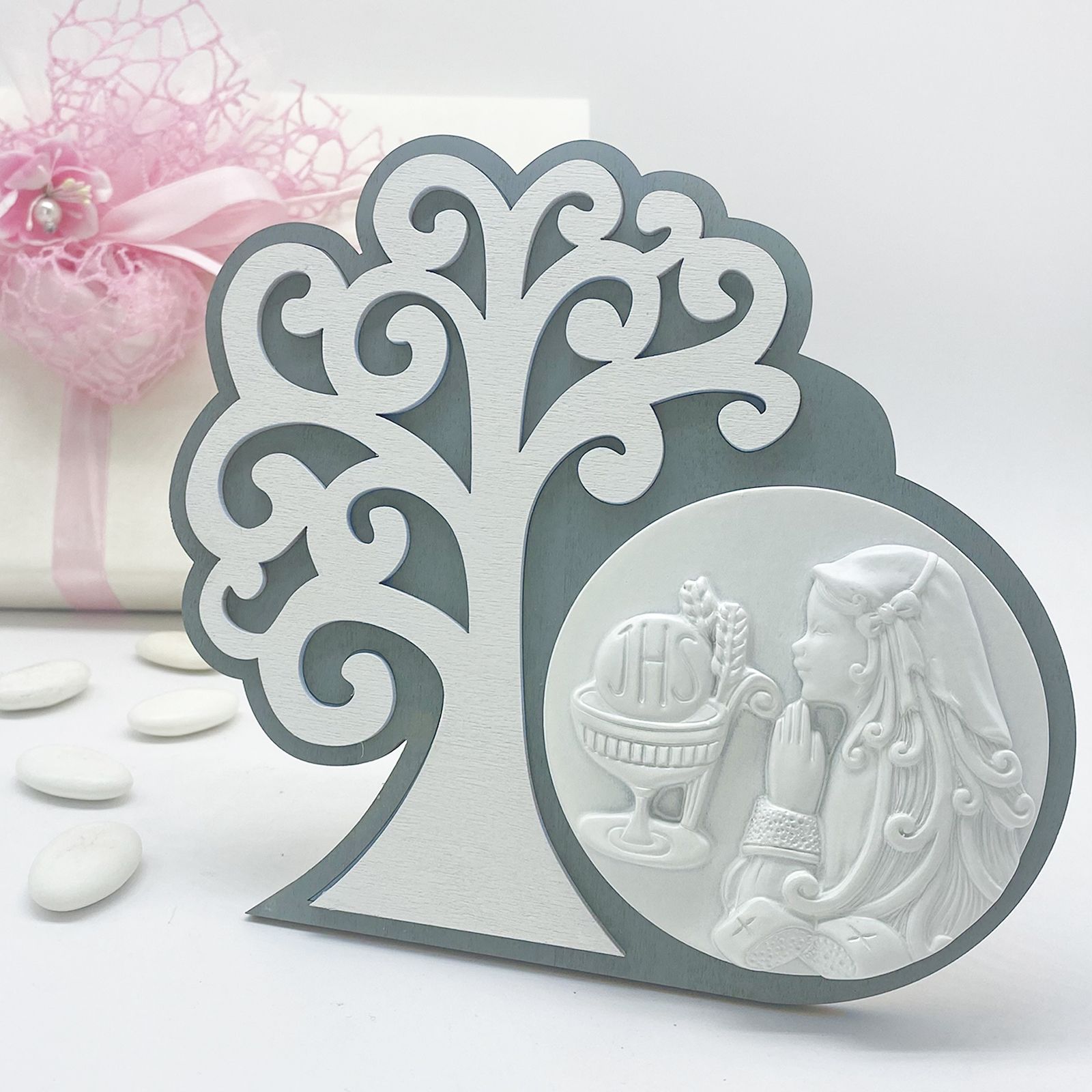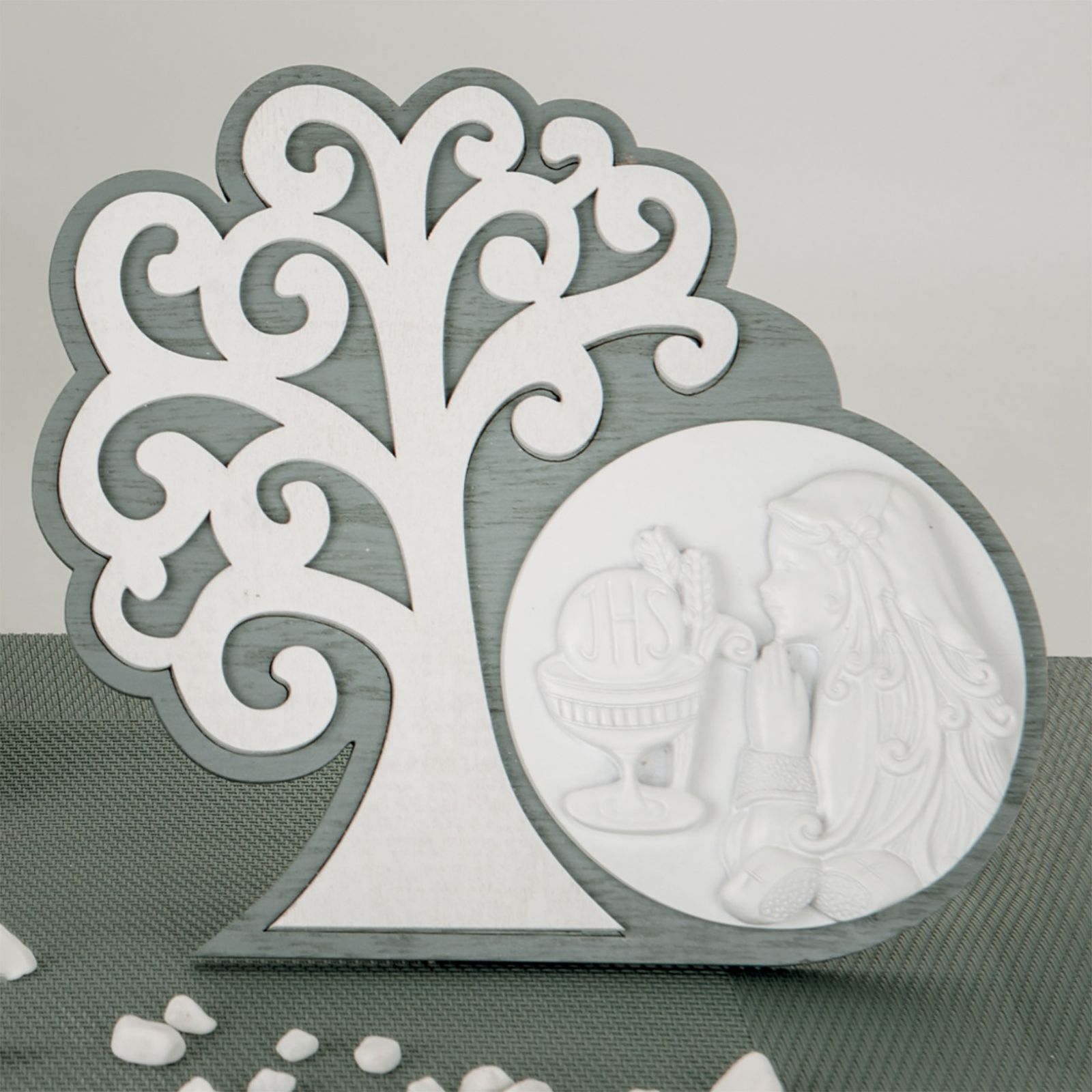Entra nell'atmosfera sacra della prima comunione con questa elegante icona in resina, accompagnata dall'albero della vita in legno. Questa bomboniera economica unica presenta una doppia base in legno, con la parte posteriore grigia e, sulla parte superiore a destra, un'elegante icona in resina bianca raffigurante una dolce bambina in preghiera circondata dai simboli sacri della comunione. Sulla sinistra si trova un albero della vita bianco in legno, simbolo di vitalità spirituale e rinnovamento.