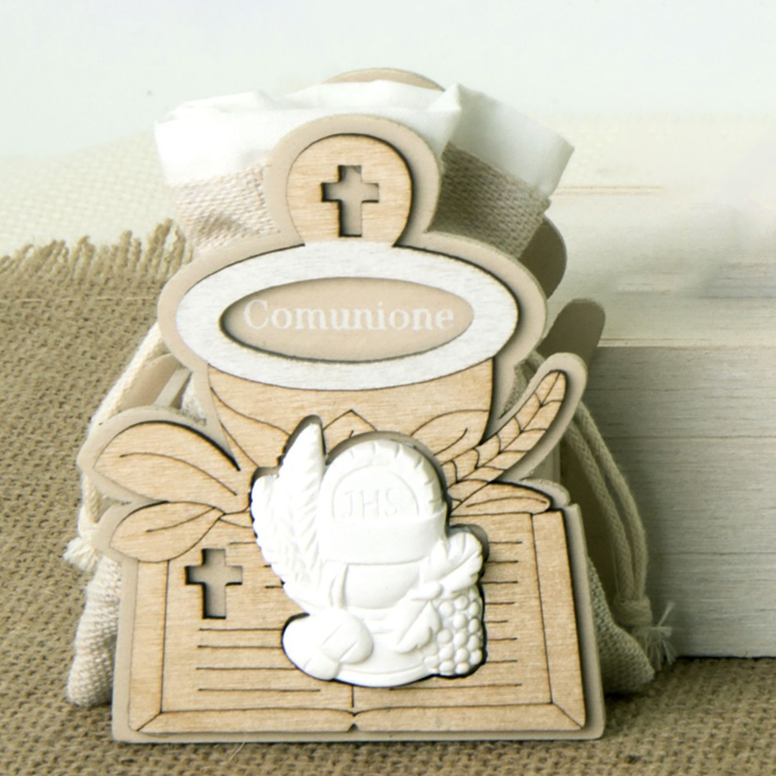 Scegli il dono perfetto per festeggiare il sacramento della Prima Comunione. Questo eccezionale portaconfetti è creato con una struttura in legno che rappresenta un calice con il vangelo e l'incisione "Comunione". Al centro, è attaccato un gessetto bianco a forma di calice e ostia. Il portaconfetti è accompagnato da un sacchettino in juta, completato con un bordino bianco e tiranti, ideale per contenere i deliziosi confetti.
