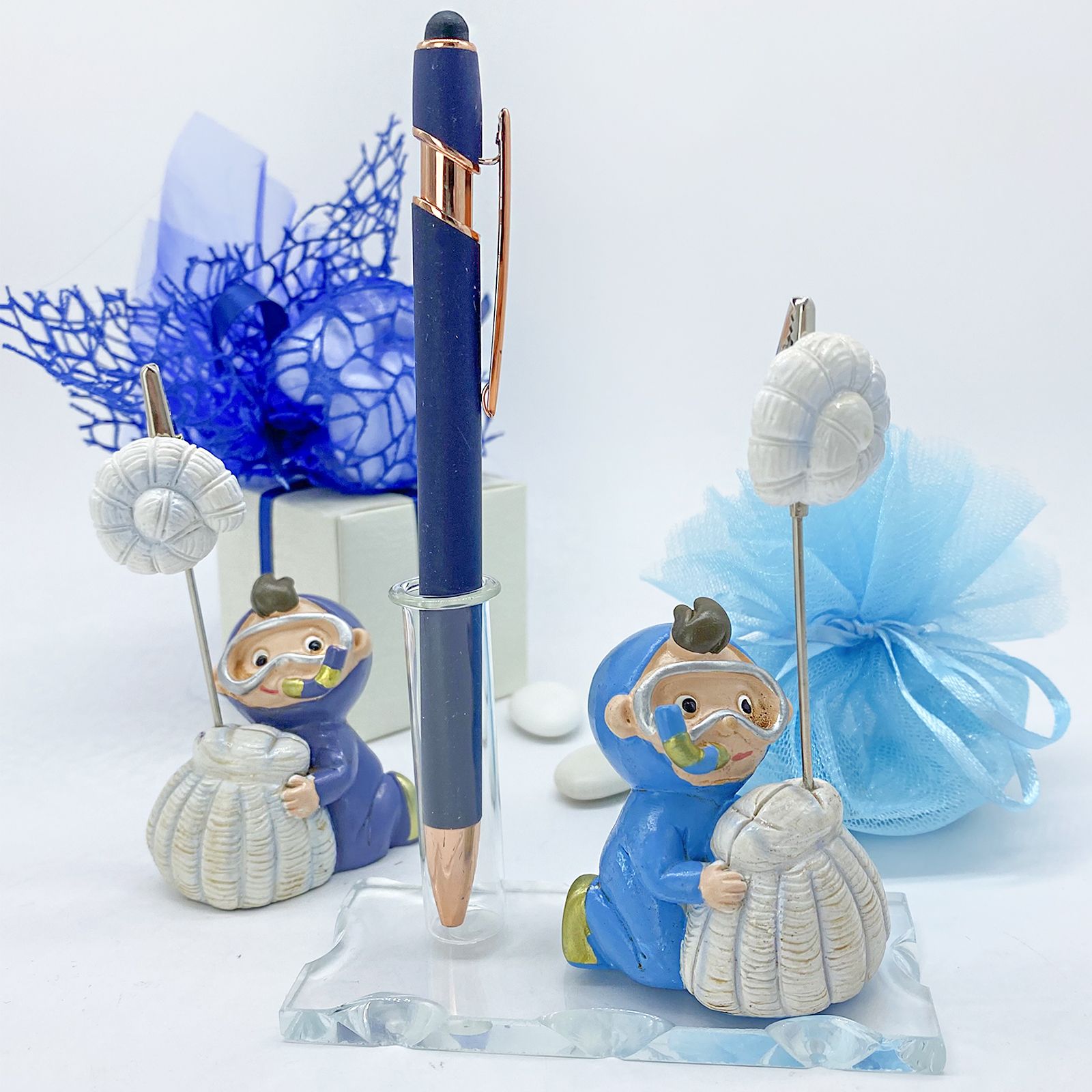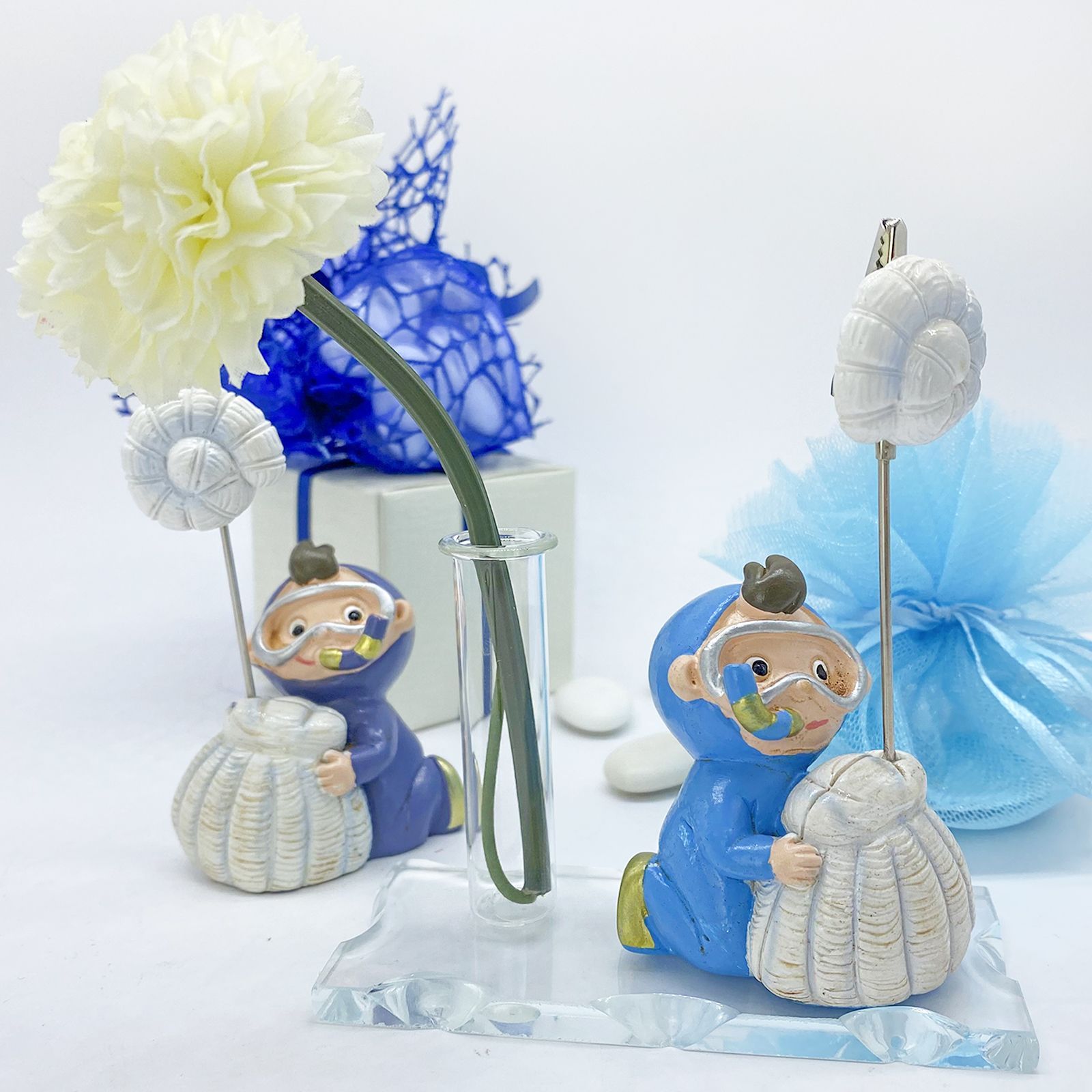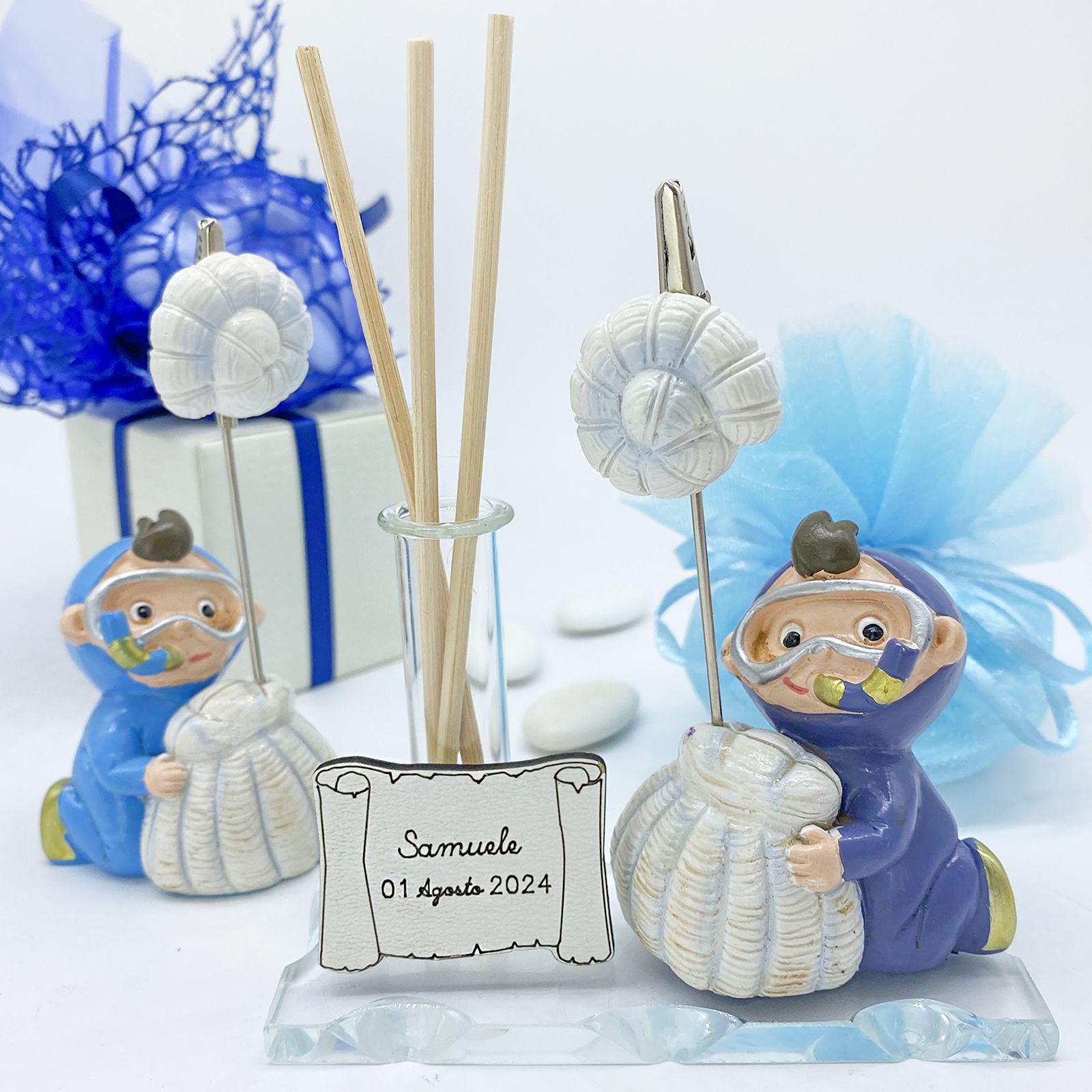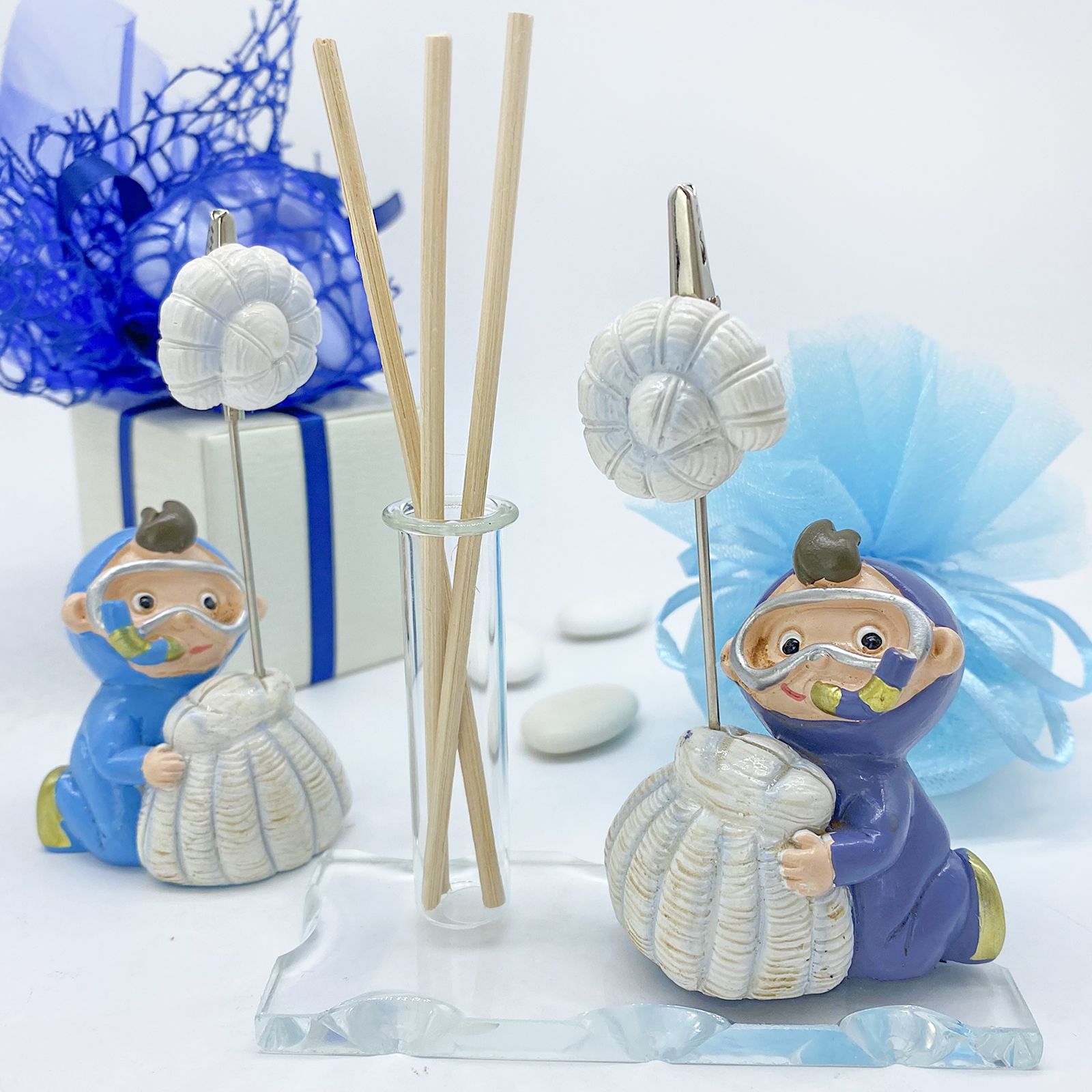 Questa bomboniera economica "Base in Vetro con Fiala Profumatore, Monofiore, Porta Penna e Memoclip Sub" è un'originale e affascinante scelta per celebrare eventi speciali come battesimo, comunione, cresima o matrimonio a tema mare .Con un design unico e dettagli curati, sarà un regalo apprezzato da genitori, amici e parenti, in particolare da coloro che amano il mare e tutto ciò che lo rappresenta.