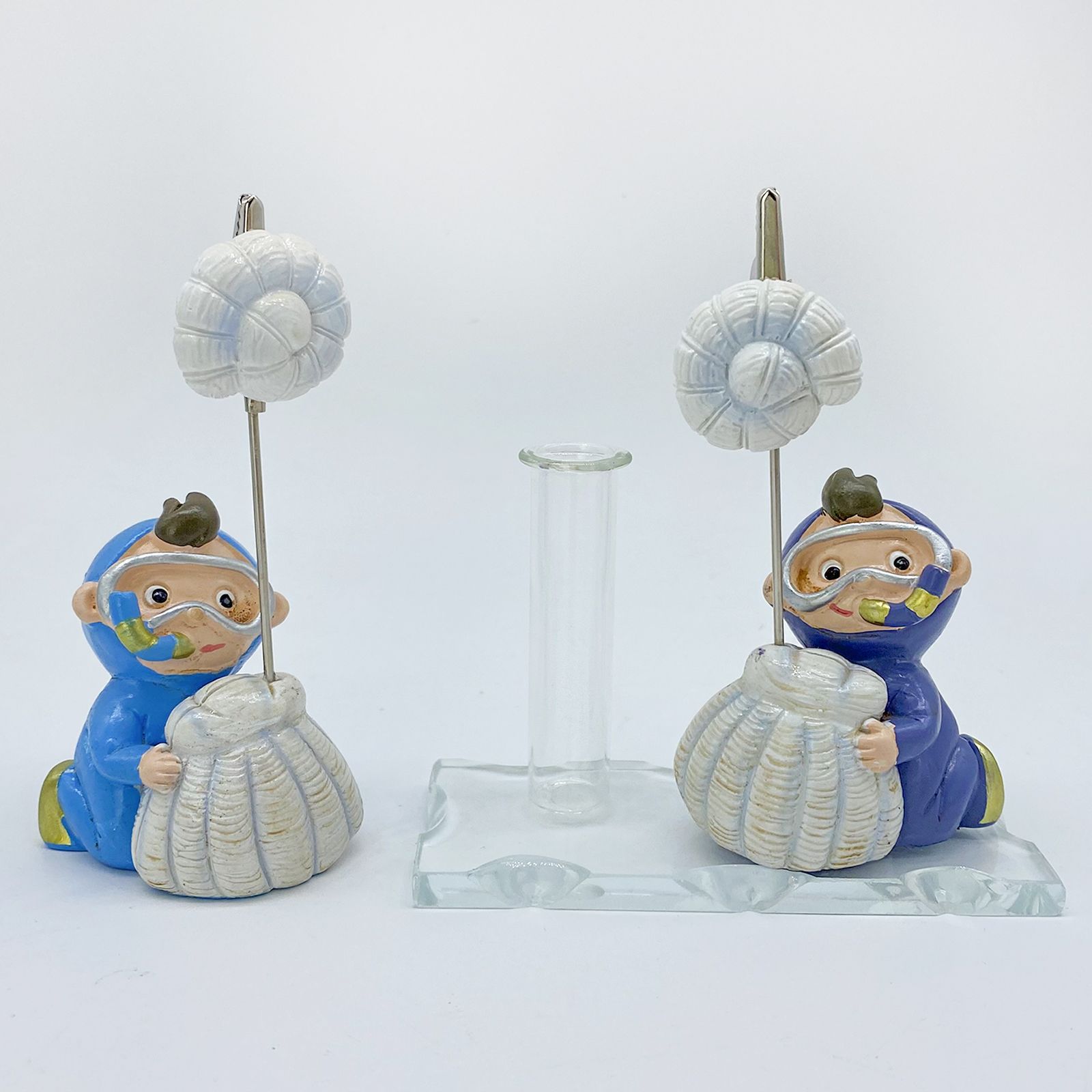 La base in vetro soffiato, intagliata con maestria, offre un supporto solido e raffinato per gli elementi che la compongono. La fiala profumatore può essere utilizzata anche come porta penne o monofiore, offrendo versatilità e funzionalità. Accanto alla base in vetro, troverai dei memoclip sub realizzati in resina assortiti in due varianti: un sub con tuta azzurra e un sub con tuta blu, entrambi indossano scarpe dorate, maschera e tubo. L'asta in metallo è arricchita da una conchiglia a forma di spirale.