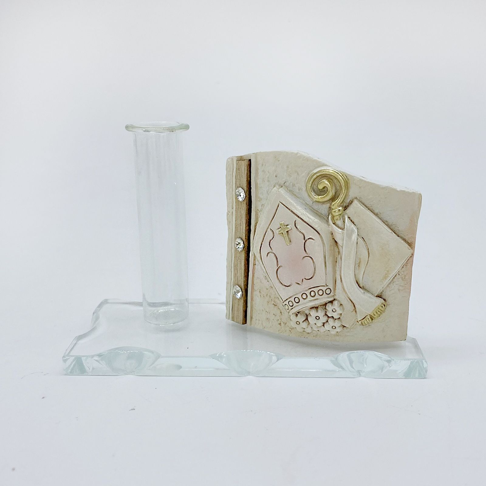 Scopri la nostra bomboniera economica unica, ideale per la cresima. La base in vetro intagliato presenta un'ampolla multifunzionale, utilizzabile come profumatore, porta penna o monofiore. Accanto troverai un'icona della Cresima, realizzata in pregiata resina e legno con dettagli strass.