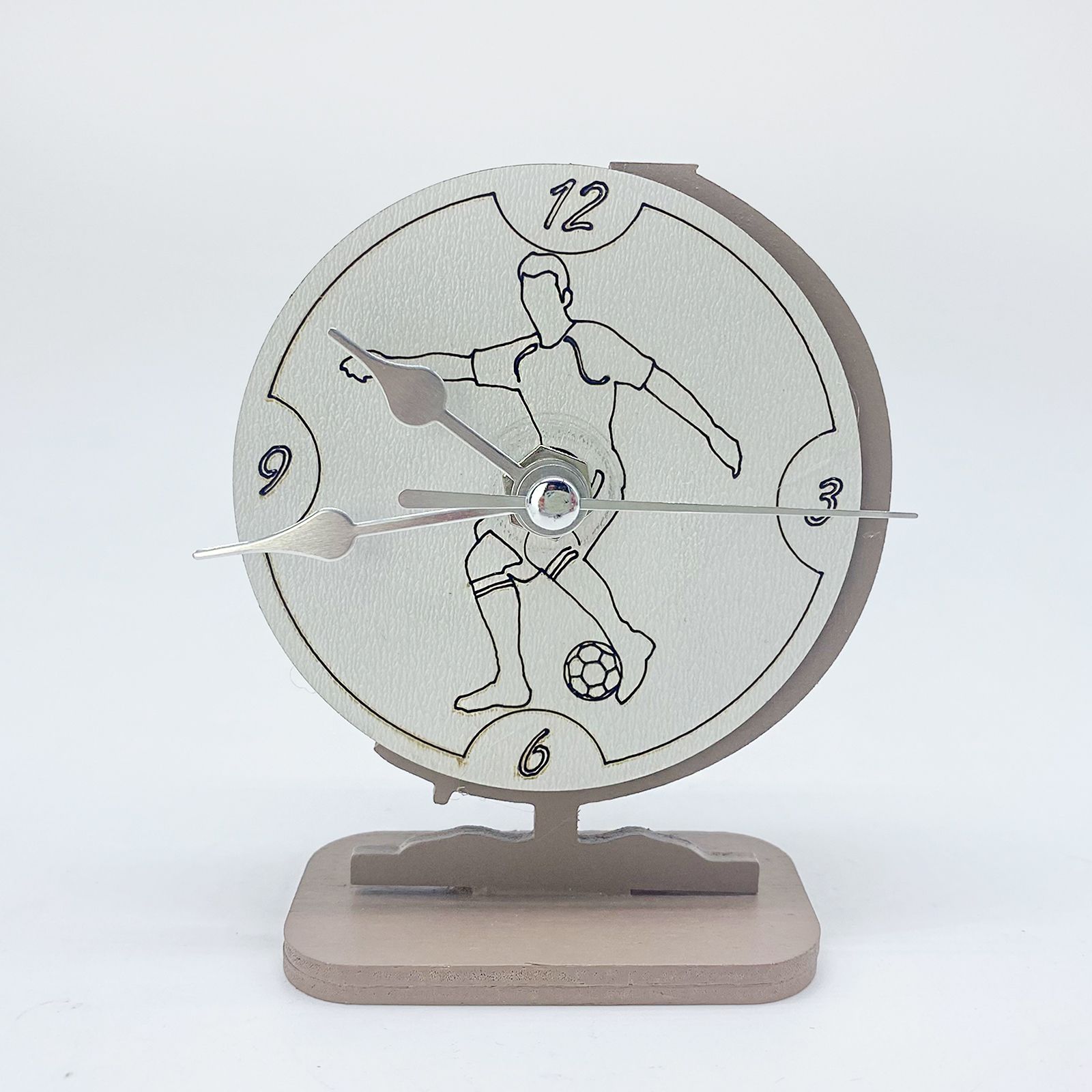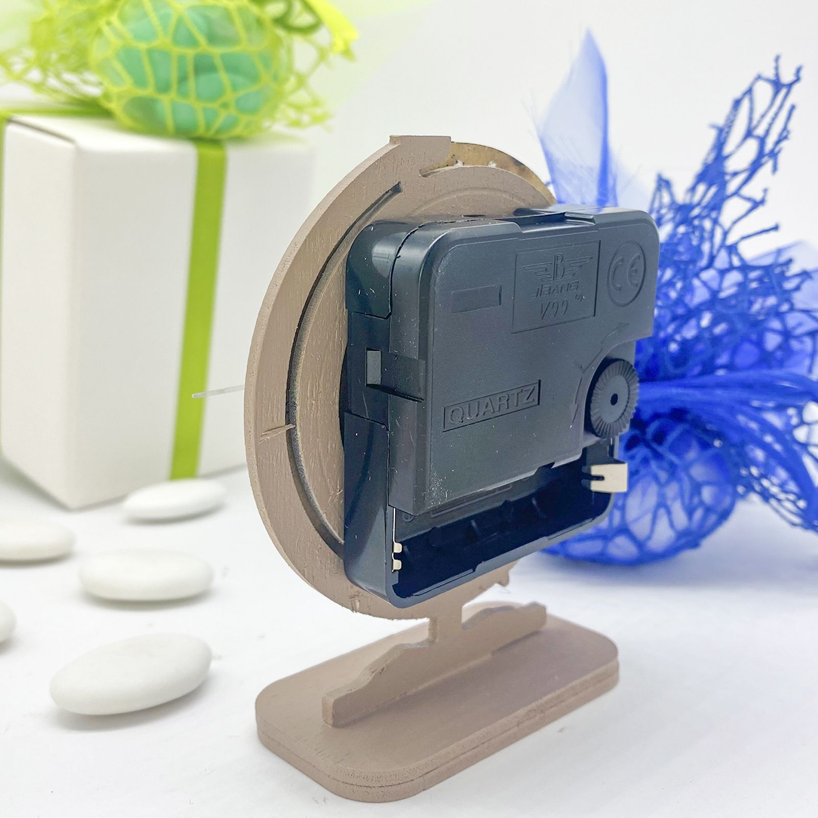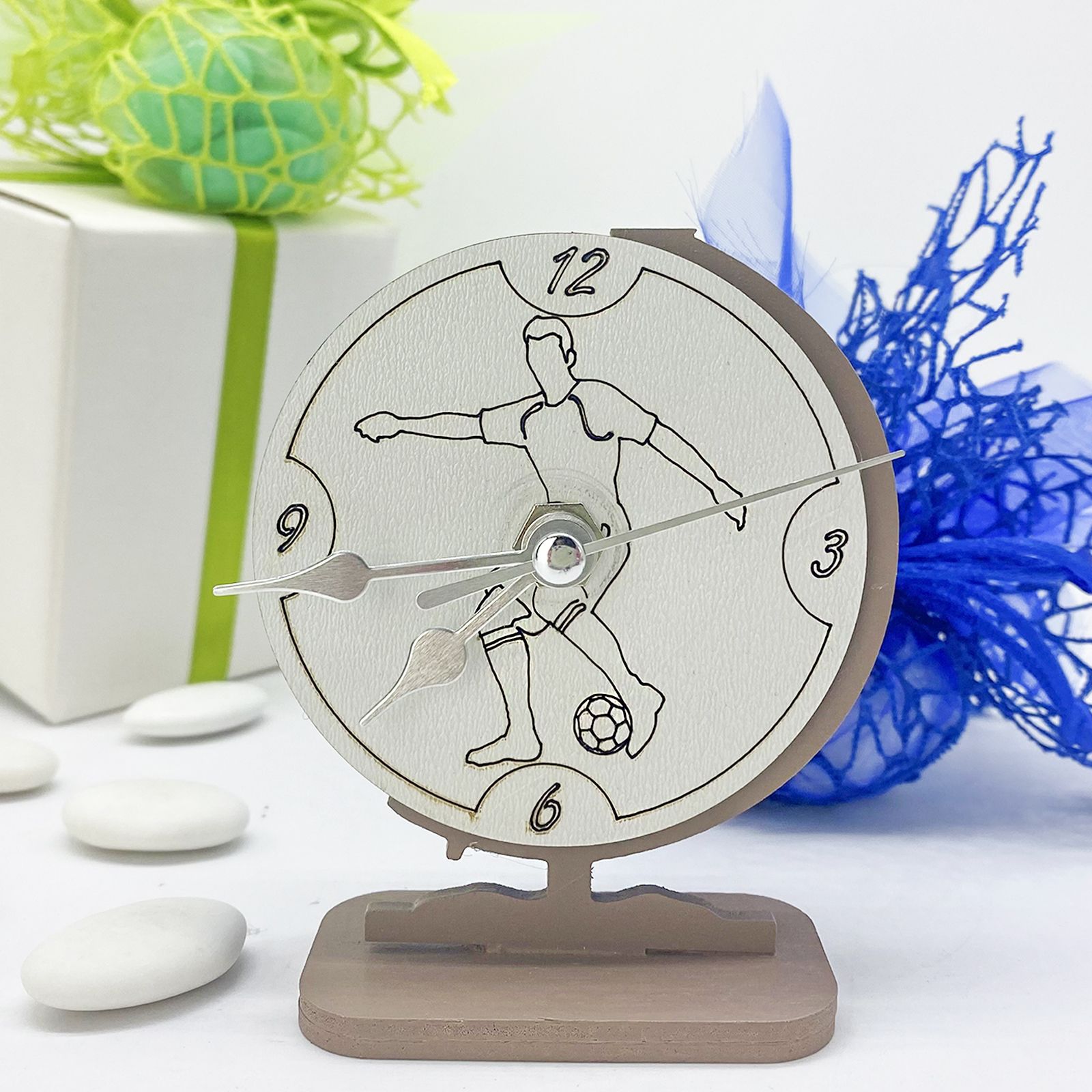 Questo orologio da tavolo di forma rotonda, con base in legno color tortora e dettagli in bianco ottico, è compatto e non ingombrante, perfetto per qualsiasi casa o studio. L'orologio presenta lancette in metallo e funziona con una batteria AA da 1,5 volt (non inclusa). Arriverà completo di un astuccio regalo, incluso nel prezzo, pronto per essere presentato con orgoglio ai tuoi amici e parenti. Ciò che rende questa bomboniera economica ma originale, davvero unica è il calciatore intagliato con cura, al centro dell'orologio. Indossa la sua divisa completa, con magliettina, pantaloncini e calzettone, mentre calcia il suo pallone. Questo dettaglio rende questa bomboniera perfetta anche per gli amanti dello sport e del calcio.