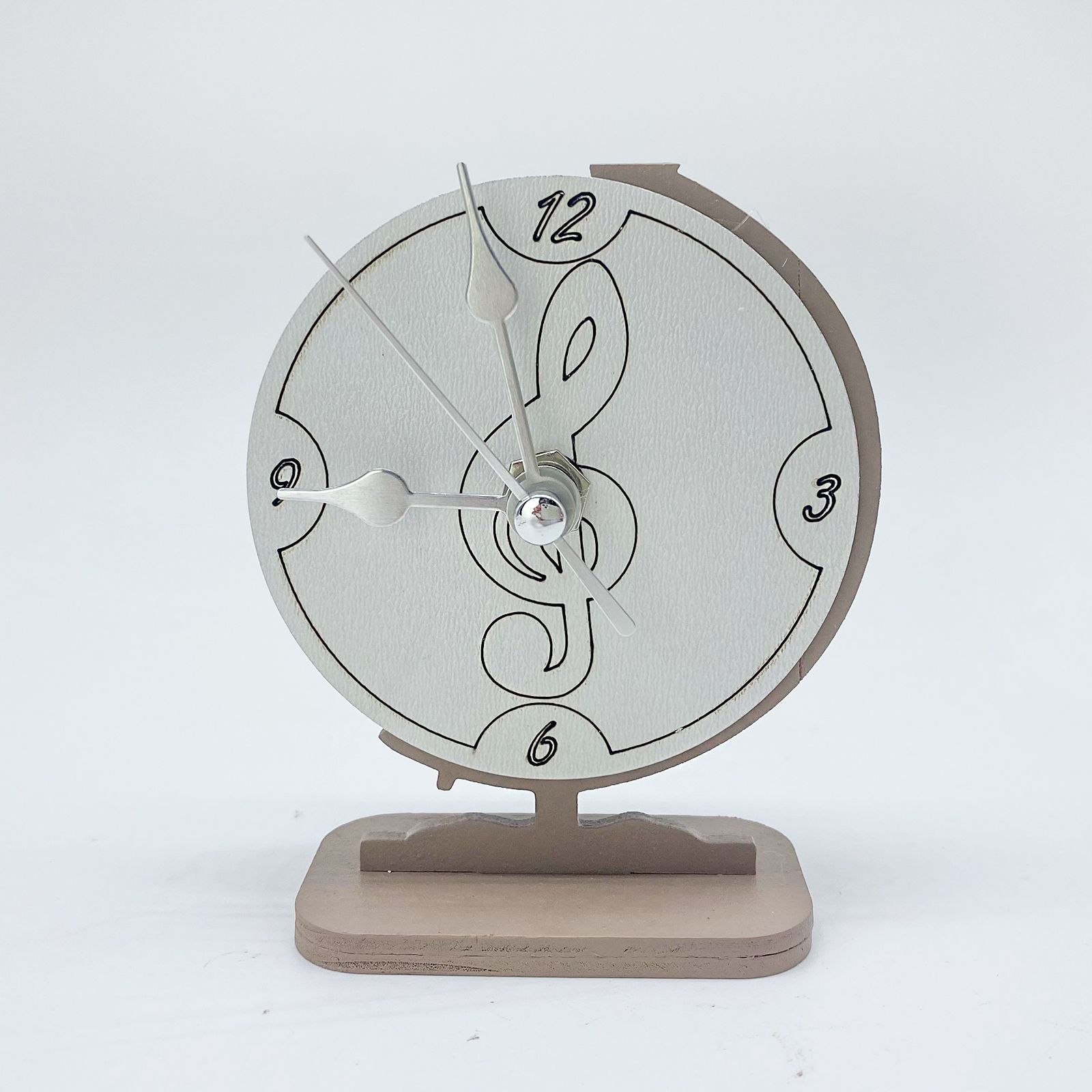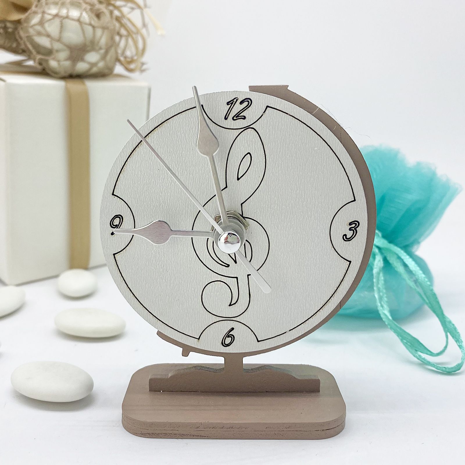 La chiave musicale disegnata al centro, da cui partono le lancette, aggiunge un tocco di fascino musicale al suo design. La base e la struttura in legno color tortora sono arricchite da un effetto doppiato con sovrapposizione in rilievo in tonalità bianco ottico, donando un aspetto elegante e raffinato. Le lancette dell'orologio, realizzate in metallo, si muovono silenziosamente grazie a una batteria AA da 1,5 volts (non inclusa). Questa bomboniera è un regalo ideale per celebrare eventi speciali per bambini o ragazzi di entrambi i sessi.