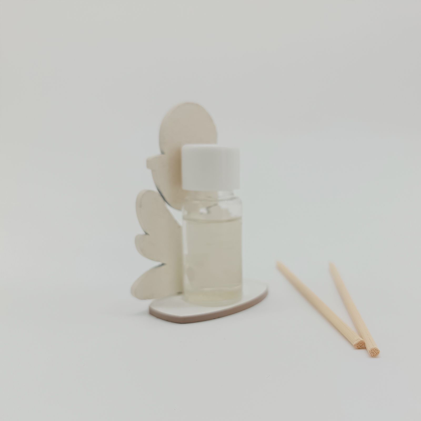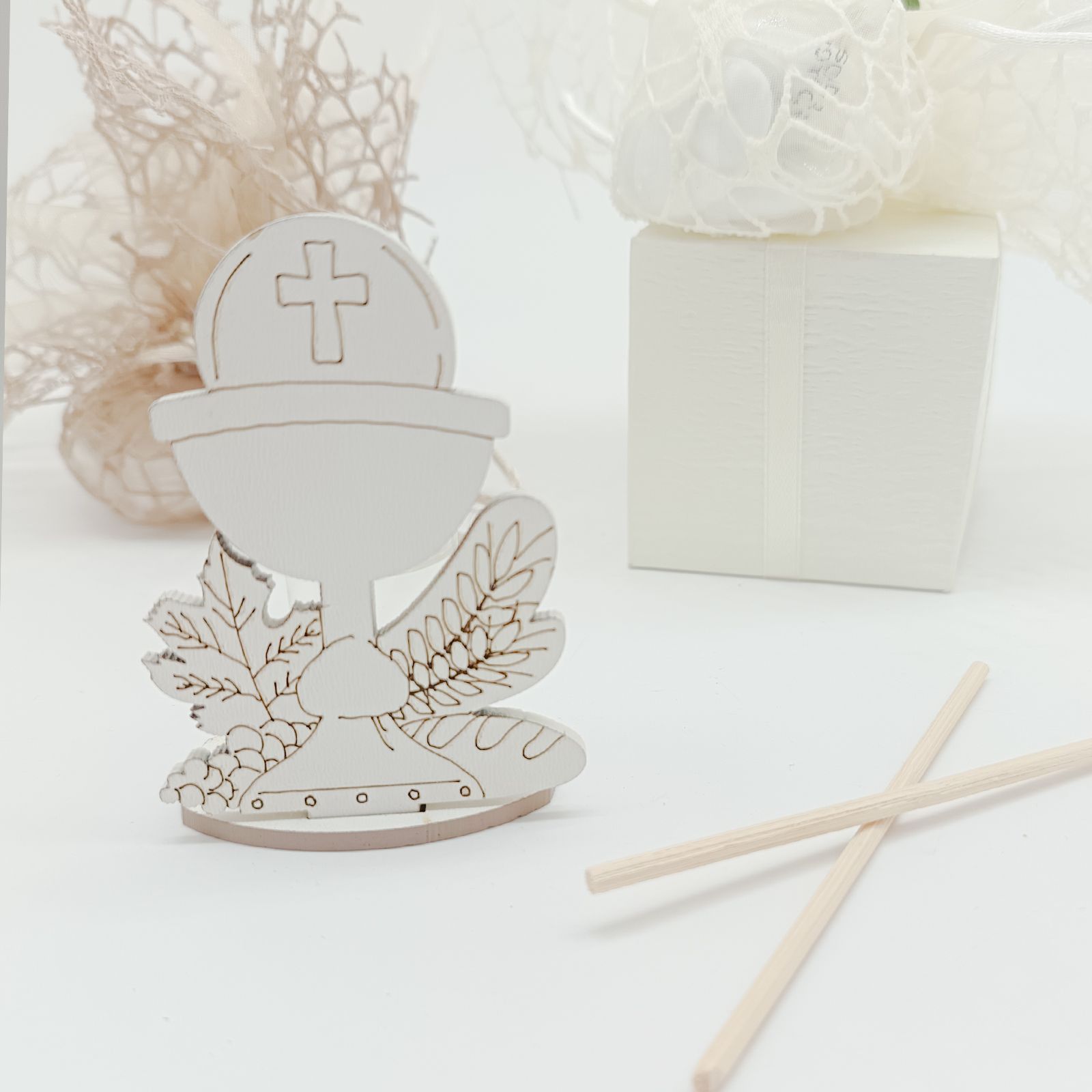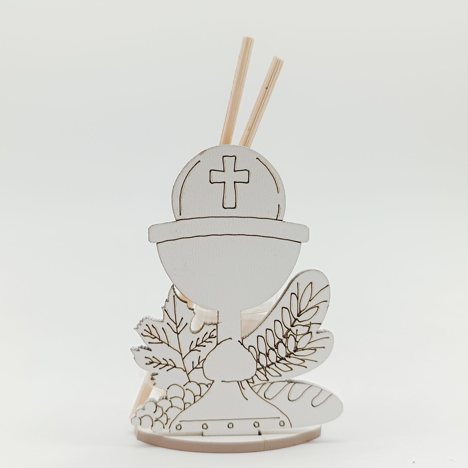 Realizzato in legno bianco, questo mini profumatore ha una base tortora che ospita i simboli sacri della prima comunione, come il calice e l'ostia. Le bacchette e l'essenza completano il set, garantendo una diffusione delicata e piacevole della fragranza.