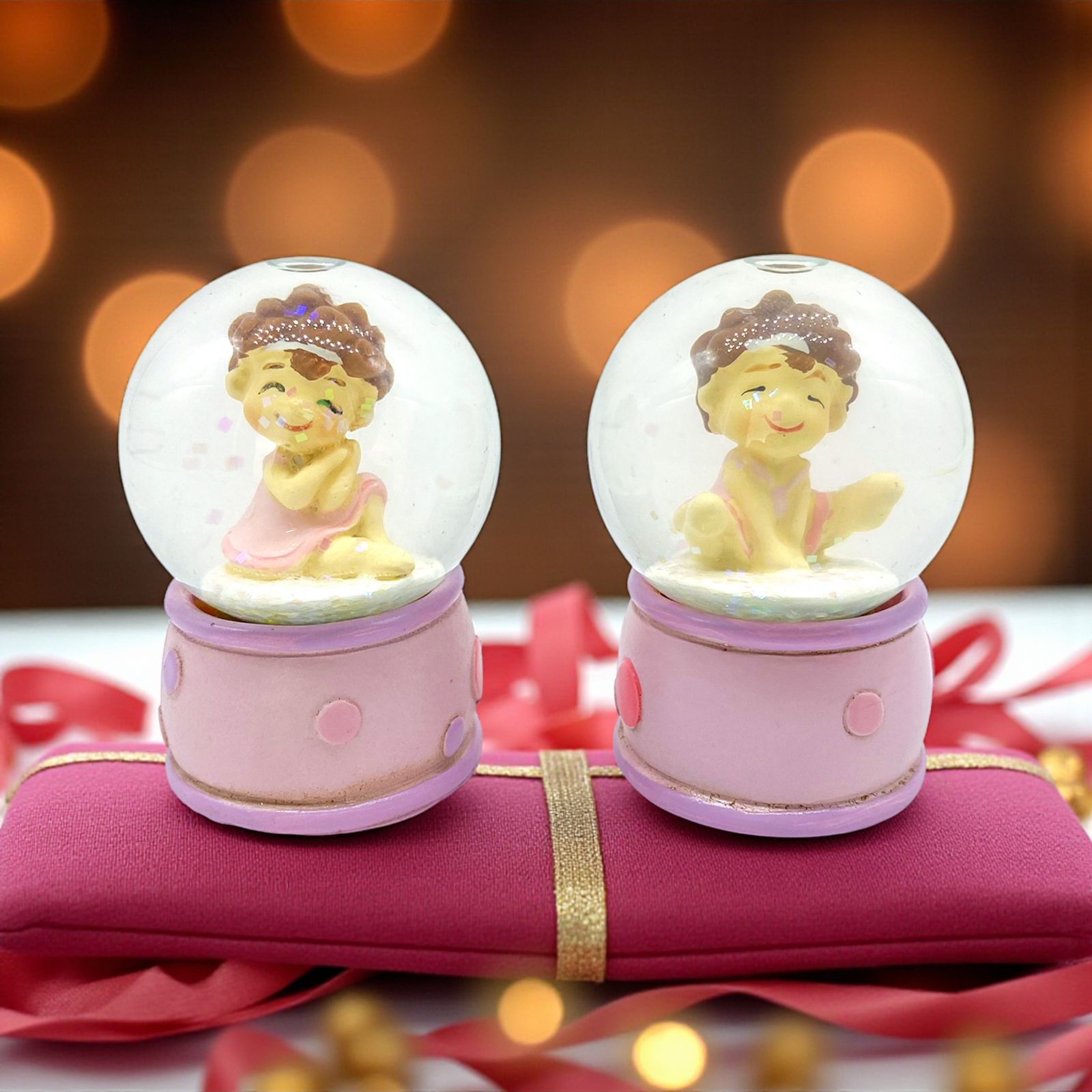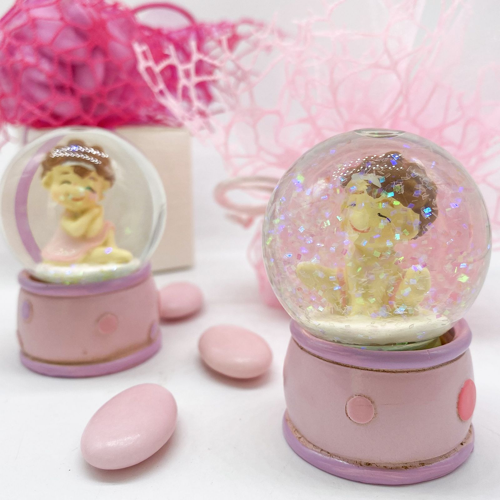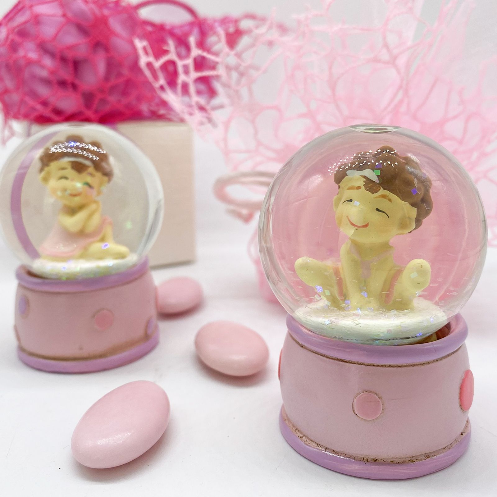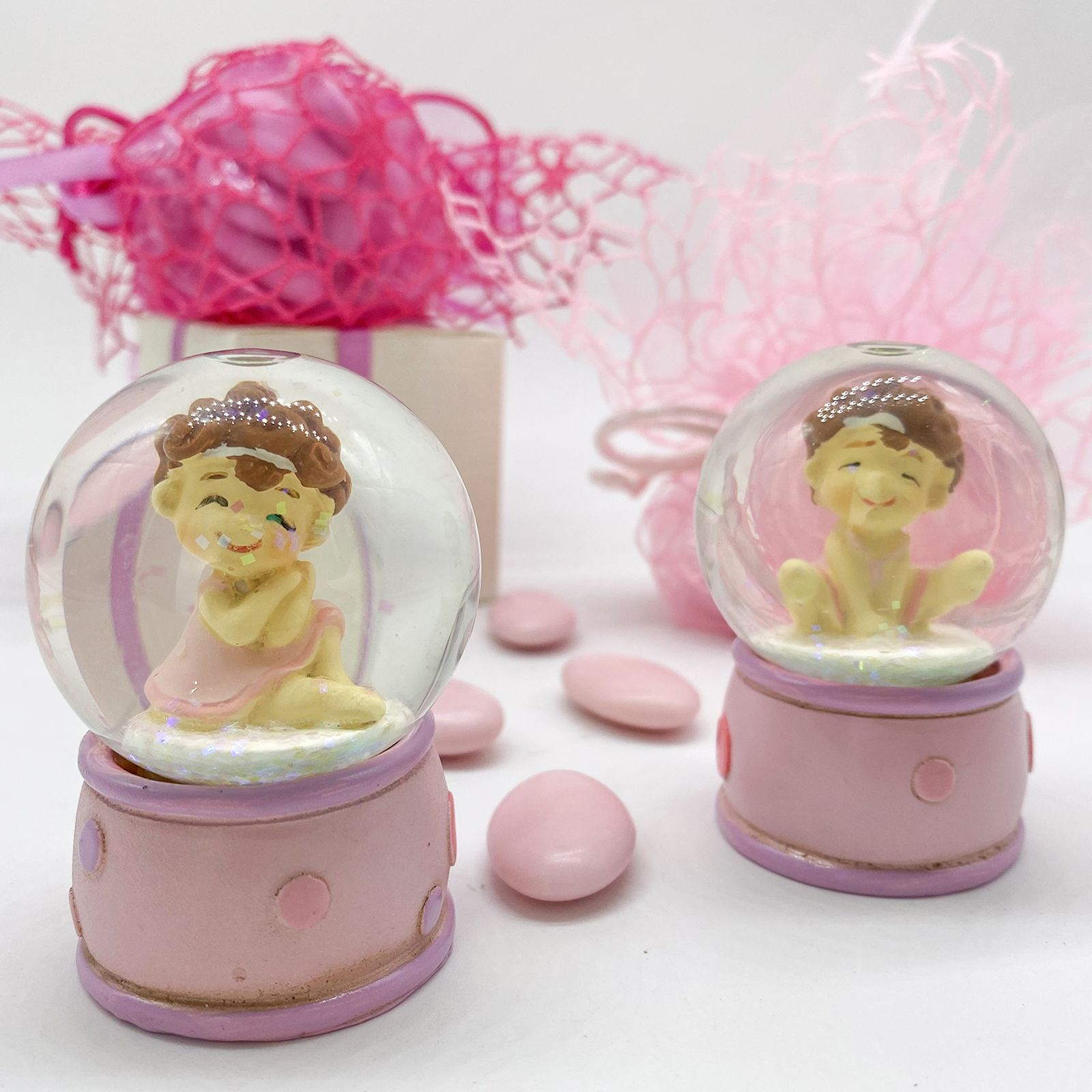 Questa bomboniera è un regalo ideale per il la nascita o il battesimo di una bambina, creando un ricordo unico e incantevole. La base della palla è decorata con un delicato motivo rosa e pois, aggiungendo un tocco di femminilità e grazia. All'interno della palla, troverai una ginnasta seduta in due pose differenti, entrambe indossando un grazioso vestitino rosa e una fascia bianca che raccoglie i suoi capelli folti, testimonianza della sua passione per la danza ritmica.